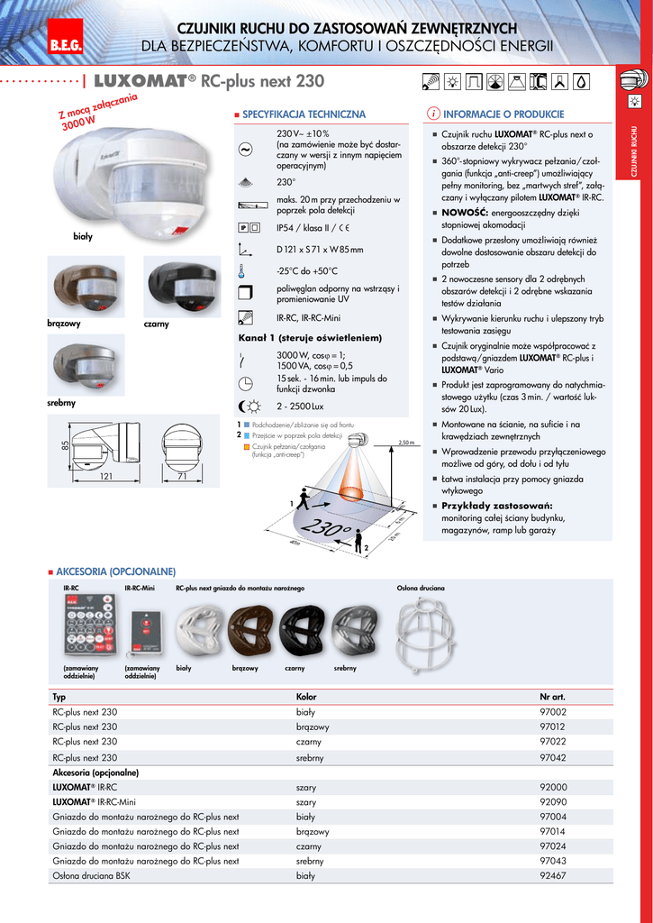 Czujniki ruchu do zastosowań zewnętrznych ® B.E.G. LUXOMAT dla bezpieczeństwa, komfortu i oszczędności energii | LUXOMAT ® RC-plus next 230 Specyfikacja techniczna Informacje o produkcie 230 V~ ±10 % (na zamówienie może być dostarczany w wersji z innym napięciem operacyjnym) 230° maks. 20 m przy przechodzeniu w poprzek pola detekcji IP54 / klasa II / biały poliwęglan odporny na wstrząsy i promieniowanie UV IR-RC, IR-RC-Mini 85 2 nowoczesne sensory dla 2 odrębnych obszarów detekcji i 2 odrębne wskazania testów działania oryginalnie może współpracować z podstawą/gniazdem LUXOMAT ® RC-plus i LUXOMAT ® Vario Produkt jest zaprogramowany do natychmiastowego użytku (czas 3 min. / wartość luksów 20 Lux). Montowane Podchodzenie/zbliżanie się od frontu Przejście w poprzek pola detekcji 2,50 m Czujnik pełzania/czołgania (funkcja „anti-creep”) 71 na ścianie, na suficie i na krawędziach zewnętrznych Wprowadzenie przewodu przyłączeniowego możliwe od góry, od dołu i od tyłu instalacja przy pomocy gniazda wtykowego m 230° Przykłady zastosowań: monitoring całej ściany budynku, magazynów, ramp lub garaży 20 40m 6m 4m Łatwa 1 energooszczędny dzięki stopniowej akomodacji Czujnik 2 - 2500 Lux 121 Nowość: kierunku ruchu i ulepszony tryb testowania zasięgu 3000 W, cosϕ = 1; 1500 VA, cosϕ = 0,5 15 sek. - 16 min. lub impuls do funkcji dzwonka 1 2 wykrywacz pełzania/czołgania (funkcja „anti-creep”) umożliwiający pełny monitoring, bez „martwych stref”, załączany i wyłączany pilotem LUXOMAT ® IR-RC. Wykrywanie Kanał 1 (steruje oświetleniem) srebrny 360°-stopniowy przesłony umożliwiają również dowolne dostosowanie obszaru detekcji do potrzeb -25°C do +50°C czarny ruchu LUXOMAT ® RC-plus next o obszarze detekcji 230° Dodatkowe D 121 x S 71 x W 85 mm brązowy Czujnik 2 Akcesoria (opcjonalne) IR-RC IR-RC-Mini RC-plus next gniazdo do montażu narożnego (zamawiany oddzielnie) (zamawiany oddzielnie) biały brązowy czarny Osłona druciana srebrny Typ Kolor Nr art. RC-plus next 230 biały 97002 RC-plus next 230 brązowy 97012 RC-plus next 230 czarny 97022 RC-plus next 230 srebrny 97042 LUXOMAT ® IR-RC szary 92000 LUXOMAT ® IR-RC-Mini szary 92090 Gniazdo do montażu narożnego do RC-plus next biały 97004 Gniazdo do montażu narożnego do RC-plus next brązowy 97014 Gniazdo do montażu narożnego do RC-plus next czarny 97024 Akcesoria (opcjonalne) Gniazdo do montażu narożnego do RC-plus next srebrny 97043 Osłona druciana BSK biały 92467 Czujniki ruchu nia ącza ł cą za Z mo W 30 0 0