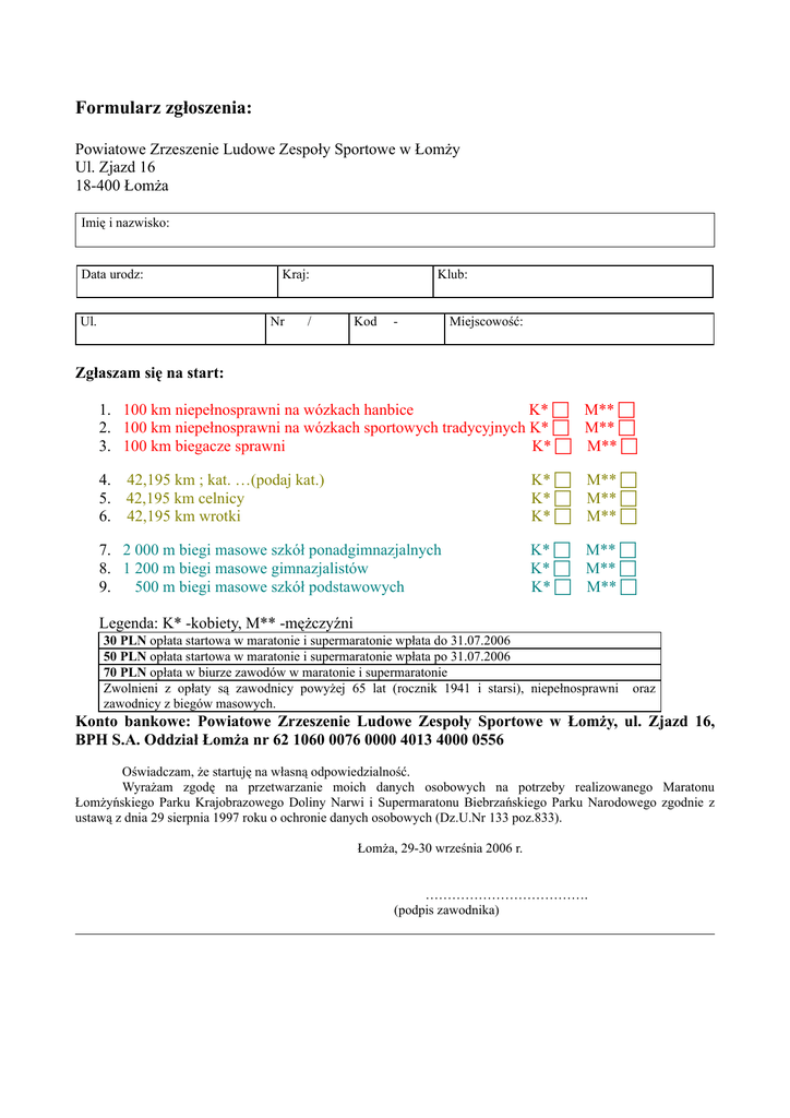 Formularz zgłoszenia: Powiatowe Zrzeszenie Ludowe Zespoły Sportowe w Łomży Ul. Zjazd 16 18-400 Łomża Imię i nazwisko: Data urodz: Ul. Kraj: Nr / Klub: Kod - Miejscowość: Zgłaszam się na start: 1. 100 km niepełnosprawni na wózkach hanbice K* M** 2. 100 km niepełnosprawni na wózkach sportowych tradycyjnych K* M** 3. 100 km biegacze sprawni K* M** 4. 42,195 km ; kat. …(podaj kat.) 5. 42,195 km celnicy 6. 42,195 km wrotki K* K* K* M** M** M** 7. 2 000 m biegi masowe szkół ponadgimnazjalnych 8. 1 200 m biegi masowe gimnazjalistów 9. 500 m biegi masowe szkół podstawowych K* M** K* M** K* M** Legenda: K* -kobiety, M** -mężczyźni 30 PLN opłata startowa w maratonie i supermaratonie wpłata do 31.07.2006 50 PLN opłata startowa w maratonie i supermaratonie wpłata po 31.07.2006 70 PLN opłata w biurze zawodów w maratonie i supermaratonie Zwolnieni z opłaty są zawodnicy powyżej 65 lat (rocznik 1941 i starsi), niepełnosprawni zawodnicy z biegów masowych. oraz Konto bankowe: Powiatowe Zrzeszenie Ludowe Zespoły Sportowe w Łomży, ul. Zjazd 16, BPH S.A. Oddział Łomża nr 62 1060 0076 0000 4013 4000 0556 Oświadczam, że startuję na własną odpowiedzialność. Wyrażam zgodę na przetwarzanie moich danych osobowych na potrzeby realizowanego Maratonu Łomżyńskiego Parku Krajobrazowego Doliny Narwi i Supermaratonu Biebrzańskiego Parku Narodowego zgodnie z ustawą z dnia 29 sierpnia 1997 roku o ochronie danych osobowych (Dz.U.Nr 133 poz.833). Łomża, 29-30 września 2006 r. ………………………………. (podpis zawodnika)