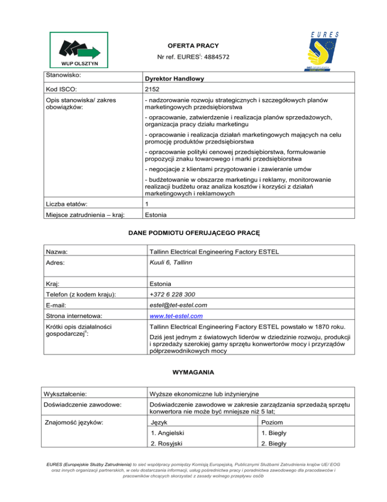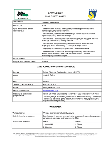 OFERTA PRACY i Nr ref. EURES : 4884572 Stanowisko: Dyrektor Handlowy Kod ISCO: 2152 Opis stanowiska/ zakres obowiązków: - nadzorowanie rozwoju strategicznych i szczegółowych planów marketingowych przedsiębiorstwa - opracowanie, zatwierdzenie i realizacja planów sprzedażowych, organizacja pracy działu marketingu - opracowanie i realizacja działań marketingowych mających na celu promocję produktów przedsiębiorstwa - opracowanie polityki cenowej przedsiębiorstwa, formułowanie propozycji znaku towarowego i marki przedsiębiorstwa - negocjacje z klientami przygotowanie i zawieranie umów - budżetowanie w obszarze marketingu i reklamy, monitorowanie realizacji budżetu oraz analiza kosztów i korzyści z działań marketingowych i reklamowych Liczba etatów: 1 Miejsce zatrudnienia – kraj: Estonia DANE PODMIOTU OFERUJĄCEGO PRACĘ Nazwa: Tallinn Electrical Engineering Factory ESTEL Adres: Kuuli 6, Tallinn Kraj: Estonia Telefon (z kodem kraju): +372 6 228 300 E-mail: [email protected] Strona internetowa: www.tet-estel.com Krótki opis działalności ii gospodarczej : Tallinn Electrical Engineering Factory ESTEL powstało w 1870 roku. Dziś jest jednym z światowych liderów w dziedzinie rozwoju, produkcji i sprzedaży szerokiej gamy sprzętu konwertorów mocy i przyrządów półprzewodnikowych mocy WYMAGANIA Wykształcenie: Wyższe ekonomiczne lub inżynieryjne Doświadczenie zawodowe: Doświadczenie zawodowe w zakresie zarządzania sprzedażą sprzętu konwertora nie może być mniejsze niż 5 lat; Znajomość języków: Język Poziom 1. Angielski 1. Biegły 2. Rosyjski 2. Biegły EURES (Europejskie Służby Zatrudnienia) to sieć współpracy pomiędzy Komisją Europejską, Publicznymi Służbami Zatrudnienia krajów UE/ EOG oraz innych organizacji partnerskich, w celu dostarczania informacji, usług pośrednictwa pracy i poradnictwa zawodowego dla pracodawców i pracowników chcących skorzystać z zasady wolnego przepływu osób Inne istotne wymagania: Planowanie, budżetowanie i umiejętności zarządzania projektem Biegła obsługa komputera: MS Office aplikacje standardowe (Access, Outlook, Explorer, itp.); Umiejętności społeczne, komunikacji biznesowej i umiejętności negocjacyjne; Umiejętności podejmowania decyzji; Mobilność i gotowość do podróży służbowych; WYNAGRODZENIE I WARUNKI ZATRUDNIENIA Wysokość pensji brutto: 2500 euro/miesięcznie Dodatkowe świadczenia Zakwaterowanie zapewnione Nazwa firmy, z którą zostanie podpisana umowa: Tallinn Electrical Engineering Factory ESTEL SPOSÓB SKŁADANIA WNIOSKU Gdzie należy wysłać dokumenty: (adres, adres e-mail, nr faksu z kodem kraju itp.) CV z krótkim listem motywacyjnym na adres: [email protected] DW: [email protected] WAŻNOŚĆ Data publikacji: 18.04.2014 Termin przedkładania podań o pracę / zakończenia ważności oferty: 01.06.2014 Uprzejmie informujemy, że skontaktujemy się wyłącznie z wybranymi kandydatami. UWAGA: 1. Umowa z zagranicznym pracodawcą zostanie zawarta zgodnie z prawem kraju zatrudnienia. Oznacza to, że wszystkie roszczenia odnośnie do warunków, które obejmuje umowa, można kierować wyłącznie do odpowiedniego sądu w kraju zatrudnienia. Publiczne służby zatrudnienia (EURES) nie mogą pośredniczyć ani reprezentować pracownika w sądzie kraju zatrudnienia w przypadku sporu z pracodawcą. 2. Publiczne służby zatrudnienia (EURES) dokładają wszelkich starań, aby zapewnić rzetelność i wiarygodność ofert pracy zgłoszonych w lokalnym urzędzie pracy. Należy wyjaśnić, że oferta pracy została zgłoszona przez stronę trzecią i EURES nie odpowiada za ewentualne rozbieżności między warunkami pracy określonymi w ofercie pracy i warunkami oferowanymi przez potencjalnego pracodawcę. 3. Publiczne służby zatrudnienia (EURES) informują, że będą zbierać, przetwarzać i przekazywać potencjalnym pracodawcom zgodnie z przepisami dotyczącymi ochrony danych osobowych wszystkie dane osobowe dostarczone przez osoby poszukujące pracy. i Nr ref. na portalu EURES www.eures.europa.eu . Dotyczy ofert pracy publicznych służb zatrudnienia, których bazy danych ofert pracy nie są połączone z portalem EURES. ii Informacje o firmie, takie jak: status prawny, sektor, typ działalności, rodzaj produktów lub świadczonych usług, data rozpoczęcia działalności gospodarczej, liczba pracowników itp. EURES (Europejskie Służby Zatrudnienia) to sieć współpracy pomiędzy Komisją Europejską, Publicznymi Służbami Zatrudnienia krajów UE/ EOG oraz innych organizacji partnerskich, w celu dostarczania informacji, usług pośrednictwa pracy i poradnictwa zawodowego dla pracodawców i pracowników chcących skorzystać z zasady wolnego przepływu osób