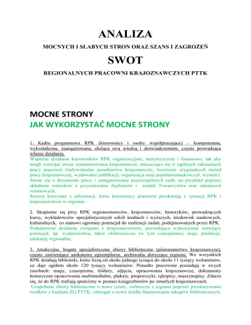 ANALIZA MOCNYCH I SŁABYCH STRON ORAZ SZANS I ZAGROśEŃ SWOT REGIONALNYCH PRACOWNI KRAJOZNAWCZYCH PTTK MOCNE STRONY JAK WYKORZYSTAĆ MOCNE STRONY 1. Kadra programowa RPK (kierownicy i osoby współpracujące) – kompetentna, wykształcona, zaangaŜowana, słuŜąca swą wiedzą i doświadczeniem, często prowadząca własne działania. Wspierać działania kierowników RPK organizacyjnie, merytorycznie i finansowo, tak aby mogli rozwijać swoje zainteresowania krajoznawcze, mieszczące się w ogólnych załoŜeniach pracy pracowni (indywidualne poradnictwo krajoznawcze, tworzenie oryginalnych metod pracy krajoznawczej, wydawanie publikacji, organizacja sesji popularnonaukowych, wystaw). Starać się o docenienie pracy i zaangaŜowania poszczególnych osób, na przykład poprzez składanie wniosków o przyznawanie dyplomów i medali Towarzystwa oraz odznaczeń resortowych. Szerzej korzystać z informacji, które kierownicy pracowni przekazują o sytuacji RPK i krajoznawstwie w regionie. 2. Skupianie się przy RPK regionoznawców, krajoznawców, historyków, prowadzących kursy, wykładowców specjalistycznych szkół średnich i wyŜszych, środowisk naukowych, kulturalnych, co stanowi ogromny potencjał do realizacji zadań, podejmowanych przez RPK. Podejmować działania związane z krajoznawstwem, pozwalające wykorzystać istniejący potencjał, np. wydawnictwa, takŜe elektroniczne (w tym czasopisma), sesje, prelekcje, edukację regionalną. 3. Atrakcyjne, bogate specjalistyczne zbiory biblioteczne (piśmiennictwo krajoznawcze), często zawierające unikatowe egzemplarze, archiwalia dotyczące regionu. We wszystkich RPK działają biblioteki, które liczą od około jednego tysiąca do około 11 tysięcy woluminów, co daje ogółem około 120 tysięcy woluminów. Ponadto pracownie posiadają w swych zasobach: mapy, czasopisma, foldery, zdjęcia, opracowania krajoznawcze, dokumenty historyczne opracowania multimedialne, plakaty, proporczyki, rękopisy, maszynopisy. Zdarza się, Ŝe do RPK trafiają spuścizny w postaci księgozbiorów po zmarłych krajoznawcach. Uzupełniać zbiory biblioteczne o nowe tytuły, zwłaszcza z regionu poprzez przekazywanie środków z budŜetu ZG PTTK; zabiegać o nowe źródła finansowania zakupów bibliotecznych, np. poprzez pisanie projektów przez pojedyncze RPK, wspólnie przez część pracowni; nieodpłatne uzyskiwanie publikacji; wymianę posiadanych dubletów i zbędnych pozycji. Dbać o dotychczas zgromadzone zbiory, przechowując je w odpowiednich warunkach, oprawiać, digitalizować. Upowszechniać informację o zbiorach. Zwiększać dostęp do zbiorów, np. poprzez Internet. Organizować spotkania z autorami ksiąŜek krajoznawczych. W oparciu o zbiory urządzać wystawy, np.: tematyczne, aktualności, archiwalne. 4. Komputeryzacja zbiorów bibliotecznych RPK, poprzez wykonanie do końca 2012 roku ponad 20 tysięcy rekordów, czyli około 17 proc. zbiorów RPK ogółem w oparciu o jednolity system ProgMan i systematyczne zamieszczanie na internetowej stronie www.pracowniapttk.pl, i tym samym zwiększenie dostępu do księgozbiorów poszczególnych RPK. Kontynuować prace związane z budową jednolitego systemu komputerowego RPK. DąŜyć do szerokiej promocji katalogu komputerowego wśród obecnych i potencjalnych czytelników, zarówno w regionie, jak i w Polsce. 5. Zbudowanie internetowej strony www.pracowniapttk.pl, która zawiera podstawowe informacje o pracowniach oraz na której systematycznie zamieszczane są komputerowe katalogi biblioteczne, historia pracowni (takŜe juŜ nieistniejących). Promować zbudowaną stronę oraz poszerzać ją o nowe elementy i informacje. 6. Jedność regionalnych pracowni krajoznawczych w grupie dyskusyjnej Google: [email protected], stwarzająca moŜliwość szybkiego przekazywania informacji, komunikatów, materiałów oraz wymiany opinii. Wykorzystywać w bieŜącej współpracy i promocji RPK (np. newslettery) istniejącą sieć komunikacji. 7. WyposaŜenie RPK w podstawowy, niezbędny do działalności, sprzęt komputerowy oraz w sprzęt audiowizualny, niezbędny do prowadzenia zajęć Wykorzystywać sprzęt nie tylko do bieŜącej działalności, ale przede wszystkim do cyfryzacji zbiorów, promocji zbiorów i działalności RPK w Internecie, a takŜe do podejmowania róŜnego rodzaju działań związanych z krajoznawstwem. 8. Współpraca z Centralną Biblioteką PTTK, stwarzająca róŜne moŜliwości: katalogi komputerowe budowane są w oparciu o jednolity program, co w przyszłości stwarza moŜliwość zbudowania i wypromowania jednej biblioteki cyfrowej Towarzystwa; wspólne prowadzenie strony internetowej www.pracowniapttk.pl. Kontynuować i rozwijać współpracę z Centralną Biblioteką PTTK. 9. Cykliczne organizowanie szkolenie kierowników RPK. Kontynuować szkolenia i dostosowywać ich tematykę do aktualnych potrzeb w tym zakresie. Kierownicy RPK powinni więcej angaŜować się podczas dorocznych spotkaniach szkoleniowych (udział w dyskusjach, zgłaszanie wniosków, efektywna praca podczas warsztatów), aby wynieść z tego jak najwięcej konkretnej uŜytecznej wiedzy. 10. Działanie RPK w sieci (PTTK): w Polsce działają 24 regionalne pracownie krajoznawcze, umieszczone (prawie) równomiernie w róŜnych miastach w Polsce. Tworzą sieć placówek o jednakowych podstawach programowych i szerokich moŜliwościach działania, w zaleŜności od uwarunkowań regionalnych, promując PTTK jako organizację o zasięgu ogólnopolskim. Wesprzeć działalność RPK organizacyjnie, merytorycznie i finansowo, stwarzając sieć silnych placówek krajoznawczych PTTK. Podejmować działania, mające duŜe szanse powodzenia w sieci placówek: duŜe projekty pozwalające na pozyskanie funduszy na działalność, ze zwróceniem uwagi na projekty realizowane kaŜdego roku przez ZG PTTK. 11. Wieloletnie doświadczenie w popularyzowaniu krajoznawstwa w Polsce, rozpoznawalna marka PTTK. Wspierać d