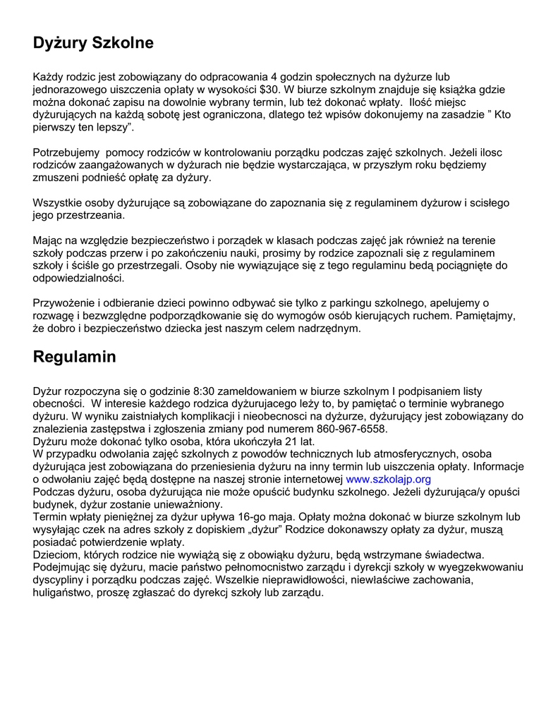 Dyżury Szkolne Każdy rodzic jest zobowiązany do odpracowania 4 godzin społecznych na dyżurze lub jednorazowego uiszczenia opłaty w wysokości $30. W biurze szkolnym znajduje się książka gdzie można dokonać zapisu na dowolnie wybrany termin, lub też dokonać wpłaty. Ilość miejsc dyżurujących na każdą sobotę jest ograniczona, dlatego też wpisów dokonujemy na zasadzie ” Kto pierwszy ten lepszy”. Potrzebujemy pomocy rodziców w kontrolowaniu porządku podczas zajęć szkolnych. Jeżeli ilosc rodziców zaangażowanych w dyżurach nie będzie wystarczająca, w przyszłym roku będziemy zmuszeni podnieść opłatę za dyżury. Wszystkie osoby dyżurujące są zobowiązane do zapoznania się z regulaminem dyżurow i scisłego jego przestrzeania. Mając na względzie bezpieczeństwo i porządek w klasach podczas zajęć jak również na terenie szkoły podczas przerw i po zakończeniu nauki, prosimy by rodzice zapoznali się z regulaminem szkoły i ściśle go przestrzegali. Osoby nie wywiązujące się z tego regulaminu bedą pociągnięte do odpowiedzialności. Przywożenie i odbieranie dzieci powinno odbywać sie tylko z parkingu szkolnego, apelujemy o rozwagę i bezwzględne podporządkowanie się do wymogów osób kierujących ruchem. Pamiętajmy, że dobro i bezpieczeństwo dziecka jest naszym celem nadrzędnym. Regulamin Dyżur rozpoczyna się o godzinie 8:30 zameldowaniem w biurze szkolnym I podpisaniem listy obecności. W interesie każdego rodzica dyżurujacego leży to, by pamiętać o terminie wybranego dyżuru. W wyniku zaistniałych komplikacji i nieobecnosci na dyżurze, dyżurujący jest zobowiązany do znalezienia zastępstwa i zgłoszenia zmiany pod numerem 860-967-6558. Dyżuru może dokonać tylko osoba, która ukończyła 21 lat. W przypadku odwołania zajęć szkolnych z powodów technicznych lub atmosferycznych, osoba dyżurująca jest zobowiązana do przeniesienia dyżuru na inny termin lub uiszczenia opłaty. Informacje o odwołaniu zajęć będą dostępne na naszej stronie internetowej www.szkolajp.org Podczas dyżuru, osoba dyżurująca nie może opuścić budynku szkolnego. Jeżeli dyżurująca/y opuści budynek, dyżur zostanie unieważniony. Termin wpłaty pieniężnej za dyżur upływa 16-go maja. Opłaty można dokonać w biurze szkolnym lub wysyłając czek na adres szkoły z dopiskiem „dyżur” Rodzice dokonawszy opłaty za dyżur, muszą posiadać potwierdzenie wpłaty. Dzieciom, których rodzice nie wywiążą się z obowiąku dyżuru, będą wstrzymane świadectwa. Podejmując się dyżuru, macie państwo pełnomocnistwo zarządu i dyrekcji szkoły w wyegzekwowaniu dyscypliny i porządku podczas zajęć. Wszelkie nieprawidłowości, niewłaściwe zachowania, huligaństwo, proszę zgłaszać do dyrekcj szkoły lub zarządu. Zasady Dyżuru • Dyżur rozpoczyna się punktualnie o 8:15. • Dyżurujący jest zobowiazany do przestrzegania porządku i zasad bezpieczeństwa w wyznaczonej strefie. • Prosimy o doplinowanie by przed rozpoczęciem zajęć dzieci nie biegały po korytarzach i klatkach schodowych. • Kategorycznie zabronione jest spacerowanie uczniów podczas zajęć lekcyjnych. Każde opuszczenie klasy przez ucznia musi być pisemnie potwierdzone zgodą nauczyciela na specjalnie przygotowanych drukach. • Proszę zwracać uwagę na ubiór i obuwie dzieci. Niedopuszczalne są do użytku w szkole buty z kółkami, deskorolki, lub inne obuwie stwarzające zagrożenie w bezpiecznym poruszaniu się po szkole. • Proszę zwracać uwagę na uczniów wychodzących do łazienki aby do niej dotarli i z niej powrócili. Zabronione jest gromadzenie się w łazienkach pod żadnym pozorem. • Zabrania się zaśmiecania lub rozlewania napojów w klasach, jak również na korytarzach. • W przypadku opuszczenia klasy przez uczniów i nauczyciela, proszę zwracać uwagę by wszyscy uczniowie opuścili klasę udając się na przerwę. • Szczególną uwagę proszę zwracać na mienie szkoły, tj. komputery, pomoce naukowe, wystrój klas, dekoracje, by nie były niszczone przez naszych uczniów. • W przypadku opuszczenia klasy przez nauczyciela, proszę o podejście do klasy i monitorowanie porządku w klasie. • Ubikacje podczas przerw powinny być kontrolowane i monitorowane gdyż są one największą pokusą do zbiorowisk i rozróby. W chwili podejrzenia lub zauważenia nieprawidłowości w zachowaniu uczniów proszę niezwłocznie powiadomić stałych dyżurujących, zarząd, lub dyrekcję szkoły. • Wcześniejsze odbieranie dzieci ze szkoły powinno sie odbywać przez rodzica lub opiekuna bezpośrednio z klasy, za pokwitowaniem wystawionym w biurze szkolnym. Zadaniem osoby dyżurującej jest sprawdzenie posiadania takiego pokwitowania, pokierowania rodzica do kancelarii szkolnej w przypadku braku pokwitowania, jak również dopilnowanie by dzieci samowolnie nie opuszczały zajęć, oczekując na rodziców w korytarzu lub przed szkołą. • • Dyżur kończy się o 12:45, z chwilą gdy nauczyciele sprowadzą klasy do rozesłania