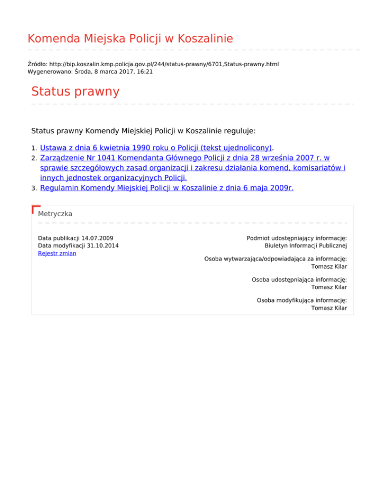 Status prawny - Komenda Miejska Policji w Koszalinie