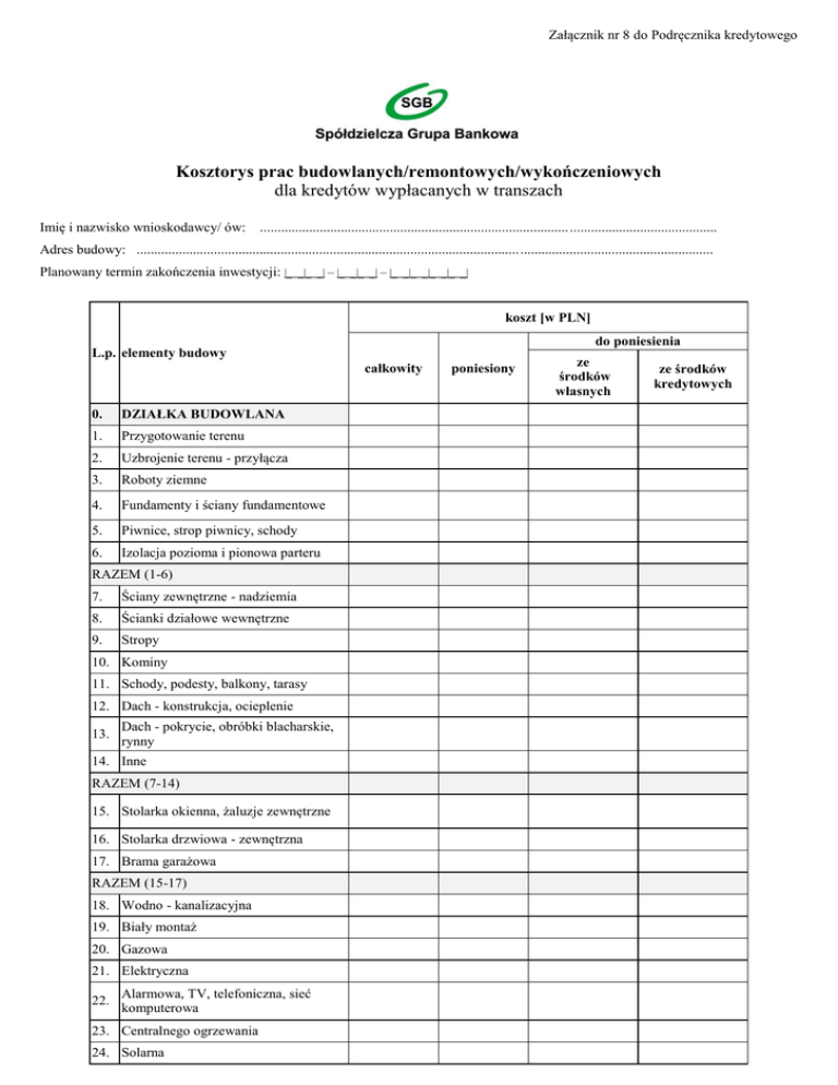 Załącznik nr 8 do Podręcznika kredytowego Kosztorys prac budowlanych/remontowych/wykończeniowych dla kredytów wypłacanych w transzach Imię i nazwisko wnioskodawcy/ ów: .................................................................................................................................. Adres budowy: .................................................................................................................................................................... Planowany termin zakończenia inwestycji: |_ _|_ _| – |_ _|_ _| – |_ _|_ _|_ _|_ _| koszt [w PLN] do poniesienia L.p. elementy budowy całkowity 0. DZIAŁKA BUDOWLANA 1. Przygotowanie terenu 2. Uzbrojenie terenu - przyłącza 3. Roboty ziemne 4. Fundamenty i ściany fundamentowe 5. Piwnice, strop piwnicy, schody 6. Izolacja pozioma i pionowa parteru RAZEM (1-6) 7. Ściany zewnętrzne - nadziemia 8. Ścianki działowe wewnętrzne 9. Stropy 10. Kominy 11. Schody, podesty, balkony, tarasy 12. Dach - konstrukcja, ocieplenie 13. Dach - pokrycie, obróbki blacharskie, rynny 14. Inne RAZEM (7-14) 15. Stolarka okienna, żaluzje zewnętrzne 16. Stolarka drzwiowa - zewnętrzna 17. Brama garażowa RAZEM (15-17) 18. Wodno - kanalizacyjna 19. Biały montaż 20. Gazowa 21. Elektryczna 22. Alarmowa, TV, telefoniczna, sieć komputerowa 23. Centralnego ogrzewania 24. Solarna poniesiony ze środków własnych ze środków kredytowych 25. Wentylacyjna - rekuperator 26. Przyłącze wodociągowe / własne ujęcie Przyłącze kanalizacyjne / szambo 27. ekologiczne / przydomowa oczyszczalnia ścieków Przyłącze gazowe/ zbiornik gazu/ 28. zbiornik olejowy 29. Przyłącze elektryczne 30. Przyłącze cieplne 31. Inne 32. Kominek 33. Tynki wewnętrzne 34. Posadzki i wylewki 35. Okładziny ścienne, podłogowe 36. Roboty malarskie 37. Stolarka drzwiowa - wewnętrzna Stolarka wewnętrzna, schody, 38. balustrady 39. Ocieplenie budynku 40. Tynki zewnętrzne 41. Inne 42. Zagospodarowanie ogrodu 43. Ogrodzenie 44. Chodniki, podjazd 45. Inne RAZEM (18-45) Ogółem koszt budowy Zestawienie sporządzono wg aktualnego poziomu cen. ................................... data ............................................. podpis wnioskodawcy/ów ………………………………….…….. pieczęć i podpis kierownika budowy 2/2