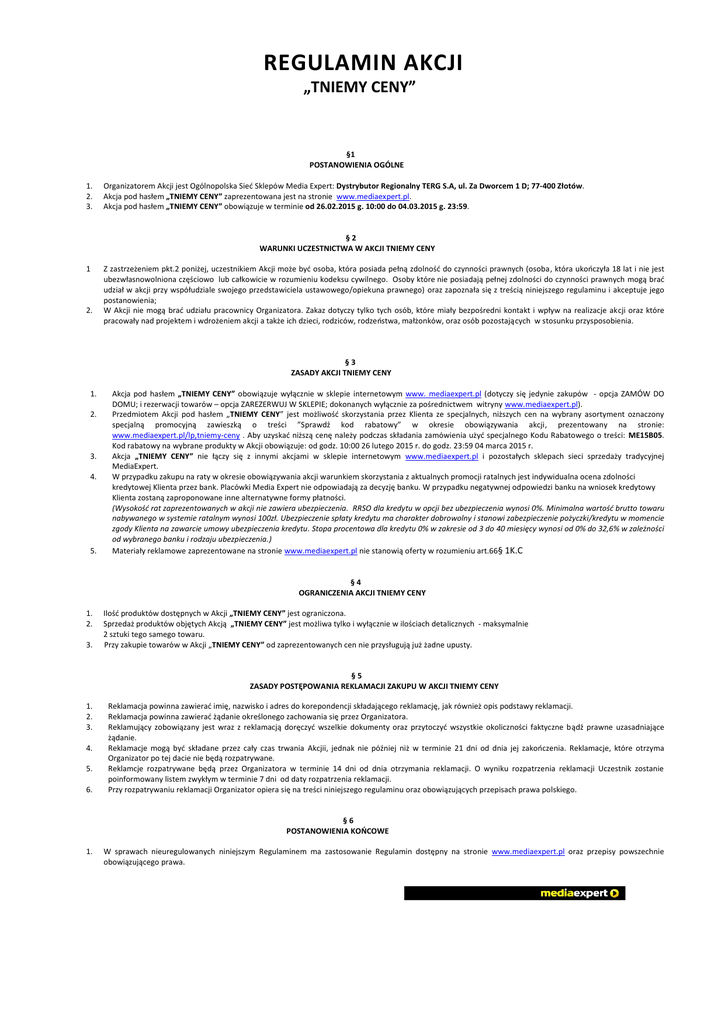 REGULAMIN AKCJI „TNIEMY CENY” §1 POSTANOWIENIA OGÓLNE 1. 2. 3. Organizatorem Akcji jest Ogólnopolska Sieć Sklepów Media Expert: Dystrybutor Regionalny TERG S.A, ul. Za Dworcem 1 D; 77-400 Złotów. Akcja pod hasłem „TNIEMY CENY” zaprezentowana jest na stronie www.mediaexpert.pl. Akcja pod hasłem „TNIEMY CENY” obowiązuje w terminie od 26.02.2015 g. 10:00 do 04.03.2015 g. 23:59. §2 WARUNKI UCZESTNICTWA W AKCJI TNIEMY CENY 1 2. Z zastrzeżeniem pkt.2 poniżej, uczestnikiem Akcji może być osoba, która posiada pełną zdolność do czynności prawnych (osoba, która ukończyła 18 lat i nie jest ubezwłasnowolniona częściowo lub całkowicie w rozumieniu kodeksu cywilnego. Osoby które nie posiadają pełnej zdolności do czynności prawnych mogą brać udział w akcji przy współudziale swojego przedstawiciela ustawowego/opiekuna prawnego) oraz zapoznała się z treścią niniejszego regulaminu i akceptuje jego postanowienia; W Akcji nie mogą brać udziału pracownicy Organizatora. Zakaz dotyczy tylko tych osób, które miały bezpośredni kontakt i wpływ na realizacje akcji oraz które pracowały nad projektem i wdrożeniem akcji a także ich dzieci, rodziców, rodzeństwa, małżonków, oraz osób pozostających w stosunku przysposobienia. §3 ZASADY AKCJI TNIEMY CENY 1. 2. 3. 4. 5. Akcja pod hasłem „TNIEMY CENY” obowiązuje wyłącznie w sklepie internetowym www. mediaexpert.pl (dotyczy się jedynie zakupów - opcja ZAMÓW DO DOMU; i rezerwacji towarów – opcja ZAREZERWUJ W SKLEPIE; dokonanych wyłącznie za pośrednictwem witryny www.mediaexpert.pl). Przedmiotem Akcji pod hasłem „TNIEMY CENY” jest możliwość skorzystania przez Klienta ze specjalnych, niższych cen na wybrany asortyment oznaczony specjalną promocyjną zawieszką o treści ”Sprawdź kod rabatowy” w okresie obowiązywania akcji, prezentowany na stronie: www.mediaexpert.pl/lp,tniemy-ceny . Aby uzyskać niższą cenę należy podczas składania zamówienia użyć specjalnego Kodu Rabatowego o treści: ME15B05. Kod rabatowy na wybrane produkty w Akcji obowiązuje: od godz. 10:00 26 lutego 2015 r. do godz. 23:59 04 marca 2015 r. Akcja „TNIEMY CENY” nie łączy się z innymi akcjami w sklepie internetowym www.mediaexpert.pl i pozostałych sklepach sieci sprzedaży tradycyjnej MediaExpert. W przypadku zakupu na raty w okresie obowiązywania akcji warunkiem skorzystania z aktualnych promocji ratalnych jest indywidualna ocena zdolności kredytowej Klienta przez bank. Placówki Media Expert nie odpowiadają za decyzję banku. W przypadku negatywnej odpowiedzi banku na wniosek kredytowy Klienta zostaną zaproponowane inne alternatywne formy płatności. (Wysokość rat zaprezentowanych w akcji nie zawiera ubezpieczenia. RRSO dla kredytu w opcji bez ubezpieczenia wynosi 0%. Minimalna wartość brutto towaru nabywanego w systemie ratalnym wynosi 100zł. Ubezpieczenie spłaty kredytu ma charakter dobrowolny i stanowi zabezpieczenie pożyczki/kredytu w momencie zgody Klienta na zawarcie umowy ubezpieczenia kredytu. Stopa procentowa dla kredytu 0% w zakresie od 3 do 40 miesięcy wynosi od 0% do 32,6% w zależności od wybranego banku i rodzaju ubezpieczenia.) Materiały reklamowe zaprezentowane na stronie www.mediaexpert.pl nie stanowią oferty w rozumieniu art.66§ 1K.C §4 OGRANICZENIA AKCJI TNIEMY CENY 1. 2. 3. Ilość produktów dostępnych w Akcji „TNIEMY CENY” jest ograniczona. Sprzedaż produktów objętych Akcją „TNIEMY CENY” jest możliwa tylko i wyłącznie w ilościach detalicznych - maksymalnie 2 sztuki tego samego towaru. Przy zakupie towarów w Akcji „TNIEMY CENY” od zaprezentowanych cen nie przysługują już żadne upusty. §5 ZASADY POSTĘPOWANIA REKLAMACJI ZAKUPU W AKCJI TNIEMY CENY 1. 2. 3. 4. 5. 6. Reklamacja powinna zawierać imię, nazwisko i adres do korepondencji składającego reklamację, jak również opis podstawy reklamacji. Reklamacja powinna zawierać żądanie określonego zachowania się przez Organizatora. Reklamujący zobowiązany jest wraz z reklamacją doręczyć wszelkie dokumenty oraz przytoczyć wszystkie okoliczności faktyczne bądź prawne uzasadniające żądanie. Reklamacje mogą być składane przez cały czas trwania Akcjii, jednak nie później niż w terminie 21 dni od dnia jej zakończenia. Reklamacje, które otrzyma Organizator po tej dacie nie będą rozpatrywane. Reklamcje rozpatrywane będą przez Organizatora w terminie 14 dni od dnia otrzymania reklamacji. O wyniku rozpatrzenia reklamacji Uczestnik zostanie poinformowany listem zwykłym w terminie 7 dni od daty rozpatrzenia reklamacji. Przy rozpatrywaniu reklamacji Organizator opiera się na treści niniejszego regulaminu oraz obowiązujących przepisach prawa polskiego. §6 POSTANOWIENIA KOŃCOWE 1. W sprawach nieuregulowanych niniejszym Regulaminem ma zastosowanie Regulamin dostępny na stronie www.mediaexpert.pl oraz przepisy powszechnie obowiązującego prawa.