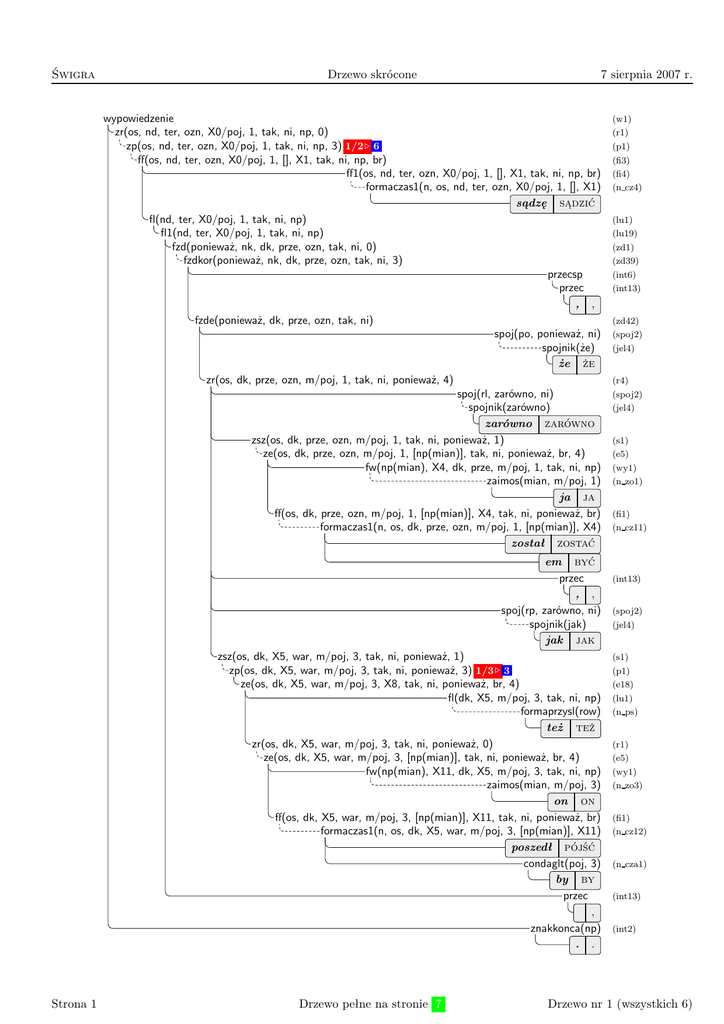 Świgra Drzewo skrócone 7 sierpnia 2007 r. wypowiedzenie zr(os, nd, ter, ozn, X0/poj, 1, tak, ni, np, 0) zp(os, nd, ter, ozn, X0/poj, 1, tak, ni, np, 3) 1/2 ⊲ 6 ff(os, nd, ter, ozn, X0/poj, 1, [], X1, tak, ni, np, br) ff1(os, nd, ter, ozn, X0/poj, 1, [], X1, tak, ni, np, br) formaczas1(n, os, nd, ter, ozn, X0/poj, 1, [], X1) sądzę sądzić fl(nd, ter, X0/poj, 1, tak, ni, np) fl1(nd, ter, X0/poj, 1, tak, ni, np) fzd(ponieważ, nk, dk, prze, ozn, tak, ni, 0) fzdkor(ponieważ, nk, dk, prze, ozn, tak, ni, 3) przecsp przec , , fzde(ponieważ, dk, prze, ozn, tak, ni) spoj(po, ponieważ, ni) spojnik(że) że że zr(os, dk, prze, ozn, m/poj, 1, tak, ni, ponieważ, 4) spoj(rl, zarówno, ni) spojnik(zarówno) zarówno zarówno zsz(os, dk, prze, ozn, m/poj, 1, tak, ni, ponieważ, 1) ze(os, dk, prze, ozn, m/poj, 1, [np(mian)], tak, ni, ponieważ, br, 4) fw(np(mian), X4, dk, prze, m/poj, 1, tak, ni, np) zaimos(mian, m/poj, 1) ja ja ff(os, dk, prze, ozn, m/poj, 1, [np(mian)], X4, tak, ni, ponieważ, br) formaczas1(n, os, dk, prze, ozn, m/poj, 1, [np(mian)], X4) został zostać (w1) (r1) (p1) (fi3) (fi4) (n cz4) (lu1) (lu19) (zd1) (zd39) (int6) (int13) (zd42) (spoj2) (jel4) (r4) (spoj2) (jel4) (s1) (e5) (wy1) (n zo1) (fi1) (n cz11) em być przec (int13) , , spoj(rp, zarówno, ni) (spoj2) spojnik(jak) (jel4) jak jak zsz(os, dk, X5, war, m/poj, 3, tak, ni, ponieważ, 1) zp(os, dk, X5, war, m/poj, 3, tak, ni, ponieważ, 3) 1/3 ⊲ 3 ze(os, dk, X5, war, m/poj, 3, X8, tak, ni, ponieważ, br, 4) fl(dk, X5, m/poj, 3, tak, ni, np) formaprzysl(row) też też zr(os, dk, X5, war, m/poj, 3, tak, ni, ponieważ, 0) ze(os, dk, X5, war, m/poj, 3, [np(mian)], tak, ni, ponieważ, br, 4) fw(np(mian), X11, dk, X5, m/poj, 3, tak, ni, np) zaimos(mian, m/poj, 3) on on ff(os, dk, X5, war, m/poj, 3, [np(mian)], X11, tak, ni, ponieważ, br) formaczas1(n, os, dk, X5, war, m/poj, 3, [np(mian)], X11) poszedł pójść condaglt(poj, 3) by by przec , znakkonca(np) . . Strona 1 Drzewo pełne na stronie 7 (s1) (p1) (e18) (lu1) (n ps) (r1) (e5) (wy1) (n zo3) (fi1) (n cz12) (n cza1) (int13) (int2) Drzewo nr 1 (wszystkich 6) Świgra Drzewo skrócone 7 sierpnia 2007 r. wypowiedzenie zr(os, nd, ter, ozn, X0/poj, 1, tak, ni, np, 0) zp(os, nd, ter, ozn, X0/poj, 1, tak, ni, np, 3) 1/2 ⊲ 6 ff(os, nd, ter, ozn, X0/poj, 1, [], X1, tak, ni, np, br) ff1(os, nd, ter, ozn, X0/poj, 1, [], X1, tak, ni, np, br) formaczas1(n, os, nd, ter, ozn, X0/poj, 1, [], X1) sądzę sądzić fl(nd, ter, X0/poj, 1, tak, ni, np) fl1(nd, ter, X0/poj, 1, tak, ni, np) fzd(ponieważ, nk, dk, prze, ozn, tak, ni, 0) fzdkor(ponieważ, nk, dk, prze, ozn, tak, ni, 3) przecsp przec , , fzde(ponieważ, dk, prze, ozn, tak, ni) spoj(po, ponieważ, ni) spojnik(że) że że zr(os, dk, prze, ozn, m/poj, 1, tak, ni, ponieważ, 4) spoj(rl, zarówno, ni) spojnik(zarówno) zarówno zarówno zsz(os, dk, prze, ozn, m/poj, 1, tak, ni, ponieważ, 1) ze(os, dk, prze, ozn, m/poj, 1, [np(mian)], tak, ni, ponieważ, br, 4) fw(np(mian), X4, dk, prze, m/poj, 1, tak, ni, np) zaimos(mian, m/poj, 1) ja ja ff(os, dk, prze, ozn, m/poj, 1, [np(mian)], X4, tak, ni, ponieważ, br) formaczas1(n, os, dk, prze, ozn, m/poj, 1, [np(mian)], X4) został zostać (w1) (r1) (p1) (fi3) (fi4) (n cz4) (lu1) (lu19) (zd1) (zd39) (int6) (int13) (zd42) (spoj2) (jel4) (r4) (spoj2) (jel4) (s1) (e5) (wy1) (n zo1) (fi1) (n cz11) em być przec (int13) , , spoj(rp, zarówno, ni) (spoj2) spojnik(jak) (jel4) jak jak zsz(os, dk, X5, war, m/poj, 3, tak, ni, ponieważ, 1) zp(os, dk, X5, war, m/poj, 3, tak, ni, ponieważ, 3) ⊳ 2/3 ⊲ 3 ze(os, dk, X5, war, m/poj, 3, [np(mian)], tak, ni, ponieważ, br, 4) fl(dk, X5, m/poj, 3, tak, ni, np) formaprzysl(row) też też fw(np(mian), X10, dk, X5, m/poj, 3, tak, ni, np) zaimos(mian, m/poj, 3) on on ff(os, dk, X5, war, m/poj, 3, [np(mian)], X10, tak, ni, ponieważ, br) formaczas1(n, os, dk, X5, war, m/poj, 3, [np(mian)], X10) poszedł pójść condaglt(poj, 3) by by przec , znakkonca(np) . . Strona 2 Drzewo pełne na stronie 8 (s1) (p1) (e4) (lu1) (n ps) (wy1) (n zo3) (fi1) (n cz12) (n cza1) (int13) (int2) Drzewo nr 2 (wszystkich 6) Świgra Drzewo skrócone 7 sierpnia 2007 r. wypowiedzenie zr(os, nd, ter, ozn, X0/poj, 1, tak, ni, np, 0) zp(os, nd, ter, ozn, X0/poj, 1, tak, ni, np, 3) 1/2 ⊲ 6 ff(os, nd, ter, ozn, X0/poj, 1, [], X1, tak, ni, np, br) ff1(os, nd, ter, ozn, X0/poj, 1, [], X1, tak, ni, np, br) formaczas1(n, os, nd, ter, ozn, X0/poj, 1, [], X1) sądzę sądzić fl(nd, ter, X0/poj, 1, tak, ni, np) fl1(nd, ter, X0/poj, 1, tak, ni, np) fzd(ponieważ, nk, dk, prze, ozn, tak, ni, 0) fzdkor(ponieważ, nk, dk, prze, ozn, tak, ni, 3) przecsp przec , , fzde(ponieważ, dk, prze, ozn, tak, ni) spoj(po, ponieważ, ni) spojnik(że) że że zr(os, dk, prze, ozn, m/poj, 1, tak, ni, ponieważ, 4) spoj(rl, zarówno, ni) spojnik(zarówno) zarówno zarówno zsz(os, dk, prze, ozn, m/poj, 1, tak, ni, ponieważ, 1) ze(os, dk, prze, ozn, m/poj, 1, [np(mian)], tak, ni, ponieważ, br, 4) fw(np(mian), X4, dk, prze, m/poj, 1, tak, ni, np) zaimos(mian, m/poj, 1) ja ja ff(os, dk, prze, ozn, m/poj, 1, [np(mian)], X4, tak, ni, ponieważ, br) formaczas1(n, os, dk, prze, ozn, m/poj, 1, [np(mian)], X4) został zostać (w1) (r1) (p1) (fi3) (fi4) (n cz4) (lu1) (lu19) (zd1) (zd39) (int6) (int13) (zd42) (spoj2) (jel4) (r4) (spoj2) (jel4) (s1) (e5) (wy1) (n zo1) (fi1) (n cz11) em być przec (int13) , , spoj(rp, zarówno, ni) (spoj2) spojnik(jak) (jel4) jak jak zsz(os, dk, X5, war, m/poj, 3, tak, ni, ponieważ, 1) zp(os, dk, X5, war, m/poj, 3, tak, ni, ponieważ, 3) ⊳ 3/3 3 ze(os, dk, X5, war, m/poj, 3, [np(mian), advp], tak, ni, ponieważ, br, 4) fw(advp, X9, dk, X5, m/poj, 3, tak, ni, np) formaprzysl(row) też też fw(np(mian), X9, dk, X5, m/poj, 3, tak, ni, np) zaimos(mian, m/poj, 3) on on ff(os, dk, X5, war, m/poj, 3, [np(mian), advp], X9, tak, ni, ponieważ, br) formaczas1(n, os, dk, X5, war, m/poj, 3, [np(mian), advp], X9) poszedł pójść condaglt(poj, 3) by by przec , znakkonca(np) . . Strona 3 Drzew