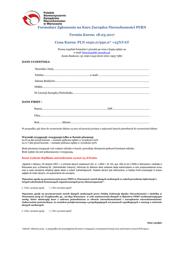 Formularz Zgłoszenia na Kurs Zarządca Nieruchomości PFRN Termin Kursu: 18.03.2017 Cena Kursu: PLN 1050,0/950,0* +23%VAT Proszę wypełnić formularz i przesłać go wraz z kopią wpłaty na e-mail: [email protected] Konto Bankowe: 52 1090 1043 0000 0001 1953 7380 DANE UCZESTNIKA: Nazwisko i Imię …………………………………………………………………………………………………………………….. Telefon…………………………………………………………e-mail………………………………………………………………. Imiona Rodziców……………………………………………………………………………………………………………………. PESEL……………………………………………………………………………………………………………………………………. Nr Licencji Zarządcy/Pośrednika………………………………………………………………………………………………. DANE FIRMY : Nazwa…………………………………………………………………………………NIP…………………………………………….. Ulica……………………………………………………………………………………………………………………………………….. Kod……………………………Miasto…………………………………………………………………………………………………. W przypadku, gdy dane do wystawienia faktury są inne niż powyżej prosimy o załączenie danych potrzebnych do wystawienia faktury Warunki rezygnacji: rezygnacja tylko w formie pisemnej na 8-14 dni przed kursem – zostanie pobrana opłata w wysokości 20% na 0-7 dni przed kursem – zostanie pobrana opłata w wysokości 50% Brak pisemnej rezygnacji i nie wzięcie udziału w kursie, powoduje obciążenie pełnymi kosztami udziału. Brak wpłaty nie jest jednoznaczny z rezygnacją. Koszt wydania duplikatu zaświadczenia wynosi 25 zł brutto. „Zgodnie z Ustawą z 29 sierpnia 1997 r. o ochronie danych osobowych (Dz. U. z 2002 r. Nr 101, poz. 926 ze zm.) PSZN w Warszawie z siedzibą w Warszawie przy ul.Żelaznej 69 (Administrator Danych), informuje że zbierane dane osobowe będą wykorzystane w celu przeprowadzenia kursu oraz w razie wyrażenia odrębnej zgody także w celach marketingowych. Podanie danych jest dobrowolne, w każdej chwili przysługuje Ci prawo wglądu do treści danych, ich poprawiania lub usunięcia. Wyrażam zgodę na przetwarzanie przez PSZN w Warszawie moich danych osobowych w celach przesłania informacji o innych szkoleniach branżowych organizowanych przez Stowarzyszenie”. [ ] Tak, wyrażam zgodę [ ] Nie wyrażam zgody” Wyrażam zgodę na przetwarzanie moich danych osobowych przez Polską Federację Rynku Nieruchomości z siedzibą w Warszawie przy ul. Grzybowska 45 , 00-844 Warszawa w celu umieszczenia danych w Rejestrze PFRN ewidencjonującym osoby, które ukończyły kurs z zakresu pośrednictwa w obrocie nieruchomościami i zarządzania nieruchomościami. Jednocześnie potwierdzam, że zostałem poinformowany o przysługujących mi prawach wynikających z ustawy o ochronie danych osobowych. [ ] Tak, wyrażam zgodę [ ] Nie wyrażam zgody” Data i podpis *zakreśl właściwą cenę, w przypadku nie przystąpienia do testu i rezygnacji z otrzymania licencji cena netto kursu wynosi PLN 950,0