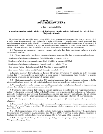 Projekt z dnia 27 kwietnia 2016 r. Zatwierdzony przez ......................... UCHWAŁA NR .................... RADY MIEJSKIEJ W GNIEWIE z dnia 14 kwietnia 2016 r. w sprawie ustalenia wysokości miesięcznych diet i zwrotu kosztów podróży służbowych dla radnych Rady Miejskiej w Gniewie Na podstawie art. 25 ust.4,6 i 8 ustawy z dnia 08.03.1990 r. o samorządzie gminnym (Dz. U. z 2015r. poz. 1515 z późn. zm.), Rozporządzenia Rady Ministrów z dnia 26.07.2000r. w sprawie maksymalnej wysokości diet przysługujących radnemu gminy (Dz. U. Nr 61, poz. 710) oraz Rozporządzenia Ministra Spraw Wewnętrznych i Administracji z dnia 31.07.2000 r. w sprawie sposobu ustalania należności z tytułu zwrotu kosztów podróży służbowych radnych gminy (Dz. U. z 2000r. Nr 66. poz. 800 z późn. zm.) uchwala się, co następuje: § 1. Wprowadza się miesięczny ryczałtowy system naliczania diet, które przysługują radnemu z tytułu sprawowania mandatu. § 2. 1. Ustala się zryczałtowaną dietę w stosunku miesięcznym, zwaną dalej dietą zryczałtowaną dla radnego: 1) pełniącego funkcję przewodniczącego Rady Miejskiej w wysokości 1312 zł. 2) pełniącego funkcję wiceprzewodniczącego Rady Miejskiej w wysokości 1053 zł. 3) pełniącego funkcję przewodniczącego Komisji Stałej w wysokości 755 zł. 4) za prace w Radzie i dwóch komisjach Rady Miejskiej w wysokości 616 zł. 5) za prace w Radzie i jednej komisji Rady Miejskiej w wysokości 397 zł 2. Radnemu Zastępcy Przewodniczącego Komisji Rewizyjnej przysługuje 4% dodatku do diety obliczonej według diety w wysokości kwoty maksymalnej, o której mowa w Rozporządzeniu Rady Ministrów w sprawie maksymalnej wysokości diet przysługujących radnemu gminy. § 3. 1. Dieta miesięczna ulega obniżeniu o 25% wartości miesięcznej diety przysługującej radnemu, za każdą nieobecność radnego na sesji rady lub posiedzeniu komisji, której jest członkiem z zastosowaniem §4. 2. W przypadku nieobecności radnego na wszystkich sesjach rady i posiedzeniach komisji w ciągu miesiąca, dieta za dany miesiąc nie przysługuje z zastosowaniem §4. § 4. Obniżeniu nie podlegają diety radnych, których nieobecność spowodowana była wypełnianiem innych zadań wynikających z pełnionych funkcji w Radzie Miejskiej, potwierdzona przez Przewodniczącego Rady oraz w przypadku nieobecności spowodowanej chorobą radnego, śmiercią jego rodziców, małżonka, dziecka lub członka najbliższej rodziny. Chorobę należy udokumentować odpowiednio zwolnieniem lekarskim lub zaświadczeniem. § 5. 1. Podstawą potwierdzenia obecności osób wymienionych w §2 stanowi podpis złożony na liście obecności. 2. Dieta za każdy miesiąc kalendarzowy jest wypłacana radnemu przelewem na wskazany przez niego rachunek bankowy lub w kasie Urzędu w terminie do 10 dnia następnego miesiąca na podstawie list wypłat sporządzonych przez Biuro Rady. § 6. 1. Radnemu przysługuje zwrot kosztów podróży służbowych na zasadach określonych w Rozporządzeniu Ministra Spraw Wewnętrznych i Administracji z dnia 31 lipca 2000 r. w sprawie sposobu ustalania należności z tytułu zwrotu kosztów podróży służbowych radnym gmin (Dz. U. Nr 66, poz. 800 z późn. zm.) 2. Polecenie wyjazdu służbowego Przewodniczącego Rady poza teren gminy podpisuje Burmistrz na wniosek Wiceprzewodniczącego Rady. Id: 26685E88-3021-4236-BEAC-C5280FBD9EDC. Projekt Strona 1 § 7. 1. Traci moc uchwała Nr VII/45/15 Rady Miejskiej w Gniewie z dnia 25 marca 2015 r. w sprawie zmiany uchwały Nr XXIII/159/12 z dnia 29 sierpnia Rady Miejskiej w Gniewie w sprawie ustalenia wysokości miesięcznych diet i zwrotu kosztów podróży służbowych dla radnych Rady Miejskiej w Gniewie. 2. Traci moc uchwała Nr XI/77/15 Rady Miejskiej w Gniewie z dnia 26 sierpnia 2015 r. w sprawie zmiany uchwały Nr VII/45/15 z dnia 25 marca 2015 r. Rady Miejskiej w Gniewie w sprawie ustalenia wysokości miesięcznych diet i zwrotu kosztów podróży służbowych dla radnych Rady Miejskiej w Gniewie. § 8. Wykonanie uchwały powierza się odpowiednio Burmistrzowi i Przewodniczącemu Rady Miejskiej w Gniewie § 9. Uchwała wchodzi w życie z dniem podjęcia i podlega ogłoszeniu w Biuletynie Informacji Publicznej w sposób zwyczajowo przyjęty. Id: 26685E88-3021-4236-BEAC-C5280FBD9EDC. Projekt Strona 2 UZASADNIENIE Zgodnie z przepisami ustawy z dnia 8 marca 1990 r. o samorządzie gminnym, rady gmin ustalają zasady oraz wysokości diet przysługujących radnym, a także zwrot kosztów podróży służbowych. Zasady te określa się na podstawie Rozporządzenia Rady Ministrów z dnia 26 lipca 2000 r. w sprawie maksymalnych wysokości diet przysługujących radnemu gminy oraz Rozporządzenia Ministra Spraw Wewnętrznych i Administracji z dnia 31 lipca 2000 r. w sprawie sposobu ustalania należności z tytułu zwrotu kosztów podróży służbowych radnych. Uchwała nie pociąga skutków finansowych dla budżetu Gminy Gniew. Id: 26685E88-3021-4236-BEAC-C5280FBD9EDC. Projekt Strona 1