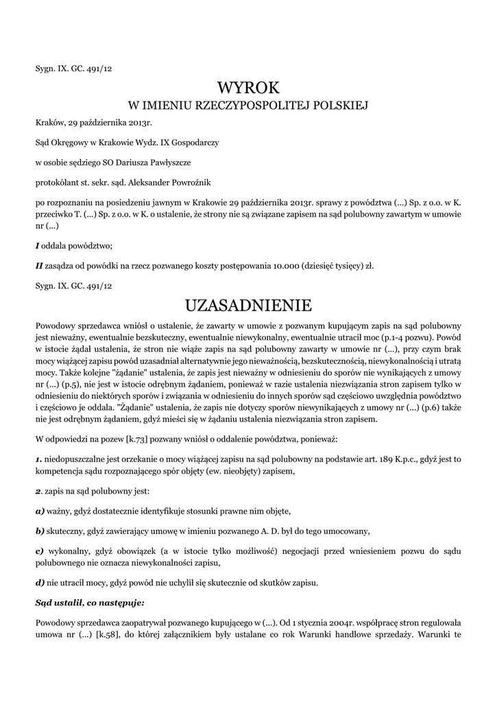 Sygn. IX. GC. 491/12 WYROK W IMIENIU RZECZYPOSPOLITEJ POLSKIEJ Kraków, 29 października 2013r. Sąd Okręgowy w Krakowie Wydz. IX Gospodarczy w osobie sędziego SO Dariusza Pawłyszcze protokólant st. sekr. sąd. Aleksander Powroźnik po rozpoznaniu na posiedzeniu jawnym w Krakowie 29 października 2013r. sprawy z powództwa (...) Sp. z o.o. w K. przeciwko T. (...) Sp. z o.o. w K. o ustalenie, że strony nie są związane zapisem na sąd polubowny zawartym w umowie nr (...) I oddala powództwo; II zasądza od powódki na rzecz pozwanego koszty postępowania 10.000 (dziesięć tysięcy) zł. Sygn. IX. GC. 491/12 UZASADNIENIE Powodowy sprzedawca wniósł o ustalenie, że zawarty w umowie z pozwanym kupującym zapis na sąd polubowny jest nieważny, ewentualnie bezskuteczny, ewentualnie niewykonalny, ewentualnie utracił moc (p.1-4 pozwu). Powód w istocie żądał ustalenia, że stron nie wiąże zapis na sąd polubowny zawarty w umowie nr (...), przy czym brak mocy wiążącej zapisu powód uzasadniał alternatywnie jego nieważnością, bezskutecznością, niewykonalnością i utratą mocy. Także kolejne "żądanie" ustalenia, że zapis jest nieważny w odniesieniu do sporów nie wynikających z umowy nr (...) (p.5), nie jest w istocie odrębnym żądaniem, ponieważ w razie ustalenia niezwiązania stron zapisem tylko w odniesieniu do niektórych sporów i związania w odniesieniu do innych sporów sąd częściowo uwzględnia powództwo i częściowo je oddala. "Żądanie" ustalenia, że zapis nie dotyczy sporów niewynikających z umowy nr (...) (p.6) także nie jest odrębnym żądaniem, gdyż mieści się w żądaniu ustalenia niezwiązania stron zapisem. W odpowiedzi na pozew [k.73] pozwany wniósł o oddalenie powództwa, ponieważ: 1. niedopuszczalne jest orzekanie o mocy wiążącej zapisu na sąd polubowny na podstawie art. 189 K.p.c., gdyż jest to kompetencja sądu rozpoznającego spór objęty (ew. nieobjęty) zapisem, 2. zapis na sąd polubowny jest: a) ważny, gdyż dostatecznie identyfikuje stosunki prawne nim objęte, b) skuteczny, gdyż zawierający umowę w imieniu pozwanego A. D. był do tego umocowany, c) wykonalny, gdyż obowiązek (a w istocie tylko możliwość) negocjacji przed wniesieniem pozwu do sądu polubownego nie oznacza niewykonalności zapisu, d) nie utracił mocy, gdyż powód nie uchylił się skutecznie od skutków zapisu. Sąd ustalił, co następuje: Powodowy sprzedawca zaopatrywał pozwanego kupującego w (...). Od 1 stycznia 2004r. współpracę stron regulowała umowa nr (...) [k.58], do której załącznikiem były ustalane co rok Warunki handlowe sprzedaży. Warunki te przewidywały na rzecz kupującego szereg opłat marketingowych i bonusów. Umowa zawierała zapis prorogacyjny na sąd właściwy dla siedziby kupującego (§ 13.3). W 2008 roku strony zastąpiły tę umowę niemal identyczną umową z 1 stycznia 2008r. [k.62] utrzymując zapis na sąd powszechny właściwy dla siedziby kupującego (§ 11.3). Po 1 stycznia 2010r. strony zastąpiły umowę z 1 stycznia 2008r. umową nr (...) z datą 1 stycznia 2010r. [k.49] zawierającą zapis na sąd polubowny (§ 10). Ponadto strony zawarły opatrzoną tą samą datą 1 stycznia 2010r. umowę o świadczenie przez kupującego na rzecz sprzedającego usług promocyjnych [k.67] także zawierającą zapis na sąd polubowny (§ 16). W maju 2011r. sprzedawca pozwał kupującego przed sąd polubowny o zapłatę 542.456,67 zł tytułem zwrotu zapłaconych kupującemu w 2008 roku opłat marketingowych i bonusów. Sprzedawca wniósł pozew do sądu polubownego w oparciu o zapis na sąd polubowny zawarty w umowie nr (...) i jednocześnie podniósł w pozwie zarzut nieważności tego zapisu. W toku procesu sprzedawca oświadczeniem z 13 października 2011r. [k.66] uchylił się od skutków zapisu na sąd polubowny zawartego w umowie nr (...) ze względu na bliżej nieokreślony w oświadczeniu podstęp kupującego. Wyrokiem z 5 marca 2012r. [k.341] sąd polubowny oddalił powództwo ze względu na wzajemne zrzeczenie się przez strony roszczeń za okres sprzed 1 stycznia 2010r. (§ 11.3 umowy nr (...)). Sąd polubowny uznał zapis na sąd polubowny za wiążący oraz obejmujący także spory powstałe na tle umów wiążących strony przed 1 stycznia 2010r. W czerwcu 2011r. sprzedawca pozwał kupującego przed ten sam sąd polubowny o zapłatę 1.952.661,47 zł tytułem zwrotu innych opłat i bonusów zapłaconych kupującemu w 2008 roku także podnosząc w pozwie zarzut niewłaściwości sądu polubownego. Wyrokiem z 5 marca 2012r. [k.354] sąd polubowny zajął takie samo stanowisko jako w przytoczonym wyżej wyroku w poprzedniej sprawie. Obydwa wyroki sądu polubownego sprzedawca zaskarżył przed sądami powszechnymi skargami o uchylenie, które zostały oddalone. W czerwcu 2012r. sprzedawca pozwał kupującego przed sąd polubowny o zapłatę 48.800 zł tytułem zwrotu wynagrodzenia zapłaconego na podstawie umowy z 1 stycznia 2010r. o świadczenie przez kupującego na rzecz sprzedającego usług promocyjnych [k.67]. W tym postępowaniu powód nie kwestionował mocy zapisu na sąd polubowny zawartego w umowie o świadczenie usług promocyjnych. Wyrokiem z 24 stycznia 2013r. sąd polubowny oddalił powództwo, gdyż zapłacona przez sprzedawcę suma była wynagrodzeniem za usługi kupującego, a nie opłatą za przyjęcie przez kupującego towarów do sprzedaży. Tuż po wniesieniu niniejeszego pozwu sprzedawca pozwał kupującego o zapłatę 523.967 zł tytułem zwrotu opłat marketingowych i bonusów zapłaconych kupującemu w 2011r. (sprawa IX.GC.514/12), a kupujący podniósł zarzut zapisu na sąd polubowny zawartego w umowie nr (...). Zarzut zapisu na sąd polubowny nie został rozstrzygnięty na posiedzeniu 29 października 2013r. [k.411] - wspólnym z niniejszą sprawą - ze względu na spór co do tego, czy podstawą zapłaty spornej sumy 523.967 zł była wyłącznie umowa nr (...). Powyżs