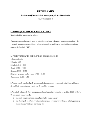REGULAMIN Państwowej Bursy Szkół Artystycznych we Wrocławiu ul. Trzemeska 2 OBOWIĄZKI MIESZKAŃCA BURSY Do obowiązków wychowanka należy: Systematyczne realizowanie opłat za pobyt i wyżywienie w Bursie w ustalonym terminie – do 1go dnia każdego miesiąca. Opłaty w innym terminie są możliwe po wcześniejszym złożeniu podania do Dyrekcji PBSA. I. PRZESTRZEGANIE USTALONEGO ROZKŁADU DNIA 1. Porządek dnia: Pobudka 6.45, Śniadanie 6.45 – 8.30 Obiad: 13.30 – 17.00 Kolacja: 19.00 – 20.30 Zajęcia w grupach, nauka własna 19:00 – 21:00 Cisza nocna 22:00 – 6:30 2. Wychowanek ma obowiązek uczęszczania do szkoły , nie opuszczania zajęć i nie spóźniania się na lekcje oraz osiągania pozytywnych wyników w nauce. 3. W dniach roboczych obowiązuje nauka własna/gra na instrumencie/ od godziny 16.30 do19.00. W tym czasie wychowanek: o nie może przebywać poza bursą bez wiedzy wychowawcy, o ma obowiązek poinformowania wychowawcy o powtórnym wyjściu do szkoły, potrzebie skorzystania z biblioteki publicznej itp. 4. O nieobecności w szkole i jej przyczynach powinni być informowani wychowawcy bursy. Wychowankowie pozostający w domu w dniach zajęć szkolnych powinni powiadamiać niezwłocznie bursę o przyczynach nieobecności i terminie powrotu do bursy. 5. Każdorazowe wyjście poza bursę należy zgłosić wychowawcy grupy i uzgodnić z nim godzinę powrotu. Przy opuszczaniu bursy obowiązują ponadto następujące ustalenia: o Uczniowie szkoły podstawowej i gimnazjum wracają do bursy do godziny 20.00. o Uczniowie liceum i mieszkańcy pełnoletni wracają do bursy do godziny 21.00. o W weekendy (piątki i soboty) młodzież pełnoletnia wraca do bursy do godziny 22.00. o W przypadku udziału w koncertach, spektaklach teatralnych itp., dopuszcza się możliwość późniejszego powrotu za uprzednią zgodą wychowawcy grupy i po uprzednim dostarczeniu zgody rodziców. 6. W szczególnych przypadkach jest możliwy późniejszy powrót do bursy, uzgodniony z wycho wawcą na podstawie pisemnej zgody rodziców, którzy biorą za swoje dziecko w tym czasie pełną odpowiedzialność, przy czym najpóźniejszą porą takiego powrotu jest godzina 24.00. 7. Obowiązkiem chorego wychowanka przebywającego w bursie jest niezwłoczne zgłoszenie swojej dolegliwości wychowawcy. 8. Wyjazdy wychowanków w czasie trwania zajęć szkolnych mogą mieć miejsce wyłącznie na podstawie: o zgody wychowawcy klasy, o zgody rodziców (opiekunów) o zwolnienia lekarskiego 9. Każdy wyjazd odnotowany jest w zeszycie wyjazdów, z podaniem daty, godziny i miejsca pobytu oraz terminu powrotu. 10. Powrót z domu następuje nie później niż do godziny 22.00, jest również odnotowany w zeszycie wyjazdów. 11. Cisza nocna obowiązuje od godziny 22.00 do godziny 6.00. W czasie trwania ciszy nocnej należy: o zaprzestać: gry na instrumentach, głośnego rozmawiania i odwiedzania innych osób, prania i tym podobnych czynności zakłócających spokój, o wyłączyć odbiorniki radiowe, magnetofonowe i in., o wygasić światła górne w pokojach mieszkalnych, o oddać klucze z ćwiczeniówek i innych pomieszczeń do portierni. Dłuższa nauka (po godz. 22.00) wymaga każdorazowego zgłaszania wychowawcy. Zgodę na dłuższą naukę wyraża wychowawca. 12. Zmiana miejsca noclegu w bursie wymaga uprzedniej zgody wychowawcy grupy. 13. Nocowanie poza bursą jest zabronione. W wyjątkowych sytuacjach, po pisemnej zgodzie rodziców, może nastąpić zwolnienie od tego nakazu. (Przypadki rozpatrywane będą indywidualnie). 14. Łóżka w ciągu dnia muszą być pościelone, a pościel schowana do środka tapczanu (wyjątek stanowią osoby chore). Zabrania się spania w pościeli bez powleczenia. 15. Obowiązkiem osób niepełnoletnich, wymagających szczególnego żywienia jest dostarczenie zaświadczenia lekarskiego (diety) i zgody rodziców (wegetarianie). II. PRZESTRZEGANIE ZASAD KULTURALNEGO ZACHOWANIA W BURSIE Mieszkaniec PBSA zobowiązany jest: 1. Przestrzegać przepisów BHP. 2. Dbać o czystość i porządek zajmowanych pomieszczeń oraz higienę osobistą. 3. Przestrzegać zakazu używania grzałek, grzejników, żelazek w pomieszczeniach mieszkalnych. 4. Dbać o stan powierzonego mienia (sprzęt, urządzenia sanitarne, oświetlenie). 5. Zamykać puste pokoje i klucze oddawać do portierni po uprzednim wygaszeniu świateł, odbiorników radiowych i zamknięciu dopływu wody. 6. Przestrzegać zakazu używania otwartego ognia tj. świeczek, kadzideł, podgrzewaczy zakaz pozostawiania bez dozoru świecących lampek w pokojach i in. pomieszczeniach, jak również ładowarek do telefonów komórkowych pozostawionych włączonych jedynie do sieci. 7. W stołówce bursowej obowiązuje samoobsługa. 8. Nie wolno wynosić naczyń ze stołówki, ani spożywać w pokojach podstawowych posiłków (za wyjątkiem osób chorych) 9. Dla młodzieży wracającej z zajęć w godzinach późniejszych posiłki są przechowywane w lodówce w stołówce. 10. Indywidualne posiłki należy przygotowywać w kuchniach podręcznych na poszczególnych piętrach i tam też myć naczynia, a kuchnię utrzymywać w czystości. 11. Młodzież może korzystać z pomieszczeń pralni do godziny 21.30. Nie wolno suszyć w pokojach bielizny i garderoby. Do suszenia służą umieszczone suszarki w pomieszczeniach pralni oraz zainstalowane w łazienkach. 12 W uzasadnionych przypadkach – przy uwzględnieniu możliwości poszczególnych wychowanków – wychowanek może wykonać zlecone prace społeczno – użytkowe na terenie bursy. III. WYPEŁNIANIE OBOWIĄZKÓW SZKOLNYCH 1. Każdorazowy fakt opuszczenia zajęć lekcyjnych wymaga poinformowania właściwego wychowawcy grupy. Po uzgodnieniu z rodzicami (opiekunami) ucznia wychowawca może usprawiedliwić nieobecność ucznia w szkole. 2. Wychowanek powinien poinformować właściwego wychowawcę o wynikłych trudnościach w nauce. 3.Obowiazkiem mieszkańca jest utrzymywanie w