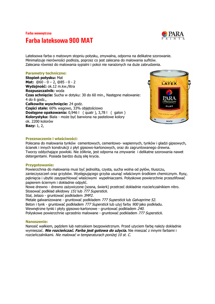 Farba wewnętrzna Farba lateksowa 900 MAT Lateksowa farba o matowym stopniu połysku, zmywalna, odporna na delikatne szorowanie. Minimalizuje nierówności podłoża, poprzez co jest zalecana do malowania sufitów. Zalecana również do malowania sypialni i pokoi nie narażonych na duże zabrudzenia. Parametry techniczne: Stopień połysku: Mat Mat: @60 - 0 – 2, @85 - 0 - 2 Wydajność: ok.12 m.kw./litra Rozpuszczalnik: woda Czas schnięcia: Sucha w dotyku: 30 do 60 min., Następne malowanie: 4 do 6 godz., Całkowite wyschnięcie: 24 godz. Części stałe: 60% wagowo, 33% objętościowo Dostępne opakowania: 0,946 l ( quatr ), 3,78 l ( galon ) Kolorystyka: Biała - może być barwiona na pastelowe kolory ok. 2200 kolorów Bazy: 1, 2, Przeznaczenie i właściwości: Polecana do malowania tynków cementowych, cementowo- wapiennych, tynków i gładzi gipsowych, ścianek i innych konstrukcji z płyt gipsowo-kartonowych, oraz do zagruntowanego drewna. Tworzy oddychające powłoki. Nie żółknie, jest odporna na zmywanie i delikatne szorowania nawet detergentami. Posiada bardzo dużą siłę krycia. Przygotowanie: Powierzchnia do malowania musi być jednolita, czysta, sucha wolna od pyłów, tłuszczu, zanieczyszczeń oraz grzybów. Występującego grzyba usunąć właściwym środkiem chemicznym. Rysy, pęknięcia i ubytki zaszpachlować właściwymi wypełniaczami. Połyskowe powierzchnie przeszlifować papierem ściernym i dokładnie odpylić. Nowe drewno - drewno zażywiczone (sosna, świerk) przetrzeć dokładnie rozcieńczalnikiem nitro. Stosować podkład alkidowy 151 lub 777 Superstick. Stal, żelazo - gruntować podkładem 3MP2. Metale galwanizowane - gruntować podkładem 777 Superstick lub Galvaprime 52. Beton i tynk - gruntować podkładem 777 Superstick lub użyj farby 900 jako podkładu. Wewnętrzne tynki i płyty gipsowo-kartonowe - gruntować podkładem 240. Połyskowe powierzchnie uprzednio malowane - gruntować podkładem 777 Superstick. Nanoszenie: Nanosić wałkiem, pędzlem lub natryskiem bezpowietrznym. Przed użyciem farbę należy dokładnie wymieszać. Nie rozcieńczać. Farba jest gotowa do użycia. Nie mieszać z innymi farbami i rozcieńczalnikami. Nie malować w temperaturach poniżej 10 st. C.