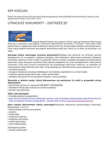 KPP KOŚCIAN Źródło: http://www.koscian.policja.gov.pl/w11/prewencja/prewencja-informuje/63199,Utraciles-dokumenty-zastrzez-je.html Wygenerowano: Środa, 8 marca 2017, 16:21 UTRACIŁEŚ DOKUMENTY - ZASTRZEŻ JE! Związek Banków Polskich przy wsparciu Policji rozpoczął kampanię informacyjną dotyczącą możliwości zastrzegania utraconych dokumentów tożsamości w bankach. Dziś każdy może poinformować o zagubionych bądź skradzionych dokumentach już nie tylko będąc klientem konkretnego banku. Coraz więcej banków umożliwia zastrzeganie dokumentów także tym, którzy na co dzień nie korzystają z ich usług. Dlaczego należy zastrzegać utracone dokumenty?Każdego dnia dokonuje się milionów operacji polegających m.in. na wpłatach i wypłatach pieniędzy z kont bankowych, dokonywaniu przelewów, zakładaniu rachunków, zawieraniu umów o kredyt czy pożyczkę. Niemal w każdym przypadku wymagane jest potwierdzenie tożsamości osoby zlecającej wykonanie takiej operacji.Zagubienie lub utrata któregokolwiek z dokumentów tożsamości może mieć przykre konsekwencje dla prawowitego właściciela zwłaszcza, że sposobów na wykorzystanie cudzej tożsamości jest wiele i wciąż pojawiają się nowe.Dokumenty wykorzystywane są m.in. do: wyłudzenia pożyczki, wynajęcia mieszkania lub pokoju hotelowego w celu kradzieży wyposażenia czy unikania opłat, kradzieży wypożyczonego samochodu i innych przedmiotów, zakładania fikcyjnych firm do wyłudzania kredytów, zwrotu podatków. ● ● ● ● Wszystko w imieniu osoby, której dokumentem się posłużono! Co robić w przypadku utraty dokumentów? Natychmiast zastrzec je w Systemie DOKUMENTY ZASTRZEŻONE. Powiadomić Policję (gdy utracono je w wyniku kradzieży). Wyrobić nowy dokument. ● ● ● Gdzie i jak zastrzegać? W każdej placówce swojego Banku. Jeżeli ktoś nie posiada rachunku bankowego, powinien udać się do Banku przyjmującego zastrzeżenia także od osób nie będących Klientami danego Banku – aktualna lista na stronie www.dokumentyzastrzezone.pl ● ● Jakie rodzaje dokumentów należy zastrzegać?Wszystkie dokumenty potwierdzające tożsamość. Najważniejsze z nich to: dowód osobisty (również tymczasowy), paszport, prawo jazdy, książeczka wojskowa, książkowa marynarska, dowód rejestracyjny, karta stałego pobytu, ● ● ● ● ● ● ● Zastrzegane są także: dowody rejestracyjne, ● ● karty płatnicze. Szczegółowe informacje na internetowej stronie www.dokumentyzastrzezone.pl Ocena: 0/5 (0) Tweetnij