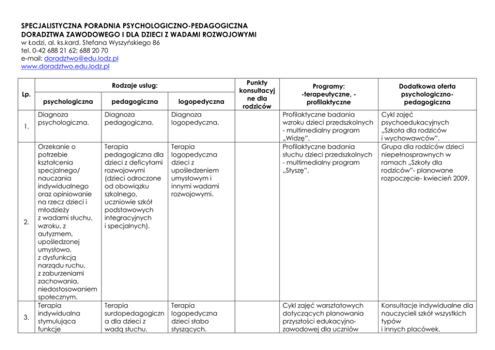 SPECJALISTYCZNA PORADNIA PSYCHOLOGICZNO-PEDAGOGICZNA DORADZTWA ZAWODOWEGO I DLA DZIECI Z WADAMI ROZWOJOWYMI w Łodzi, al. ks.kard. Stefana Wyszyńskiego 86 tel. 0-42 688 21 62; 688 20 70 e-mail: [email protected] www.doradztwo.edu.lodz.pl Rodzaje usług: Lp. psychologiczna pedagogiczna logopedyczna Diagnoza psychologiczna. Diagnoza pedagogiczna. Diagnoza logopedyczna. Orzekanie o potrzebie kształcenia specjalnego/ nauczania indywidualnego oraz opiniowanie na rzecz dzieci i młodzieży z wadami słuchu, wzroku, z autyzmem, upośledzonej umysłowo, z dysfunkcją narządu ruchu, z zaburzeniami zachowania, niedostosowaniem społecznym. Terapia indywidualna stymulująca funkcje Terapia pedagogiczna dla dzieci z deficytami rozwojowymi (dzieci odroczone od obowiązku szkolnego, uczniowie szkół podstawowych integracyjnych i specjalnych). Terapia logopedyczna dzieci z upośledzeniem umysłowym i innymi wadami rozwojowymi. Terapia surdopedagogiczn a dla dzieci z wadą słuchu. Terapia logopedyczna dzieci słabo słyszących. 1. 2. 3. Punkty konsultacyj ne dla rodziców Programy: -terapeutyczne, profilaktyczne Dodatkowa oferta psychologicznopedagogiczna Profilaktyczne badania wzroku dzieci przedszkolnych - multimedialny program „Widzę”. Profilaktyczne badania słuchu dzieci przedszkolnych - multimedialny program „Słyszę”. Cykl zajęć psychoedukacyjnych „Szkoła dla rodziców i wychowawców”. Grupa dla rodziców dzieci niepełnosprawnych w ramach „Szkoły dla rodziców”- planowane rozpoczęcie- kwiecień 2009. Cykl zajęć warsztatowych dotyczących planowania przyszłości edukacyjnozawodowej dla uczniów Konsultacje indywidualne dla nauczycieli szkół wszystkich typów i innych placówek. poznawcze dzieci z wieloraką niepełnosprawnoś cią (wady zmysłów, upośledzenie umysłowe, niepełnosprawnoś ć ruchowa). 4. 5. 6. słabo słyszących (gimnazjum i Liceum Profilowane). Terapia pedagogiczna dla dzieci słabo widzącychrozwijanie umiejętności posługiwania się wzrokiem. Terapia pedagogiczna dla uczniów gimnazjum ze specjalnymi potrzebami rozwojowymi i edukacyjnymi (odchylenia w stanie zdrowia, dysleksja). Terapia logopedyczna dzieci z autyzmem. Zajęcia warsztatowe dotyczące planowania przyszłości edukacyjno -zawodowej dla uczniów słabo widzących (gimnazjum). Cykl spotkań- grupa wsparcia dla nauczycieli, pedagogów i psychologów z gimnazjów specjalnych. Wielokierunkowa terapia dziecka z niepłynnością mówienia. Pilotaż programu „Niepełnosprawni-też aktywni na rynku pracy”zajęcia warsztatowe dla uczniów gimnazjum specjalnego (uczniowie upośledzeni umysłowo w stopniu lekkim). Szkolenie Rad Pedagogicznych szkół wszystkich typów, grup nauczycieli, pracowników poradni, psychologów, pedagogów (na zapotrzebowanie). Zajęcia warsztatowe dotyczące planowania przyszłości edukacyjno zawodowej dla uczniów gimnazjów ogólnodostępnych (kl. II i III). REJON DZIAŁANIA SPECJALISTYCZNEJ PORADNI PSYCHOLOGICZNO-PEDAGOGICZNEJ DORADZTWA ZAWODOWEGO I DLA DZIECI Z WADAMI ROZWOJOWYMI Rejonem działania Specjalistycznej Poradni Psychologiczno-Pedagogicznej Doradztwa Zawodowego i dla Dzieci z Wadami Rozwojowymi jest Miasto Łódź. Dodatkowo Poradnia prowadzi działania dla powiatu pabianickiego i wschodniego-łódzkiego. Działania Poradni są skierowane do dzieci i młodzieży słabo widzącej, niewidomej, słabo słyszącej, niesłyszącej, z autyzmem, z niepełnosprawnościami sprzężonymi, z upośledzeniem umysłowym w stopniu znacznym i głębokim, dla młodzieży na etap ponadgimnazjalny w zakresie kształcenia specjalnego i opiniowania, w zakresie doradztwa zawodowego głównie dla młodzieży niepełnosprawnej i chorej. W zakresie orzecznictwa dla dzieci i młodzieży słabo widzącej, niewidomej, słabo słyszącej, niesłyszącej i z autyzmem.