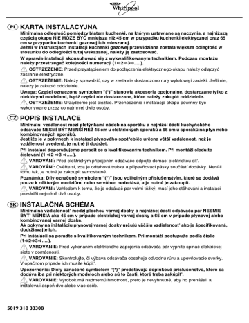PL KARTA INSTALACYJNA Minimalna odległość pomiędzy blatem kuchenki, na którym ustawiane są naczynia, a najniższą częścią okapu NIE MOŻE BYĆ mniejsza niż 45 cm w przypadku kuchenki elektrycznej oraz 65 cm w przypadku kuchenki gazowej lub mieszanej. Jeżeli w instrukcjach instalacji kuchenki gazowej przewidziana została większa odległość w stosunku do odległości tutaj wskazanej, należy ją zastosować. W sprawie instalacji skonsultować się z wykwalifikowanym technikiem. Podczas montażu należy przestrzegać kolejności numeracji (1Ö2Ö3Ö.....). OSTRZEŻENIE: Przed przystąpieniem do podłączenia elektrycznego okapu należy odłączyć zasilanie elektryczne. OSTRZEŻENIE: Należy sprawdzić, czy w zestawie dostarczono rurę wylotową i zaciski. Jeśli nie, należy je zakupić oddzielnie. Uwaga: Części oznaczone symbolem “(*)” stanowią akcesoria opcjonalne, dostarczane tylko z niektórymi modelami, bądź części nie dostarczane, które należy zakupić oddzielnie. OSTRZEŻENIE: Urządzenie jest ciężkie. Przenoszenie i instalacja okapu powinny być wykonywane przez co najmniej dwie osoby. CZ POPIS INSTALACE Minimální vzdálenost mezi plotýnkami nádob na sporáku a nejnižší částí kuchyňského odsávače NESMÍ BÝT MENŠÍ NEŽ 45 cm u elektrických sporáků a 65 cm u sporáků na plyn nebo kombinovaných sporáků. Jestliže je v pokynech k instalaci plynového spotřebiče určena větší vzdálenost, než je vzdálenost uvedená, je nutné ji dodržet. Při instalaci doporučujeme poradit se s kvalifikovaným technikem. Při montáži sledujte číslování (1 Ö2 Ö3 Ö.....). VAROVÁNÍ: Před elektrickým připojením odsávače odpojte domácí elektrickou sít’. VAROVÁNÍ: Ověřte si, zda je odtahová trubka a připevňovací pásky součástí dodávky. Není-li tomu tak, je nutné je zakoupit samostatně. Poznámka: Díly označené symbolem “(*)” jsou volitelným příslušenstvím, které se dodává pouze k některým modelům, nebo se vůbec nedodává, a je nutné je zakoupit. VAROVÁNÍ: Vzhledem k tomu, že je odsávač par velmi těžký, musí jeho stěhování a instalaci provádět nejméně dvě osoby. SK INŠTALAČNÁ SCHÉMA Minimálna vzdialenost’ medzi plochou varnej dosky a najnižšej časti odsávača pár NESMIE BYT’ MENŠIA ako 45 cm v prípade elektrickej varnej dosky a 65 cm v prípade plynovej alebo kombinovanej varnej doske. Ak pokyny na inštaláciu plynovej varnej dosky určujú väčšiu vzdialenost’ ako je špecifikovaná, dodržiavajte ich. Pri inštalácii sa poraďte s kvalifikovaným technikom. Pri montáži postupujte podľa číslic (1Ö2Ö3Ö.....). VAROVANIE: Pred vykonaním elektrického zapojenia odsávača pár vypnite spínač elektrickej siete v domácnosti. VAROVANIE: Skontrolujte, či výbava odsávača obsahuje odvodnú rúru a upevňovacie svorky. V opačnom prípade ich musíte kúpit’. Upozornenie: Diely označené symbolom “(*)” predstavujú doplnkové príslušenstvo, ktoré sa dodáva iba pri niektorých modeloch alebo sú to časti, ktoré treba zakúpit’. VAROVANIE: Výrobok má nadmernú hmotnost’, preto je nevyhnutné, aby ho prenášali a inštalovali aspoň dve alebo viac osôb. 5019 318 33308 H ÜZEMBE HELYEZÉSI ÚTMUTATÓ A konyhai elszívó legalacsonyabb része és a főzőberendezésen kialakított edényfelület közötti távolságnak elektromos tűzhely esetén legalább 45 cm, gáz- vagy vegyes tűzhely esetén pedig legalább 65 cm NAGYSÁGÚNAK KELL LENNIE. Amennyiben a gáztűzhely üzembe helyezési útmutatója nagyobb távolságot ír elő, úgy azt kell betartani. Az üzembe helyezést szakemberrel végeztesse. A felszereléshez kövesse a számozást (1Ö2Ö3Ö.....). FIGYELMEZTETÉS: A készülék elektromos hálózatra való csatlakoztatása előtt kapcsolja ki a háztartás elektromos hálózatát. FIGYELMEZTETÉS: Ellenőrizze, hogy az elvezető cső és a rögzítőpántok a készülék tartozékaie. Ellenkező esetben ezeket külön kell megvásárolni. Megjegyzés: A “(*)” jelzésű alkatrészek olyan opcionális tartozékok, amelyek csak néhány modellhez járnak, illetve amelyeket külön meg kell vásárolni. FIGYELMEZTETÉS: Nagy súlya miatt a készülék mozgatását és üzembe helyezését legalább két vagy több személynek kell végeznie. RUS СХЕМА УСТАНОВКИ Минимальное расстояние между опорной поверхностью для посуды на плите и самой нижней частью вытяжки ДОЛЖНО СОСТАВЛЯТЬ НЕ МЕНЕЕ 45 cm в случае электрических плит и не менее 65 cm в случае газовых или комбинированных плит. Если инструкциями по установке газового прибора предусмотрено большее расстояние, то данное указание должно быть соблюдено. При выполнении монтажа проконсультируйтесь с квалифицированным специалистом. Последовательность действий при монтаже должна соответствовать нумерации (1Ö2Ö3Ö.....). ОСТОРОЖНО: Перед выполнением этой операции отсоедините вытяжку от сети электропитания. ОСТОРОЖНО: Проверьте, входят ли в комплект поставки выпускная труба и крепежные зажимы. В противном случае необходимо приобрести их отдельно. Примечание: детали, отмеченные символом “(*)”, представляют собой дополнительные принадлежности, поставляемые тольк