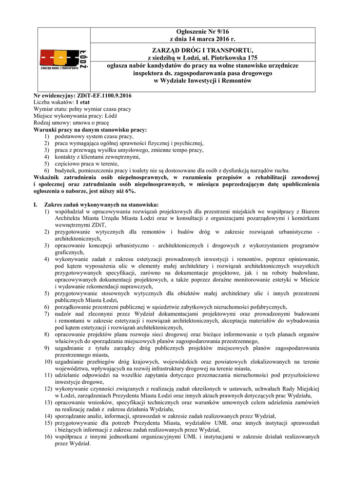 Ogłoszenie Nr 9/16 z dnia 14 marca 2016 r. ZARZĄD DRÓG I TRANSPORTU, z siedzibą w Łodzi, ul. Piotrkowska 175 ogłasza nabór kandydatów do pracy na wolne stanowisko urzędnicze inspektora ds. zagospodarowania pasa drogowego w Wydziale Inwestycji i Remontów Nr ewidencyjny: ZDiT-EF.1100.9.2016 Liczba wakatów: 1 etat Wymiar etatu: pełny wymiar czasu pracy Miejsce wykonywania pracy: Łódź Rodzaj umowy: umowa o pracę Warunki pracy na danym stanowisku pracy: 1) podstawowy system czasu pracy, 2) praca wymagająca ogólnej sprawności fizycznej i psychicznej, 3) praca z przewagą wysiłku umysłowego, zmienne tempo pracy, 4) kontakty z klientami zewnętrznymi, 5) częściowo praca w terenie, 6) budynek, pomieszczenia pracy i toalety nie są dostosowane dla osób z dysfunkcją narządów ruchu. Wskaźnik zatrudnienia osób niepełnosprawnych, w rozumieniu przepisów o rehabilitacji zawodowej i społecznej oraz zatrudnianiu osób niepełnosprawnych, w miesiącu poprzedzającym datę upublicznienia ogłoszenia o naborze, jest niższy niż 6%. I. Zakres zadań wykonywanych na stanowisku: 1) współudział w opracowywaniu rozwiązań projektowych dla przestrzeni miejskich we współpracy z Biurem Architekta Miasta Urzędu Miasta Łodzi oraz w konsultacji z organizacjami pozarządowymi i komórkami wewnętrznymi ZDiT, 2) przygotowanie wytycznych dla remontów i budów dróg w zakresie rozwiązań urbanistyczno architektonicznych, 3) opracowanie koncepcji urbanistyczno - architektonicznych i drogowych z wykorzystaniem programów graficznych, 4) wykonywanie zadań z zakresu estetyzacji prowadzonych inwestycji i remontów, poprzez opiniowanie, pod kątem wyposażenia ulic w elementy małej architektury i rozwiązań architektonicznych wszystkich przygotowywanych specyfikacji, zarówno na dokumentacje projektowe, jak i na roboty budowlane, opracowywanych dokumentacji projektowych, a także poprzez doraźne monitorowanie estetyki w Mieście i wydawanie rekomendacji naprawczych, 5) przygotowywanie stosownych wytycznych dla obiektów małej architektury ulic i innych przestrzeni publicznych Miasta Łodzi, 6) porządkowanie przestrzeni publicznej w sąsiedztwie zabytkowych nieruchomości pofabrycznych, 7) nadzór nad zleconymi przez Wydział dokumentacjami projektowymi oraz prowadzonymi budowami i remontami w zakresie estetyzacji i rozwiązań architektonicznych, akceptacja materiałów do wybudowania pod kątem estetyzacji i rozwiązań architektonicznych, 8) opracowanie projektów planu rozwoju sieci drogowej oraz bieżące informowanie o tych planach organów właściwych do sporządzania miejscowych planów zagospodarowania przestrzennego, 9) uzgadnianie z tytułu zarządcy dróg publicznych projektów miejscowych planów zagospodarowania przestrzennego miasta, 10) uzgadnianie przebiegów dróg krajowych, wojewódzkich oraz powiatowych zlokalizowanych na terenie województwa, wpływających na rozwój infrastruktury drogowej na terenie miasta, 11) udzielanie odpowiedzi na wszelkie zapytania dotyczące przeznaczania nieruchomości pod przyszłościowe inwestycje drogowe, 12) wykonywanie czynności związanych z realizacją zadań określonych w ustawach, uchwałach Rady Miejskiej w Łodzi, zarządzeniach Prezydenta Miasta Łodzi oraz innych aktach prawnych dotyczących prac Wydziału, 13) opracowanie wniosków, specyfikacji technicznych oraz warunków umownych celem udzielenia zamówień na realizację zadań z zakresu działania Wydziału, 14) sporządzanie analiz, informacji, sprawozdań w zakresie zadań realizowanych przez Wydział, 15) przygotowywanie dla potrzeb Prezydenta Miasta, wydziałów UMŁ oraz innych instytucji sprawozdań i bieżących informacji z zakresu zadań realizowanych przez Wydział, 16) współpraca z innymi jednostkami organizacyjnymi UMŁ i instytucjami w zakresie działań realizowanych przez Wydział. II. Do naboru może przystąpić osoba, która: 1) jest obywatelem polskim lub obywatelem Unii Europejskiej albo obywatelem innych państw, którym na podstawie umów międzynarodowych lub przepisów prawa wspólnotowego przysługuje prawo do podjęcia zatrudnienia na terytorium Rzeczypospolitej Polskiej, 2) ma pełną zdolność do czynności prawnych oraz korzysta z pełni praw publicznych, 3) nie była skazana prawomocnym wyrokiem sądu za umyślne przestępstwo ścigane z oskarżenia publicznego lub umyślne przestępstwo skarbowe, 4) cieszy się nieposzlakowaną opinią, 5) wyraża zgodę na przetwarzanie danych osobowych zawartych w dokumentach składanych w związku z naborem, dla potrzeb niezbędnych dla jego realizacji i dokumentacji, zgodnie z ustawą z dnia 29 sierpnia 1997 r. o ochronie danych osobowych (Dz. U. z 2015 r., poz. 2135 ze zm.), 6) posiada znajomość języka polskiego. III. Wymagania niezbędne (konieczne): 1) wykształcenie wyższe techniczne o kierunku architektura lub architektura i urbanistyka, 2) odpowiedni staż pracy: co najmniej 2 lata, 3) co najmniej 2 letnie doświadczenie na stanowisku projektanta, w tym przy projektach związanych z kształtowaniem przestrzeni miejskich, 4) znajomość ustaw: o drogach publicznych (Dz. U. z 2015 r. poz. 460 ze zm.), Prawo budowlane (Dz. U. z 2016 r. poz. 290), Prawo zamówień publicznych (Dz. U. z 2015 r. poz. 2164) , Kodeks postępowania administracyjnego (Dz. U. z 2016 r. poz. 23), o planowaniu i zagospodarowaniu przestrzennym (Dz. U. z 2015 r. poz. 199 ze zm.), rozporządzenia Ministra Transportu i Gospodarki Morskiej w sprawie warunków technicznych, jakim powinny odpowiadać drogi publiczne i ich usytuowanie (Dz. U. z 2016 r. poz. 124) oraz pozostałych niezbędnych do wykonywania powierzonych obowiązków, 5) znajomość procesu inwestycyjnego, jego etapów i decyzji administracyjnych wydawanych w jego toku, 6) znajomość topografii miasta, 7) umiejętność obsługi komputera (MS Office, Internet, ArchiCAD lub AutoCAD, SketchUp, Corel, Photoshop, programy do tworzenia modeli 3d oraz wizual