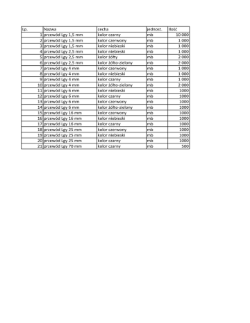 Lp. Nazwa cecha jednost. Ilość 1 przewód Lgy 1,5 mm kolor czarny