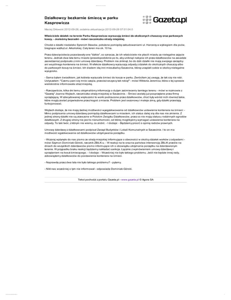 27. 09. 2012 Działkowcy bezkar nie śm iecą w par ku Kaspr owicza Działkowcy bezkarnie śmiecą w parku Kasprowicza Maciej Orłowski 2012-09-26, ostatnia aktualizacja 2012-09-26 07:01:04.0 Właściciele działek na terenie Parku Kasprowicza wyrzucają śmieci do okolicznych chaszczy oraz parkowych koszy. - Jesteśmy bezradni - mówi rzeczniczka straży miejskiej. Chodzi o działki niedaleko Syrenich Stawów, położone pomiędzy zabudowaniami ul. Harcerzy a wybiegiem dla psów, biegnące wzdłuż ul. Arkońskiej. Cały teren ma ok. 10 ha. Przez dziesięciolecia pozostawały one "dzikie", co oznacza, że ich właściciele nie płacili miastu za nielegalne zajęcie terenu. Jednak dwa lata temu miasto (prawdopodobnie po to, aby uniknąć nabycia ich przez działkowców na zasadzie zasiedzenia) podpisało z nimi umowę dzierżawy. Problem nie zniknął, bo do dziś działki nie mają swojego zarządcy ani wspólnego kontenera na śmieci. W efekcie działkowcy wyrzucają odpady z działek do okolicznych chaszczy albo do parkowych koszy na śmieci. Ich śladem idą inni mieszkańcy Szczecina, którzy urządzili sobie w okolicy nielegalne wysypisko. - Sama byłam świadkiem, jak kobieta wyrzucała śmieci do kosza w parku. Zwróciłam jej uwagę, że tak się nie robi. Usłyszałam: "Czemu pani się mnie czepia, przecież wszyscy tak robią!" - mówi Wiktoria Jeremicz, która o tej sprawie wielokrotnie informowała straż miejską. - Rzeczywiście, kilka dni temu otrzymaliśmy informację o dużym zaśmieceniu tamtego terenu - mówi w rozmowie z "Gazetą" Joanna Wojtach, rzeczniczka straży miejskiej w Szczecinie. - Śmieci zostały już posprzątane przez firmę sprzątającą. W zdecydowanej większości to worki podrzucone przez działkowców, choć były wśród nich również takie, które mogły zostać przywiezione przez kogoś z miasta. Problem jest sezonowy i maleje zimą, gdy działki przestają funkcjonować. Wojtach dodaje, że nie mają żadnej możliwości wyegzekwowania od działkowców ustawienia kontenera na śmieci: Mimo podpisania umowy dzierżawy pomiędzy działkowcami a miastem, ich status dalej się dla nas nie zmienia. Z jednej strony działki nie są zrzeszone w Polskim Związku Działkowców, przez co nie mają statusu rodzinnych ogrodów działkowych. Z drugiej strony nie jest to nieruchomość, od której moglibyśmy wymagać ustawienia kontenera na odpady. To taki twór, z którym nie wiemy, co zrobić. - I dodaje: - Będziemy prosić o opinię radców prawnych. Umowę dzierżawy z działkowcami podpisał Zarząd Budynków i Lokali Komunalnych w Szczecinie. I to on ma możliwość egzekwowania od działkowców utrzymywania porządku. - Wczoraj wpłynęło do nas pismo ze straży miejskiej informujące o obecności w okolicy działek worków z odpadami mówi Szymon Dominiak-Górski, rzecznik ZBiLK-u. - W reakcji na to oraz na państwa interwencję ZBLiK prześle na dniach do wszystkich dzierżawców pismo informujące ich o obowiązku utrzymania porządku na dzierżawionym terenie. W przypadku braku reakcji będziemy nakładać sankcje. Łącznie z wymówieniem umowy dzierżawy i sprzątaniem na koszt śmiecącego. - I dodaje: - Wcześniej nie było takiego problemu. Jeśli nie będzie innej rady, zobowiążemy działkowców do postawienia kontenera na śmieci. - Naprawdę przez dwa lata nie było takiego problemu? - pytamy. - Nikt nas wcześniej o tym nie informował - odpowiada Dominiak-Górski. Tekst pochodzi z portalu Gazeta.pl - www.gazeta.pl © Agora SA szczecin. gazet a. pl/ szczecin/ 2029020, 34959, 12554686. ht m l 1/ 1