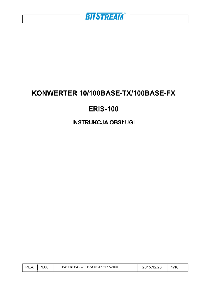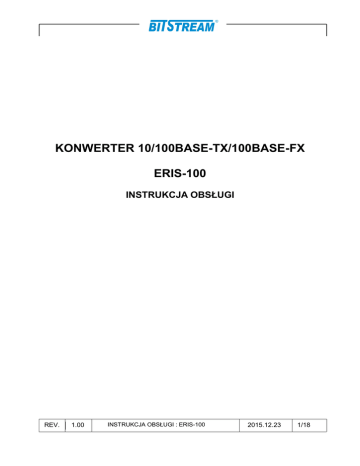KONWERTER 10/100BASE-TX/100BASE-FX ERIS-100 INSTRUKCJA OBSŁUGI REV. 1.00 . INSTRUKCJA OBSŁUGI : ERIS-100 2015.12.23 1/18 SPIS TREŚCI 1 CHARAKTERYSTYKA OGÓLNA.........................................................................................1 1.1 WIDOK URZĄDZENIA......................................................................................................................1 1.2 PRZEZNACZENIE URZĄDZENIA.........................................................................................................1 1.3 PRZYKŁADOWE SPOSOBY WYKORZYSTANIA KONWERTERA ...............................................................2 2 ZŁĄCZA I KONFIGURACJA URZĄDZENIA......................................................................3 2.1 ZŁĄCZA.........................................................................................................................................3 2.2 KONFIGURACJA..............................................................................................................................4 2.3 TRYBY PRACY URZĄDZENIA............................................................................................................6 3 SYGNALIZACJA......................................................................................................................7 4 OPIS FUNKCJONALNY........................................................................................................10 5 INSTALACJA I OBSŁUGA...................................................................................................10 5.1 WARUNKI PRACY.........................................................................................................................10 5.2 INSTALACJA.................................................................................................................................10 5.3 ZASADY POSŁUGIWANIA SIĘ ZŁĄCZAMI ŚWIATŁOWODOWYMI...........................................................12 5.4 ZASIĘG TRANSMISJI......................................................................................................................12 5.5 ZASILANIE ..................................................................................................................................12 6 DANE TECHNICZNE.............................................................................................................12 6.1 PARAMETRY TRANSMISJI...............................................................................................................12 6.2 PARAMETRY ELEKTRYCZNE STYKU 100BASE-TX..........................................................................12 6.3 PARAMETRY MECHANICZNE..........................................................................................................13 6.4 WYMAGANIA ŚRODOWISKOWE......................................................................................................13 6.4.1 Eksploatacja.......................................................................................................................13 6.4.2 Transport............................................................................................................................13 6.5 KOMPATYBILNOŚĆ ELEKTROMAGNETYCZNA...................................................................................14 6.6 ZASILANIE...................................................................................................................................14 6.7 KOMPLETACJA WYROBU...............................................................................................................14 REV. 1.00 . INSTRUKCJA OBSŁUGI : ERIS-100 2015.12.23 2/18 Bezpieczeństwo użytkowania Urządzenia ERIS-100, w zakresie bezpieczeństwa zaprojektowane zgodnie z III klasą normy PN-EN 60950. użytkowania, zostało Urządzenie nie posiada wmontowanego układu rozłączającego. Układ taki powinien znajdować się na zewnątrz urządzenia. W przypadku, kiedy urządzenie jest zasilane ze źródła prądu stałego, łatwo dostępny układ rozłączający powinien być wmontowany w stałe okablowanie na zewnątrz urządzenia. Uwaga: Urządzenie ERIS-100 jest nadajnikiem laserowym. przewidziane do pracy z Promieniowanie emitowane przez nadajnik laserowy jest szkodliwe dla wzroku ! Pod żadnym pozorem nie należy patrzeć na nieosłonięte gniazdo, do którego nie jest dołączone złącze światłowodowe. Producent nie odpowiada za stosowanie urządzenia niezgodnie z instrukcją obsługi. Instrukcja obsługi jest integralną częścią urządzenia i wraz z nim jest przekazywana użytkownikom. REV. 1.00 . INSTRUKCJA OBSŁUGI : ERIS-100 2015.12.23 3/18 1 Charakterystyka ogólna 1.1 WIDOK URZĄDZENIA Rysunek 1. Widok urządzenia. 1.2 PRZEZNACZENIE URZĄDZENIA Konwerter ERIS-100 umożliwia realizację połączenia pomiędzy urządzeniem wyposażonym w styk 10/100BASE-TX a urządzeniem wyposażonym w styk 100BASE-FX lub pomiędzy dwoma dowolnymi urządzeniami wyposażonymi w styki Ethernet 10/100BASE-TX. W zależności od zastosowanego modułu SFP urządzenia umożliwiają realizację połączenia z wykorzystaniem dwóch włókien światłowodu jednomodowego lub wielomodowego albo jednego włókna światłowodu jednomodowego. Konwerter ERIS-100 w pełni odpowiada standardowi IEEE 802.3u 100BASETX/FX. Zastosowanie konwertera ERIS-100 pozwala wydłużyć segment sieci do ponad 100 km (zależne od zastosowanego modułu SFP) przy pracy w trybie “full duplex” i użyciu światłowodu jednomodowego. Zmiana elektrycznego medium transmisyjnego na światłowodowe pozwala na zwiększenie zasięgu transmisji oraz całkowite wyeliminowanie wpływu oddziaływań zakłócających, takich jak: pole elektromagnetyczne, prądy błądzące, różnice potencjałów uziemień itp. REV. 1.00 . INSTRUKCJA OBSŁUGI : ERIS-100 2015.12.23 1/18 1.3 PRZYKŁADOWE SPOSOBY WYKORZYSTANIA KONWERTERA Rysunek 2. Zastosowanie konwerterów ERIS-100 do światłowodowego połączenia punkt-pu