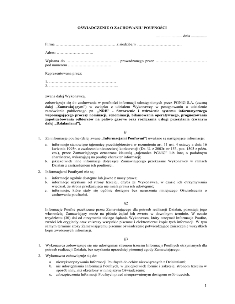 OŚWIADCZENIE O ZACHOWANIU POUFNOŚCI ........................... dnia ................ Firma ……………………..…………………z siedzibą w ……………………………. Adres: ………………………. Wpisana do …………………………………. prowadzonego przez ………………………………… pod numerem …………………………… Reprezentowana przez: 1. …………………………………………… 2. …………………………………………….. zwana dalej Wykonawcą, zobowiązuje się do zachowania w poufności informacji udostępnionych przez PGNiG S.A. (zwaną dalej „Zamawiającym”) w związku z udziałem Wykonawcy w postępowaniu o udzielenie zamówienia publicznego pn. „NRB” - Stworzenie i wdrożenie systemu informatycznego wspomagającego procesy nominacji, renominacji, bilansowania operatywnego, prognozowania zapotrzebowania odbiorców na paliwo gazowe oraz rozliczania usługi przesyłania (zwanym dalej „Działaniami”). §1 1. Za informacje poufne (dalej zwane „Informacjami Poufnymi”) uważane są następujące informacje: a. b. 2. informacje stanowiące tajemnicę przedsiębiorstwa w rozumieniu art. 11 ust. 4 ustawy z dnia 16 kwietnia 1993r. o zwalczaniu nieuczciwej konkurencji (Dz. U. z 2003r. nr 153, poz. 1503 z późn. zm.), przez Zamawiającego oznaczane klauzulą „tajemnica PGNiG” lub inną o podobnym charakterze, wskazującą na poufny charakter informacji; jakiekolwiek inne informacje dotyczące Zamawiającego przekazane Wykonawcy w ramach Działań z zastrzeżeniem ich poufności. Informacjami Poufnymi nie są: a. b. c. informacje ogólnie dostępne lub jawne z mocy prawa; informacje uzyskane od strony trzeciej, chyba że Wykonawca, w czasie ich otrzymywania wiedział, że strona przekazująca nie miała prawa ich udostępnić; informacje, które stały się ogólnie dostępne bez naruszenia niniejszego Oświadczenia o zachowaniu poufności. §2 Informacje Poufne przekazane przez Zamawiającego dla potrzeb realizacji Działań, pozostają jego własnością. Zamawiający może na piśmie żądać ich zwrotu w dowolnym terminie. W czasie trzydziestu (30) dni od otrzymania takiego żądania Wykonawca, który otrzymał Informacje Poufne, zwróci ich oryginały oraz zniszczy wszystkie pisemne i elektroniczne kopie tych informacji. W tym samym terminie złoży Zamawiającemu pisemne oświadczenie potwierdzające zniszczenie wszystkich kopii zwróconych informacji. §3 1. Wykonawca zobowiązuje się nie udostępniać stronom trzecim Informacji Poufnych otrzymanych dla potrzeb realizacji Działań, bez uzyskania uprzedniej pisemnej zgody Zamawiającego. 2. Wykonawca zobowiązuje się do: a. niewykorzystywania Informacji Poufnych do celów niezwiązanych z Działaniami; b. nie udostępniania Informacji Poufnych, w jakiejkolwiek formie i zakresie, stronom trzecim w sposób inny, niż określony w niniejszym Oświadczeniu; c. zabezpieczenia Informacji Poufnych przed nieuprawnionym dostępem osób trzecich. 1 3. Jeżeli w czasie obowiązywania Oświadczenia konieczne będzie udostępnienie Informacji Poufnych stronom trzecim, to udostępnienie powinno być dokonane z uwzględnieniem postanowień ust. 1 i tylko do celów związanych z Działaniami, zakres informacji powinien być ograniczony do niezbędnego minimum, a Wykonawca zobowiąże strony trzecie do zachowania poufności tych informacji. 4. Jeżeli zgodnie z obowiązującym prawem, na skutek działań organów administracji rządowej lub samorządowej, nakazów sądowych i administracyjnych muszą zostać udostępnione lub ujawnione Informacje Poufne udostępniane dla potrzeb realizacji Działań, Wykonawca może te informacje przekazać jedynie w wymaganym zakresie, a o przekazaniu powiadomić Zamawiającego w terminie dwóch (2) dni roboczych. §4 1. Wykonawca przyjmuje na siebie pełną odpowiedzialność za wszelkie szkody spowodowane dokonanymi przez siebie działaniami lub zaniechaniami, stanowiącymi naruszenie niniejszego Oświadczenia. 2. W szczególności Wykonawca uznaje, że Informacje Poufne otrzymane dla potrzeb realizacji Działań stanowią dobro Zamawiającego, a ich ujawnienie lub wykorzystanie wbrew postanowieniom Oświadczenia stanowić będzie czyn nieuczciwej konkurencji w rozumieniu przepisów ustawy z 16 kwietnia 1993r. o zwalczaniu nieuczciwej konkurencji (tj. Dz. U. z 2003r. nr 153 poz. 1503, z późn. zm.). 3. Wykonawca będzie ponosić odpowiedzialność jak za własne działania, za działania swoich dostawców, odbiorców, współpracowników, podwykonawców oraz innych osób, które uzyskają od niego informacje wymienione w §1 niniejszego Oświadczenia. 4. W przypadku niedotrzymania postanowień Oświadczenia przez Wykonawcę, Zamawiający może żądać łącznie lub według swojego wyboru: a. zaniechania niedozwolonych działań; b. usunięcia skutków niedozwolonych działań; c. złożenia jednokrotnego lub wielokrotnego oświadczenia odpowiedniej treści i w odpowiedniej formie; d. naprawienia wyrządzonej szkody, na zasadach ogólnych. §5 Oświadczenie wchodzi w życie z dniem podpisania i będzie stosowane do Informacji Poufnych udostępnionych Wykonawcy w związku z realizacją Działań - przez okres prowadzenia Działań oraz dodatkowo przez pięć (5) lat od zakończenia Działań. ………………………………………………………………….. Wykonawca 2