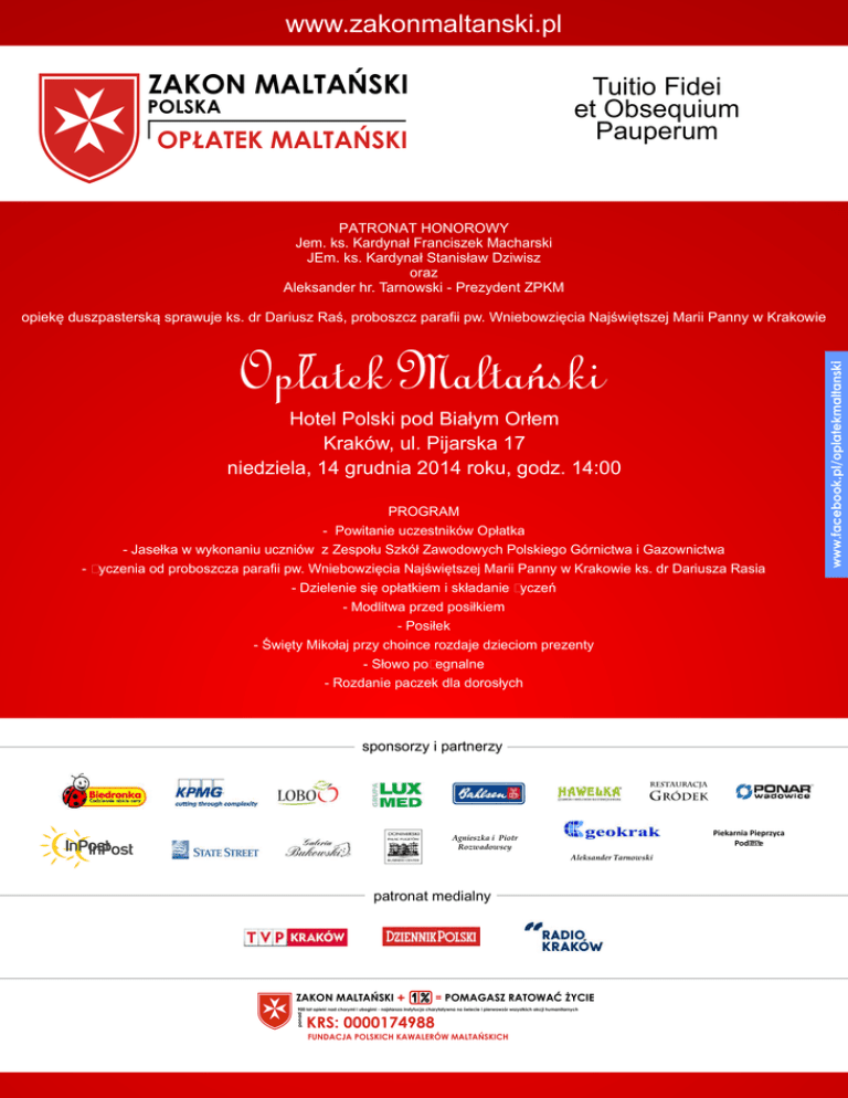 www.zakonmaltanski.pl ZAKON MALTAŃSKI Tuitio Fidei et Obsequium Pauperum POLSKA OPŁATEK MALTAŃSKI PATRONAT HONOROWY Jem. ks. Kardynał Franciszek Macharski JEm. ks. Kardynał Stanisław Dziwisz oraz Aleksander hr. Tarnowski - Prezydent ZPKM Hotel Polski pod Białym Orłem Kraków, ul. Pijarska 17 niedziela, 14 grudnia 2014 roku, godz. 14:00 PROGRAM - Powitanie uczestników Opłatka - Jasełka w wykonaniu uczniów z Zespołu Szkół Zawodowych Polskiego Górnictwa i Gazownictwa - Życzenia od proboszcza parafii pw. Wniebowzięcia Najświętszej Marii Panny w Krakowie ks. dr Dariusza Rasia - Dzielenie się opłatkiem i składanie życzeń - Modlitwa przed posiłkiem - Posiłek - Święty Mikołaj przy choince rozdaje dzieciom prezenty - Słowo pożegnalne - Rozdanie paczek dla dorosłych sponsorzy i partnerzy Piekarnia Pieprzyca Podłęże Agnieszka i Piotr Rozwadowscy Aleksander Tarnowski patronat medialny ZAKON MALTAŃSKI + = POMAGASZ RATOWAĆ ŻYCIE ponad 900 lat opieki nad chorymi i ubogimi - najstarsza instytucja charytatywna na świecie i pierwowzór wszystkich akcji humanitarnych FUNDACJA POLSKICH KAWALERÓW MALTAŃSKICH www.facebook.pl/oplatekmaltanski opiekę duszpasterską sprawuje ks. dr Dariusz Raś, proboszcz parafii pw. Wniebowzięcia Najświętszej Marii Panny w Krakowie