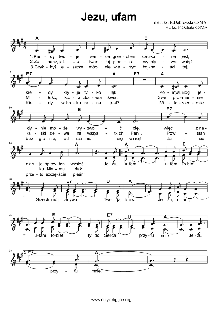 Jezu, ufam A 6 8 1. Kie dy two 2. Zo bacz, jak 3. Czyż byś je 5 E7 kie Mi Kie 10 dy ła bez nie mo ski zle gra nic, że wa od 14 dzie i prze 26 je z o szcze ser twar mógł Grzech mój przy chem si rzyć zbru ka wy pły hoj no E7 ne wa ści je tyl ra zba ku ra ko wia na lęk. świat. jest? Po Swe Mi E wy zwo na wszys sła nia A zmywa lić tkich się cię, Pan... w niej! D Two ją A krew. 1. E7 Ty do Ser ca tul myśl, Bóg pro mie ło sier E7 mnie. www.nuty.religijne.org je nie dzie więc Pow Za z na stań nuć E u fam To bie! u fam, Je zu, przy tul A Je zu, mnie. A A u fam, Je zu, E7 jest, wciąż. tej, A 33 2. E7 E u fam To bie! ce grze tej pier nie wie E ją śpiew ten wznieś. ku Nie mu dąż. to szczę ścia pieśń! 20 A dy kry łość, któ dy w bo mel.: ks. R.Dąbrowski CSMA sł.: ks. F.Ochała CSMA