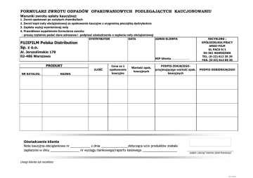 FORMULARZ ZWROTU ODPADÓW OPAKOWANIOWYCH PODLEGAJĄCYCH KAUCJONOWANIU Warunki zwrotu opłaty kaucyjnej: 1. Zwrot opakowań po zużytych chemikaliach 2. Zwrot kopii noty obciążeniowej za opakowania kaucyjne z oryginalną pieczątką dystrybutora 3. Zapłata wyżej wymienionej noty 4. Prawidłowe wypełnienie formularza zwrotu: - proszę czytelnie podać dane adresowe i podpisać oświadczenie o zapłacie noty obciążeniowej DYSTRYBUTOR DATA ADRES KLIENTA FUJIFILM Polska Distribution Sp. z o.o. Al. Jerozolimskie 178 02-486 Warszawa NIP klienta............................ PRODUKT ILOŚĆ NR KATALOG. NAZWA Cena za 1 opakowanie kaucyjne Wartość opak. kaucyjnych PODPIS ZDAJĄCEGOprzyjmującego wartość opak. kaucyjnych Oświadczenie klienta Nota kaucyjna obciążeniowa nr ___________ z dnia _______________dotycząca w/w produktów została zapłacona w dniu ________________ nr wyciągu bankowego/raportu kasowego ___________________ RECYKLING : SPÓŁDZIELNIA PRACY ARGO-FILM UL PACA 9/1 04-361 WARSZAWA TEL. (0-22) 612 35 29 FAX. (0-22) 612 06 36 PODPIS ODBIERAJĄCEGO podpis i pieczęć imienna (dział finansowy) Uwagi klienta lub recyklera: WO v. 02'05 v.2