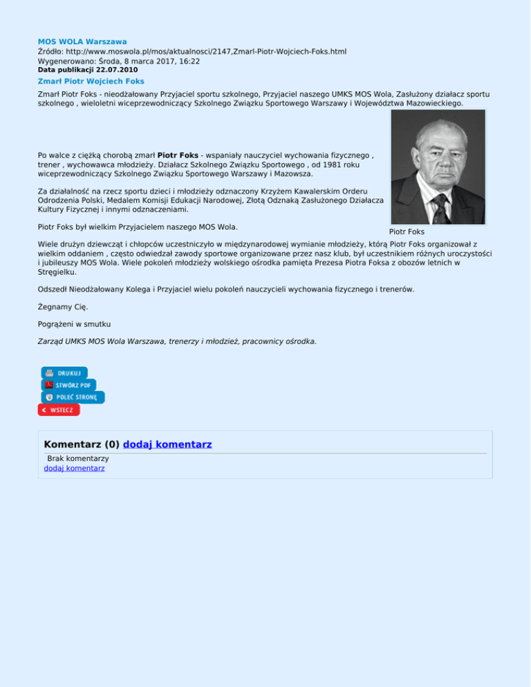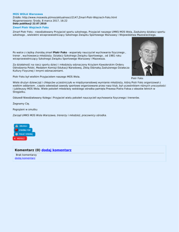MOS WOLA Warszawa Źródło: http://www.moswola.pl/mos/aktualnosci/2147,Zmarl-Piotr-Wojciech-Foks.html Wygenerowano: Środa, 8 marca 2017, 16:22 Data publikacji 22.07.2010 Zmarł Piotr Wojciech Foks Zmarł Piotr Foks - nieodżałowany Przyjaciel sportu szkolnego, Przyjaciel naszego UMKS MOS Wola, Zasłużony działacz sportu szkolnego , wieloletni wiceprzewodniczący Szkolnego Związku Sportowego Warszawy i Województwa Mazowieckiego. Po walce z ciężką chorobą zmarł Piotr Foks - wspaniały nauczyciel wychowania fizycznego , trener , wychowawca młodzieży. Działacz Szkolnego Związku Sportowego , od 1981 roku wiceprzewodniczący Szkolnego Związku Sportowego Warszawy i Mazowsza. Za działalność na rzecz sportu dzieci i młodzieży odznaczony Krzyżem Kawalerskim Orderu Odrodzenia Polski, Medalem Komisji Edukacji Narodowej, Złotą Odznaką Zasłużonego Działacza Kultury Fizycznej i innymi odznaczeniami. Piotr Foks był wielkim Przyjacielem naszego MOS Wola. Piotr Foks Wiele drużyn dziewcząt i chłopców uczestniczyło w międzynarodowej wymianie młodzieży, którą Piotr Foks organizował z wielkim oddaniem , często odwiedzał zawody sportowe organizowane przez nasz klub, był uczestnikiem różnych uroczystości i jubileuszy MOS Wola. Wiele pokoleń młodzieży wolskiego ośrodka pamięta Prezesa Piotra Foksa z obozów letnich w Stręgielku. Odszedł Nieodżałowany Kolega i Przyjaciel wielu pokoleń nauczycieli wychowania fizycznego i trenerów. Żegnamy Cię. Pogrążeni w smutku Zarząd UMKS MOS Wola Warszawa, trenerzy i młodzież, pracownicy ośrodka. Komentarz (0) dodaj komentarz Brak komentarzy dodaj komentarz