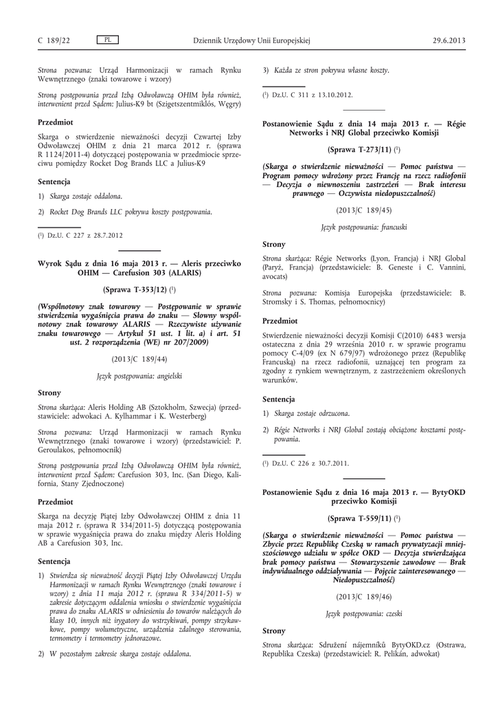C 189/22 PL Dziennik Urzędowy Unii Europejskiej Strona pozwana: Urząd Harmonizacji w Wewnętrznego (znaki towarowe i wzory) ramach Rynku 29.6.2013 3) Każda ze stron pokrywa własne koszty. Stroną postępowania przed Izbą Odwoławczą OHIM była również, interwenient przed Sądem: Julius-K9 bt (Szigetszentmiklós, Węgry) (1) Dz.U. C 311 z 13.10.2012. Przedmiot Postanowienie Sądu z dnia 14 maja 2013 r. — Régie Networks i NRJ Global przeciwko Komisji Skarga o stwierdzenie nieważności decyzji Czwartej Izby Odwoławczej OHIM z dnia 21 marca 2012 r. (sprawa R 1124/2011-4) dotyczącej postępowania w przedmiocie sprze ciwu pomiędzy Rocket Dog Brands LLC a Julius-K9 Sentencja 1) Skarga zostaje oddalona. (Sprawa T-273/11) (1) (Skarga o stwierdzenie nieważności — Pomoc państwa — Program pomocy wdrożony przez Francję na rzecz radiofonii — Decyzja o niewnoszeniu zastrzeżeń — Brak interesu prawnego — Oczywista niedopuszczalność) (2013/C 189/45) 2) Rocket Dog Brands LLC pokrywa koszty postępowania. (1) Dz.U. C 227 z 28.7.2012 Wyrok Sądu z dnia 16 maja 2013 r. — Aleris przeciwko OHIM — Carefusion 303 (ALARIS) (Sprawa T-353/12) (1) (Wspólnotowy znak towarowy — Postępowanie w sprawie stwierdzenia wygaśnięcia prawa do znaku — Słowny wspól notowy znak towarowy ALARIS — Rzeczywiste używanie znaku towarowego — Artykuł 51 ust. 1 lit. a) i art. 51 ust. 2 rozporządzenia (WE) nr 207/2009) (2013/C 189/44) Język postępowania: angielski Strony Strona skarżąca: Aleris Holding AB (Sztokholm, Szwecja) (przed stawiciele: adwokaci A. Kylhammar i K. Westerberg) Język postępowania: francuski Strony Strona skarżąca: Régie Networks (Lyon, Francja) i NRJ Global (Paryż, Francja) (przedstawiciele: B. Geneste i C. Vannini, avocats) Strona pozwana: Komisja Europejska Stromsky i S. Thomas, pełnomocnicy) (przedstawiciele: B. Przedmiot Stwierdzenie nieważności decyzji Komisji C(2010) 6483 wersja ostateczna z dnia 29 września 2010 r. w sprawie programu pomocy C-4/09 (ex N 679/97) wdrożonego przez (Republikę Francuską) na rzecz radiofonii, uznającej ten program za zgodny z rynkiem wewnętrznym, z zastrzeżeniem określonych warunków. Sentencja 1) Skarga zostaje odrzucona. Strona pozwana: Urząd Harmonizacji w ramach Rynku Wewnętrznego (znaki towarowe i wzory) (przedstawiciel: P. Geroulakos, pełnomocnik) 2) Régie Networks i NRJ Global zostają obciążone kosztami postę powania. Stroną postępowania przed Izbą Odwoławczą OHIM była również, interwenient przed Sądem: Carefusion 303, Inc. (San Diego, Kali fornia, Stany Zjednoczone) (1) Dz.U. C 226 z 30.7.2011. Przedmiot Skarga na decyzję Piątej Izby Odwoławczej OHIM z dnia 11 maja 2012 r. (sprawa R 334/2011-5) dotyczącą postępowania w sprawie wygaśnięcia prawa do znaku między Aleris Holding AB a Carefusion 303, Inc. Sentencja 1) Stwierdza się nieważność decyzji Piątej Izby Odwoławczej Urzędu Harmonizacji w ramach Rynku Wewnętrznego (znaki towarowe i wzory) z dnia 11 maja 2012 r. (sprawa R 334/2011-5) w zakresie dotyczącym oddalenia wniosku o stwierdzenie wygaśnięcia prawa do znaku ALARIS w odniesieniu do towarów należących do klasy 10, innych niż irygatory do wstrzykiwań, pompy strzykaw kowe, pompy wolumetryczne, urządzenia zdalnego sterowania, termometry i termometry jednorazowe. 2) W pozostałym zakresie skarga zostaje oddalona. Postanowienie Sądu z dnia 16 maja 2013 r. — BytyOKD przeciwko Komisji (Sprawa T-559/11) (1) (Skarga o stwierdzenie nieważności — Pomoc państwa — Zbycie przez Republikę Czeską w ramach prywatyzacji mniej szościowego udziału w spółce OKD — Decyzja stwierdzająca brak pomocy państwa — Stowarzyszenie zawodowe — Brak indywidualnego oddziaływania — Pojęcie zainteresowanego — Niedopuszczalność) (2013/C 189/46) Język postępowania: czeski Strony Strona skarżąca: Sdružení nájemníků BytyOKD.cz (Ostrawa, Republika Czeska) (przedstawiciel: R. Pelikán, adwokat)