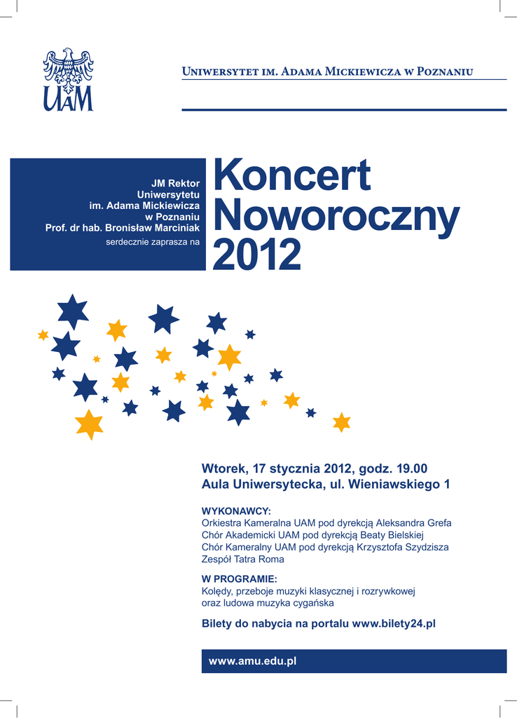 JM Rektor Uniwersytetu im. Adama Mickiewicza w Poznaniu Prof. dr hab. Bronisław Marciniak serdecznie zaprasza na Koncert Noworoczny 2012 Wtorek, 17 stycznia 2012, godz. 19.00 Aula Uniwersytecka, ul. Wieniawskiego 1 WYKONAWCY: Orkiestra Kameralna UAM pod dyrekcją Aleksandra Grefa Chór Akademicki UAM pod dyrekcją Beaty Bielskiej Chór Kameralny UAM pod dyrekcją Krzysztofa Szydzisza Zespół Tatra Roma W PROGRAMIE: Kolędy, przeboje muzyki klasycznej i rozrywkowej oraz ludowa muzyka cygańska Bilety do nabycia na portalu www.bilety24.pl www.amu.edu.pl