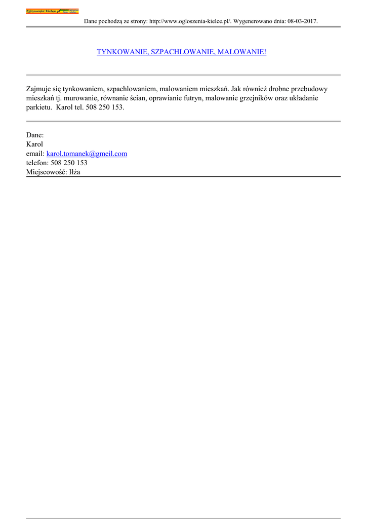 Dane pochodzą ze strony: http://www.ogloszenia-kielce.pl/. Wygenerowano dnia: 08-03-2017. TYNKOWANIE, SZPACHLOWANIE, MALOWANIE! Zajmuje się tynkowaniem, szpachlowaniem, malowaniem mieszkań. Jak również drobne przebudowy mieszkań tj. murowanie, równanie ścian, oprawianie futryn, malowanie grzejników oraz układanie parkietu. Karol tel. 508 250 153. Dane: Karol email: [email protected] telefon: 508 250 153 Miejscowość: Iłża