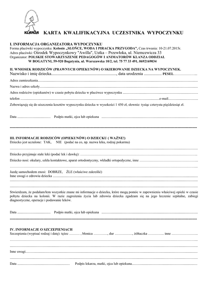 KARTA KWALIFIKACYJNA UCZESTNIKA WYPOCZYNKU I. INFORMACJA ORGANIZATORA WYPOCZYNKU Forma placówki wypoczynku: Kolonie „SŁOŃCE, WODA I PIRACKA PRZYGODA”, Czas trwania: 10-21.07.2015r. Adres placówki: Ośrodek Wypoczynkowy "Awilla", Ustka – Przewłoka, ul. Niemcewicza 33 Organizator: POLSKIE STOWARZYSZENIE PEDAGOGÓW I ANIMATORÓW KLANZA ODDZIAŁ W BOGATYNI, 59-920 Bogatynia, ul. Warszawska 10/2, tel. 75 77 33 491, 0692169034 II. WNIOSEK RODZICÓW (PRAWNYCH OPIEKUNÓW) O SKIEROWANIE DZIECKA NA WYPOCZYNEK. Nazwisko i imię dziecka.............................................................., data urodzenia ................. PESEL………………... Adres zamieszkania....................................................................................................................................................................................... Nazwa i adres szkoły..................................................................................................................................................................................... Adres rodziców (opiekunów) w czasie pobytu dziecka w placówce wypoczynku ...................................................................................... telefon ...............................................................................................................................................................e-mail.................................. Zobowiązuję się do uiszczenia kosztów wypoczynku dziecka w wysokości 1 450 zł, słownie: tysiąc czterysta pięćdziesiąt zł. Data ...................................... Podpis matki, ojca lub opiekuna .............................................................................................................. -------------------------------------------------------------------------------------------------------------------------------------III. INFORMACJE RODZICÓW (OPIEKUNÓW) O DZIECKU ( WAŻNE!) Dziecko jest uczulone: TAK, NIE (podać na co, np. nazwa leku, rodzaj pokarmu) ....................................................................................................................................................................................................................... Dziecko przyjmuje stałe leki (podać lek i dawkę): ……………………………………………………………………………………….. Dziecko nosi: okulary, szkła kontaktowe, aparat ortodontyczny, wkładki ortopedyczne, inne …………………………………………... ……………………………………………………………………………………………………………………………………………... Jazdę samochodem znosi: DOBRZE, ŹLE (właściwe zakreślić) Inne uwagi o zdrowiu dziecka ...................................................................................................................................................................... ....................................................................................................................................................................................................................... ....................................................................................................................................................................................................................... Stwierdzam, że podałam/łem wszystkie znane mi informacje o dziecku, które mogą pomóc w zapewnieniu właściwej opieki w czasie pobytu dziecka na kolonii. W razie zagrożenia życia lub zdrowia dziecka zgadzam się na jego leczenie szpitalne, zabiegi diagnostyczne, operacje i podawanie leków. Data ...................................... Podpis matki, ojca lub opiekuna .............................................................................................................. -------------------------------------------------------------------------------------------------------------------------------------IV. INFORMACJE O SZCZEPIENIACH Szczepienia (wypisać rodzaj i datę): tężec ……… , błonica …………, dur ……………, żółtaczka ………….. inne ………………….. ……………………………………………………………………………………………………………………………………………... ....................................................................................................................................................................................................................... Inne uwagi..................................................................................................................................................................................................... ....................................................................................................................................................................................................................... Data ............................................................ Podpis lekarza, matki, ojca lub opiekuna........................................................................... V. INFORMACJA WYCHOWAWCY KLASY O UCZNIU Uczestnik kolonii................................................ jest uczniem klasy........................................................................................................... Opinia:........................................................................................................................................................................................................... ....................................................................................................................................................................................................................... ..............................................................................................................................................