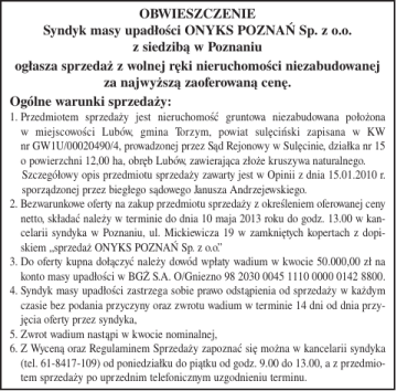 OBWIESZCZENIE Syndyk masy upadłości ONYKS POZNAŃ Sp. z o.o. z siedzibą w Poznaniu ogłasza sprzedaż z wolnej ręki nieruchomości niezabudowanej za najwyższą zaoferowaną cenę. Ogólne warunki sprzedaży: 1. Przedmiotem sprzedaży jest nieruchomość gruntowa niezabudowana położona w miejscowości Lubów, gmina Torzym, powiat sulęciński zapisana w KW nr GW1U/00020490/4, prowadzonej przez Sąd Rejonowy w Sulęcinie, działka nr 15 o powierzchni 12,00 ha, obręb Lubów, zawierająca złoże kruszywa naturalnego. Szczegółowy opis przedmiotu sprzedaży zawarty jest w Opinii z dnia 15.01.2010 r. sporządzonej przez biegłego sądowego Janusza Andrzejewskiego. 2. Bezwarunkowe oferty na zakup przedmiotu sprzedaży z określeniem oferowanej ceny netto, składać należy w terminie do dnia 10 maja 2013 roku do godz. 13.00 w kancelarii syndyka w Poznaniu, ul. Mickiewicza 19 w zamkniętych kopertach z dopiskiem „sprzedaż ONYKS POZNAŃ Sp. z o.o.” 3. Do oferty kupna dołączyć należy dowód wpłaty wadium w kwocie 50.000,00 zł na konto masy upadłości w BGŻ S.A. O/Gniezno 98 2030 0045 1110 0000 0142 8800. 4. Syndyk masy upadłości zastrzega sobie prawo odstąpienia od sprzedaży w każdym czasie bez podania przyczyny oraz zwrotu wadium w terminie 14 dni od dnia przyjęcia oferty przez syndyka, 5. Zwrot wadium nastąpi w kwocie nominalnej, 6. Z Wyceną oraz Regulaminem Sprzedaży zapoznać się można w kancelarii syndyka (tel. 61-8417-109) od poniedziałku do piątku od godz. 9.00 do 13.00, a z przedmiotem sprzedaży po uprzednim telefonicznym uzgodnieniu terminu.