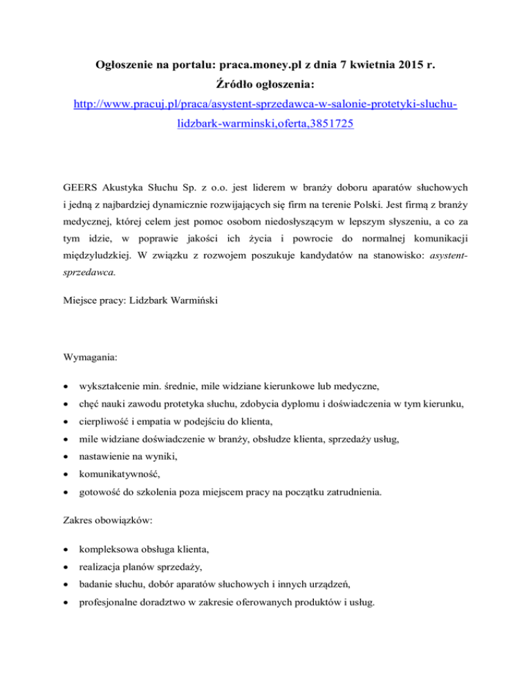 Ogłoszenie na portalu: praca.money.pl z dnia 7 kwietnia 2015 r. Źródło ogłoszenia: http://www.pracuj.pl/praca/asystent-sprzedawca-w-salonie-protetyki-sluchulidzbark-warminski,oferta,3851725 GEERS Akustyka Słuchu Sp. z o.o. jest liderem w branży doboru aparatów słuchowych i jedną z najbardziej dynamicznie rozwijających się firm na terenie Polski. Jest firmą z branży medycznej, której celem jest pomoc osobom niedosłyszącym w lepszym słyszeniu, a co za tym idzie, w poprawie jakości ich życia i powrocie do normalnej komunikacji międzyludzkiej. W związku z rozwojem poszukuje kandydatów na stanowisko: asystentsprzedawca. Miejsce pracy: Lidzbark Warmiński Wymagania: wykształcenie min. średnie, mile widziane kierunkowe lub medyczne, chęć nauki zawodu protetyka słuchu, zdobycia dyplomu i doświadczenia w tym kierunku, cierpliwość i empatia w podejściu do klienta, mile widziane doświadczenie w branży, obsłudze klienta, sprzedaży usług, nastawienie na wyniki, komunikatywność, gotowość do szkolenia poza miejscem pracy na początku zatrudnienia. Zakres obowiązków: kompleksowa obsługa klienta, realizacja planów sprzedaży, badanie słuchu, dobór aparatów słuchowych i innych urządzeń, profesjonalne doradztwo w zakresie oferowanych produktów i usług. Firma oferuje: interesującą pracę w zespole w nowoczesnej firmie, stabilne zatrudnienie w oparciu o umowę o pracę w firmie o ugruntowanej pozycji na rynku, atrakcyjny system wynagrodzeń i pakiet socjalny, specjalistyczne szkolenia oraz możliwość zdobycia zawodu protetyka słuchu, zakwaterowanie i zwrot kosztów podróży podczas organizowanych szkoleń, dofinansowanie do nauki w studium protetyki słuchu, możliwość rozwoju zawodowego dla osób wykształconych w tym kierunku. CV wraz ze zdjęciem oraz list motywacyjny prosimy przesyłać na adres: [email protected] w temacie e-maila wpisując nr refencyjny: Nr ref.: PS/Lidzbark Warmiński Prosimy o dołączenie do aplikacji następującej klauzuli „Wyrażam zgodę na przetwarzanie danych osobowych w celach rekrutacji, zgodnie z ustawą z dn. 29.08.97r. o ochronie danych osobowych, Dz.U. Nr 133poz.883”