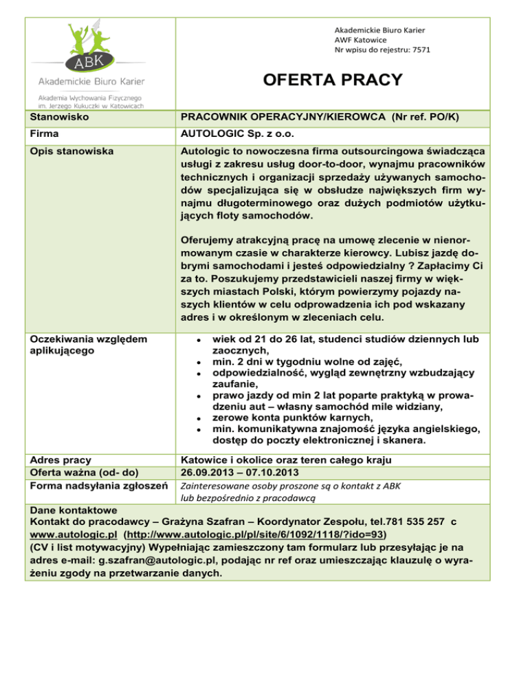 Akademickie Biuro Karier AWF Katowice Nr wpisu do rejestru: 7571 OFERTA PRACY Stanowisko PRACOWNIK OPERACYJNY/KIEROWCA (Nr ref. PO/K) Firma AUTOLOGIC Sp. z o.o. Opis stanowiska Autologic to nowoczesna firma outsourcingowa świadcząca usługi z zakresu usług door-to-door, wynajmu pracowników technicznych i organizacji sprzedaży używanych samochodów specjalizująca się w obsłudze największych firm wynajmu długoterminowego oraz dużych podmiotów użytkujących floty samochodów. Oferujemy atrakcyjną pracę na umowę zlecenie w nienormowanym czasie w charakterze kierowcy. Lubisz jazdę dobrymi samochodami i jesteś odpowiedzialny ? Zapłacimy Ci za to. Poszukujemy przedstawicieli naszej firmy w większych miastach Polski, którym powierzymy pojazdy naszych klientów w celu odprowadzenia ich pod wskazany adres i w określonym w zleceniach celu. Oczekiwania względem aplikującego Adres pracy Oferta ważna (od- do) Forma nadsyłania zgłoszeń wiek od 21 do 26 lat, studenci studiów dziennych lub zaocznych, min. 2 dni w tygodniu wolne od zajęć, odpowiedzialność, wygląd zewnętrzny wzbudzający zaufanie, prawo jazdy od min 2 lat poparte praktyką w prowadzeniu aut – własny samochód mile widziany, zerowe konta punktów karnych, min. komunikatywna znajomość języka angielskiego, dostęp do poczty elektronicznej i skanera. Katowice i okolice oraz teren całego kraju 26.09.2013 – 07.10.2013 Zainteresowane osoby proszone są o kontakt z ABK lub bezpośrednio z pracodawcą Dane kontaktowe Kontakt do pracodawcy – Grażyna Szafran – Koordynator Zespołu, tel.781 535 257 c www.autologic.pl (http://www.autologic.pl/pl/site/6/1092/1118/?ido=93) (CV i list motywacyjny) Wypełniając zamieszczony tam formularz lub przesyłając je na adres e-mail: [email protected], podając nr ref oraz umieszczając klauzulę o wyrażeniu zgody na przetwarzanie danych.