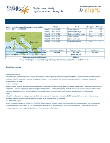Dzień Statek / Linia: Costa neoClassica / Costa Cruises Termin: 23.11 - 28.11.2013 Dzień 1 - 2013-11-23 Port Do portu W morze --- 17.00 Triest (Włochy) Dzień 2 - 2013-11-24 Ancona (Włochy) 9.00 14.00 Dzień 3 - 2013-11-25 Dubrownik (Chorwacja) 8.00 13.00 Dzień 4 - 2013-11-26 Corfu (Grecja) 9.00 14.00 Dzień 5 - 2013-11-27 Dzień na morzu --- --- Dzień 6 - 2013-11-28 Savona (Włochy) 9.00 --- Ceny Kabina: Cena za osobę w kabinie dwuosobowej od: kabina wewnętrzna kabina z oknem apartament 249 Euro 409 Euro 769 Euro Dziecko do 18 lat w kabinie z dwoma dorosłymi osobami:: Opłaty portowe (dorośli i dzieci):: BRAK OPŁAT 90 Euro Ceny orientacyjne. Aby uzyskać cenę aktualną w danym dniu, zadzwoń na nr tel. 511 757 511 Dodatkowe uwagi cena za rejs obejmuje: zakwaterowanie w kabinie wybranej kategorii (5 noclegów); serwis bagażowy i kabinowy; wyżywienie – 3 główne posiłki, przekąski między posiłkami, bufet lub przekąski o północy; korzystanie z basenu i innych urządzeń sportowo-rekreacyjnych; udział we wszystkich imprezach organizowanych na statku. cena nie obejmuje: opłat portowych; kosztów dojazdu do portu; ewentualnych noclegów w hotelu przed/po rejsie i transferów (na zapytanie); wycieczek fakultatywnych; korzystania z punktów usługowych (pralnia, fotograf, salon piękności i odnowy biologicznej, internet); napojów do obiadów i kolacji, drinków oraz napiwków obowiązkowych dla obsługi statku (ok. 7euro/dzień/osobę dorosłą; 3,5euro/dzień/dziecko); ubezpieczenia KL, NW i bagażu. uwagi: kabiny 3/4 osobowe nie są dostępne we wszystkich kategoriach, a ich liczba jest ograniczona – sprzedaż tylko po potwierdzeniu; ceny wycieczek fakultatywnych, propozycje dojazdu do portu, hoteli przed/po rejsie na zapytanie. ALL INCLUSIVE (opcja) istnieje możliwość wykupienia pakietu ALL INCLUSIVE obejmującego wybrane napoje alkoholowe i bezalkoholowe dostępne bez ograniczeń we wszystkich barach. Cena pakietu 19,5 EUR/dzień/osoba dorosła i 10 EUR/dzień/dziecko. Warunkiem skorzystania z pakietu all inclusive jest wykupienie pakietu przez wszystkich pasażerów w kabinie na czas całego rejsu. Costa neoClassica Costa NeoClassica Tonaż: 53.000 ton Rok budowy: 1991 Długość: 212 m Szerokość: 31 m Szybkość: 19 węzłów Pokłady pasażerskie: 11 Załoga: 590 Pasażerowie: 1.680 Basen: 2 (4 jacuzzi) Waluta: EURO Do dyspozycji: restauracje, bary, kasyno, teatr na 2 pokładach, dyskoteka, fitness center, sauna, trasa do joggingu (270m), biblioteka, kawiarenka internetowa, butiki, centrum konferencyjne, pokój zabaw dla dzieci, punkt medyczny. Kabiny: 644 kabiny wyposażone w łazienkę (prysznic, wc, suszarka), klimatyzację, telefon, sejf, mini bar, telewizję satelitarną, radio pokładowe. Na statku znajduje się 10 kabin typu suite, wszystkie z prywatnym balkonem. Costa Classica dysponuje również kabinami, które są przystosowane dla osób niepełnosprawnych. Room Service dostępny 24h na dobę. Zobacz link do strony statku