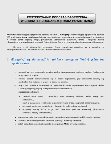 POSTEPOWANIE PODCZAS ZAGROŻENIA WICHURĄ I HURAGANEM (TRĄBĄ POWIETRZNĄ) Wichury (wiatry wiejące z prędkością powyżej 75 km/h.), huragany (wiatry wiejące z prędkością powyżej 120 km/h.) oraz trąby powietrzne (wirowy ruch powietrza, powstający w chmurze burzowej) występujące w Polsce coraz częściej. Mogą powodować uszkodzenie budynków, łamać i wyrywać drzewa z korzeniami oraz paraliżować transport. Najgroźniejszą formę przyjmują w okresie wiosennym i jesiennym. Ochrona przed wichurą lub huraganem (trąbą powietrzną) ogranicza się w zasadzie do zabezpieczenia ludzi i ich mienia oraz do usuwania skutków zdarzenia. 1. Przygotuj się do nadejścia wichury, huraganu (trąby), jeżeli jest spodziewana. upewnij się czy członkowie rodziny wiedzą jak postępować podczas wichury (wyłączania wody, gazu i prądu); opracuj sposób komunikowania się w czasie zagrożenia, gdy członkowie rodziny są rozdzieleni (np. rodzice w pracy a dzieci w szkole); włącz radio (zasilane bateryjnie) na częstotliwości radia regionalnego albo rozgłośni lokalnej i słuchaj prognozy pogody oraz podawanych komunikatów; zabezpiecz swój dom:  zamknij okna drzwi i zabezpiecz inne elementy budynku, które mogą ulec zniszczeniu,  usuń z parapetów i balkonów przedmioty, które mogą zagrażać przechodzącym,  przygotuj zastępcze oświetlenie i baterie do odbiorników radiowych,  przygotuj rzeczy, które mogą być przydatne podczas ewakuacji (dokumenty, żywność, rzeczy wartościowe); pozamykaj zwierzęta oraz odpowiednio zabezpiecz pomieszczenia, w których się znajdują; zaopatrz się w niezbędne leki pierwszej pomocy i materiały sanitarne; jeżeli posiadasz samochód zaopatrz się w paliwo. Może on być potrzebny. 2. W trakcie trwania wichury, huraganu. zachowaj spokój. Nie wychodź na zewnątrz, jeśli nie jest to absolutnie konieczne; włącz radio (zasilane bateryjnie) na częstotliwości radia regionalnego albo rozgłośni lokalnej i słuchaj prognozy pogody oraz podawanych komunikatów; wyłącz główny wyłącznik prądu i zamknij główny zawór gazu – ograniczy to niebezpieczeństwo powstania pożaru (wybuchu gazu); schowaj się w środkowych i najniższych partiach budynku z dala od oszklonych okien, sufitów i drzwi; jeśli znajdziesz się z dala od domu:  pozostań tam, gdzie jesteś, dopóki wichura nie przejdzie,  nie zatrzymuj się pod trakcjami elektrycznymi, planszami reklamowymi i drzewami,  nie poruszaj się pod balkonami - spadające doniczki, kwietniki lub szyby okienne mogę Cię dotkliwie poranić; jadąc samochodem zatrzymaj go w możliwie bezpiecznym miejscu; jeśli służby ratownicze zalecą ewakuację:  wyrusz tak szybko, jak to tylko możliwe,  opuszczając mieszkanie sprawdź wyłączenie energii elektrycznej, głównego zaworu wody i gazu, wygaś ogień w piecach oraz zabezpiecz dom,  zawiadom kogoś poza zasięgiem wichury, dokąd się ewakuujesz,  zabierz przygotowany zawczasu podręczny bagaż oraz ciepłą odzież. 3. Po przejściu silnych wiatrów: udziel pierwszej pomocy medycznej poszkodowanym oraz powiadom, odpowiednie służby ratunkowe o konieczności udzielenia pomocy; jeżeli twój dom został zniszczony lub uszkodzony wkraczaj do niego ostrożnie (sprawdź wszystkie instalacje); jeżeli to możliwe, uprzątnij zniszczony sprzęt i dokonaj niezbędnych oględzin domu; nie próbuj usuwać zwalonych drzew, które upadły na linie energetyczne. Nie dotykaj leżących lub zwisających przewodów elektrycznych; jeśli jesteś ubezpieczony wykonaj zdjęcia zniszczeń, zarówno domu, jak i jego wyposażenia (jeżeli jest to możliwe); wezwij pomoc specjalistyczną jeżeli uważasz, że uszkodzenia zagrażają Tobie lub innym mieszkańcom.