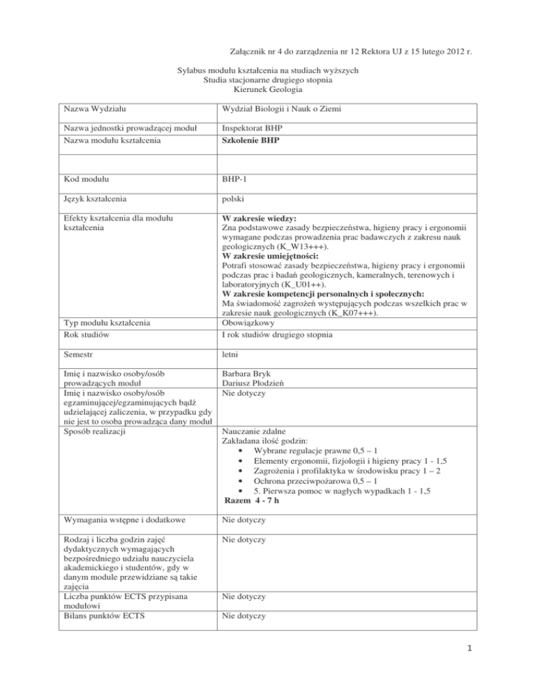 Zał cznik nr 4 do zarz dzenia nr 12 Rektora UJ z 15 lutego 2012 r. Sylabus modułu kształcenia na studiach wy szych Studia stacjonarne drugiego stopnia Kierunek Geologia Nazwa Wydziału Wydział Biologii i Nauk o Ziemi Nazwa jednostki prowadz cej moduł Nazwa modułu kształcenia Inspektorat BHP Szkolenie BHP Kod modułu BHP-1 J zyk kształcenia polski Efekty kształcenia dla modułu kształcenia Typ modułu kształcenia Rok studiów W zakresie wiedzy: Zna podstawowe zasady bezpiecze stwa, higieny pracy i ergonomii wymagane podczas prowadzenia prac badawczych z zakresu nauk geologicznych (K_W13+++). W zakresie umiej tno ci: Potrafi stosowa zasady bezpiecze stwa, higieny pracy i ergonomii podczas prac i bada geologicznych, kameralnych, terenowych i laboratoryjnych (K_U01++). W zakresie kompetencji personalnych i społecznych: Ma wiadomo zagro e wyst puj cych podczas wszelkich prac w zakresie nauk geologicznych (K_K07+++). Obowi zkowy I rok studiów drugiego stopnia Semestr letni Imi i nazwisko osoby/osób prowadz cych moduł Imi i nazwisko osoby/osób egzaminuj cej/egzaminuj cych b d udzielaj cej zaliczenia, w przypadku gdy nie jest to osoba prowadz ca dany moduł Sposób realizacji Barbara Bryk Dariusz Płodzie Nie dotyczy Wymagania wst pne i dodatkowe Nie dotyczy Rodzaj i liczba godzin zaj dydaktycznych wymagaj cych bezpo redniego udziału nauczyciela akademickiego i studentów, gdy w danym module przewidziane s takie zaj cia Liczba punktów ECTS przypisana modułowi Bilans punktów ECTS Nie dotyczy Nauczanie zdalne Zakładana ilo godzin: • Wybrane regulacje prawne 0,5 – 1 • Elementy ergonomii, fizjologii i higieny pracy 1 - 1,5 • Zagro enia i profilaktyka w rodowisku pracy 1 – 2 • Ochrona przeciwpo arowa 0,5 – 1 • 5. Pierwsza pomoc w nagłych wypadkach 1 - 1,5 Razem 4 - 7 h Nie dotyczy Nie dotyczy Stosowane metody dydaktyczne Szkolenie zorganizowane jest w formie zdalnego nauczania z wykorzystaniem platformy „Pegaz”. Uczestnicy szkolenia otrzymuj dost p do materiałów zamieszczonych na platformie w terminie okre lonym w Zarz dzeniu Rektora Uniwersytetu Jagiello skiego nr 69 z 26 wrze nia 2011 roku w sprawie: szkolenia w zakresie bezpiecze stwa i higieny pracy studentów I roku studiów pierwszego stopnia, drugiego stopnia i jednolitych studiów magisterskich oraz uczestników studiów doktoranckich w Uniwersytecie Jagiello skim. Materiały przygotowane zostały w formach tekstów, filmów, animacji, grafik, ilustracji a tak e quizów wiczeniowych. Udost pnione forum dyskusyjne umo liwia kontakt zarówno z nauczycielem jak i z uczestnikami szkolenia. W ramach forum mo liwe jest prowadzenie dyskusji na tematy zwi zane z problematyk bezpiecze stwa i higieny pracy. Quizy wiczeniowe pozwalaj na bie ce sprawdzanie przez uczestników szkolenia swoich wiadomo ci i umiej tno ci. Metody sprawdzania i kryteria oceny efektów kształcenia uzyskanych przez studentów Efekty z zakresu wiedzy sprawdzane poprzez egzamin testowy w trybie zdalnym. Efekty z zakresu umiej tno ci i kompetencji sprawdzane w czasie wicze laboratoryjnych i terenowych przewidzianych w programie studiów. Zaliczenie przeprowadzane jest w formie egzaminu testowego w trybie zdalnym. Warunkiem zaliczenia kursu jest rozwi zanie quizu zaliczeniowego i uzyskanie 60% punktów (w pełni poprawna odpowied na 12 z 20 pyta ). . Czas przeznaczony na rozwi zywanie quizu to 30 minut. Ka dy student ma 2 podej cia do quizu, przy czym do zaliczenia kursu liczy si wy sza z uzyskanych ocen. I. Wybrane zagadnienia prawne 1. Wybrane zagadnienia prawnej ochrony pracy • Podstawowe regulacje prawne i wyst puj ce w nich poj cia • Obowi zki pracodawcy w zakresie bezpiecze stwa i higieny pracy • Prawa i obowi zki pracownika w zakresie bezpiecze stwa i higieny pracy • Wypadki przy pracy i choroby zawodowe Szkolenia w zakresie bezpiecze stwa i higieny pracy Forma i warunki zaliczenia modułu, w tym zasady dopuszczenia do egzaminu, zaliczenia, a tak e forma i warunki zaliczenia poszczególnych zaj wchodz cych w zakres danego modułu Tre ci modułu kształcenia 2. Wybrane zagadnienia bezpiecze stwa i higieny pracy w uczelniach • Akty prawne dotycz ce bezpiecze stwa i higieny pracy • Przepisy ogólne • Przepisy szczegółowe 3. Wypadki studentów i wiadczenia z tytułu tych wypadków • Wypadek powstały w szczególnych okoliczno ciach • wiadczenia przysługuj ce osobie poszkodowanej wskutek takiego wypadku • Kiedy wiadczenie nie przysługuje II Elementy ergonomii, fizjologii i higieny pracy 1. Elementy ergonomii • Postacie ergonomii • Ergonomia stanowiska komputerowego • Barwy informacyjne • Znaki bezpiecze stwa 2. Elementy fizjologii pracy • Wprowadzenie do fizjologii pracy • Przenoszenie ci arów • Zm czenie • Rytm biologiczny człowieka 3. Elementy higieny pracy • Udział higieny w kształtowaniu warunków pracy • Zadania medycyny pracy III. Zagro enia i profilaktyka w rodowisku pracy 1. Czynniki wyst puj ce w rodowisku pracy • Podział czynników wyst puj cych w rodowisku pracy • Czynniki niebezpieczne • Likwidacja oraz ograniczenie wpływu czynników niebezpiecznych 2. Zagro enia zwi zane z urz dzeniami elektrycznymi • Przyczyny pora enia i oparzenia pr dem elektrycznym • Działanie pr du elektrycznego na organizm człowieka • Sposoby ochrony przed pora eniem pr dem • Podstawowe zasady bezpiecznego u ytkowania urz dze elektrycznych • Zasady ratowania osób pora onych pr dem elektrycznym 3. Hałas w rodowisku pracy • Czym jest hałas? • Wpływ hałasu na organizm człowieka • Redukcja i ograniczanie hałasu • Hałas w biurze 4. Czynniki chemiczne w rodowisku pracy • Klasyfikacja substancji chemicznych • Rodzaje zatru • Drogi wchłaniania substancji chemicznych do organizmu • Sposoby działania substancji chemicznych na organizm • Sposoby likwidacji lub ograniczenia ródeł zagro e chemicznych • Substancje niebezpieczne 5. Czynniki biologiczne w rodowisku pra