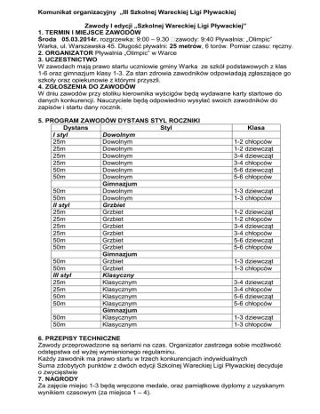 Komunikat organizacyjny „III Szkolnej Wareckiej Ligi Pływackiej Zawody I edycji „Szkolnej Wareckiej Ligi Pływackiej” 1. TERMIN I MIEJSCE ZAWODÓW Środa 05.03.2014r. rozgrzewka: 9:00 – 9.30 zawody: 9:40 Pływalnia: „Olimpic” Warka, ul. Warszawska 45. Długość pływalni: 25 metrów, 6 torów. Pomiar czasu: ręczny. 2. ORGANIZATOR Pływalnia „Olimpic” w Warce 3. UCZESTNICTWO W zawodach mają prawo startu uczniowie gminy Warka ze szkół podstawowych z klas 1-6 oraz gimnazjum klasy 1-3. Za stan zdrowia zawodników odpowiadają zgłaszające go szkoły oraz opiekunowie z którymi przyszli. 4. ZGŁOSZENIA DO ZAWODÓW W dniu zawodów przy stoliku kierownika wyścigów będą wydawane karty startowe do danych konkurencji. Nauczyciele będą odpowiednio wysyłać swoich zawodników do zapisów i startu dany rocznik. 5. PROGRAM ZAWODÓW DYSTANS STYL ROCZNIKI Dystans Styl I styl Dowolnym 25m Dowolnym 25m Dowolnym 25m Dowolnym 25m Dowolnym 50m Dowolnym 50m Dowolnym Gimnazjum 50m Dowolnym 50m Dowolnym II styl Grzbiet 25m Grzbiet 25m Grzbiet 25m Grzbiet 25m Grzbiet 50m Grzbiet 50m Grzbiet Gimnazjum 50m Grzbiet 50m Grzbiet III styl Klasyczny 25m Klasycznym 25m Klasycznym 50m Klasycznym 50m Klasycznym Gimnazjum 50m Klasycznym 50m Klasycznym Klasa 1-2 chłopców 1-2 dziewcząt 3-4 dziewcząt 3-4 chłopców 5-6 dziewcząt 5-6 chłopców 1-3 dziewcząt 1-3 chłopców 1-2 dziewcząt 1-2 chłopców 3-4 dziewcząt 3-4 chłopców 5-6 dziewcząt 5-6 chłopców 1-3 dziewcząt 1-3 chłopców 3-4 dziewcząt 3-4 chłopców 5-6 dziewcząt 5-6 chłopców 1-3 dziewcząt 1-3 chłopców 6. PRZEPISY TECHNICZNE Zawody przeprowadzone są seriami na czas. Organizator zastrzega sobie możliwość odstępstwa od wyżej wymienionego regulaminu. Każdy zawodnik ma prawo startu w trzech konkurencjach indywidualnych Suma zdobytych punktów z dwóch edycji Szkolnej Wareckiej Ligi Pływackiej decyduje o zwycięstwie 7. NAGRODY Za zajęcie miejsc 1-3 będą wręczone medale, oraz pamiątkowe dyplomy z uzyskanym wynikiem czasowym (za miejsca 1 – 4). Komunikat organizacyjny „III Szkolnej Wareckiej Ligi Pływackiej Zawody II edycji „Szkolnej Wareckiej Ligi Pływackiej” 1. TERMIN I MIEJSCE ZAWODÓW Środa 14.05.2014r. rozgrzewka: 9:00 – 9.30 zawody: 9:40 Pływalnia: „Olimpic” Warka, ul. Warszawska 45. Długość pływalni: 25 metrów, 6 torów. Pomiar czasu: ręczny. 2. ORGANIZATOR Pływalnia „Olimpic” w Warce 3. UCZESTNICTWO W zawodach mają prawo startu uczniowie gminy Warka ze szkół podstawowych z klas 1-6 oraz gimnazjum klasy 1-3. Za stan zdrowia zawodników odpowiadają zgłaszające szkoły oraz opiekunowie z którymi przyszli. 4. ZGŁOSZENIA DO ZAWODÓW W dniu zawodów przy stoliku kierownika wyścigów będą wydawane karty startowe do danych konkurencji. Nauczyciele będą odpowiednio wysyłać swoich zawodników do zapisów i startu dany rocznik. 5. PROGRAM ZAWODÓW DYSTANS STYL ROCZNIKI Dystans Styl I styl Dowolnym 25m Dowolnym 25m Dowolnym 25m Dowolnym 25m Dowolnym 50m Dowolnym 50m Dowolnym Gimnazjum 50m Motylkowym 50m Motylkowym II styl Grzbiet 25m Grzbiet 25m Grzbiet 25m Grzbiet 25m Grzbiet 50m Grzbiet 50m Grzbiet Gimnazjum 50m Grzbiet 50m Grzbiet III styl Klasyczny 25m Klasycznym 25m Klasycznym 50m Klasycznym 50m Klasycznym Gimnazjum 50m Klasycznym 50m Klasycznym Klasa 1-2 chłopców 1-2 dziewcząt 3-4 dziewcząt 3-4 chłopców 5-6 dziewcząt 5-6 chłopców 1-3 dziewcząt 1-3 chłopców 1-2 dziewcząt 1-2 chłopców 3-4 dziewcząt 3-4 chłopców 5-6 dziewcząt 5-6 chłopców 1-3 dziewcząt 1-3 chłopców 3-4 dziewcząt 3-4 chłopców 5-6 dziewcząt 5-6 chłopców 1-3 dziewcząt 1-3 chłopców 6. PRZEPISY TECHNICZNE Zawody przeprowadzone są seriami na czas. Organizator zastrzega sobie możliwość odstępstwa od wyżej wymienionego regulaminu. Każdy zawodnik ma prawo startu w trzech konkurencjach indywidualnych. Suma zdobytych punktów z 2-ch edycji Szkolnej Wareckiej Ligi Pływackiej decyduje o zwycięstwie. 7. NAGRODY Za zajęcie miejsc 1-3 będą wręczone medale, oraz pamiątkowe dyplomy za miejsca 1–4. Po podsumowaniu II edycji startów wręczone zostaną statuetki dla najlepszych zawodników w konkurencji dziewcząt i chłopców w danych kategoriach wiekowych.
