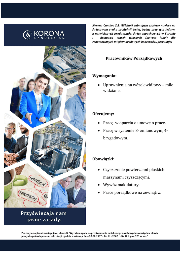 Korona Candles S.A. (Wieluń) zajmująca czołowe miejsce na światowym rynku produkcji świec, będąc przy tym jednym z największych producentów świec zapachowych w Europie i dostawcą marek własnych (private label) dla renomowanych międzynarodowych koncernów, poszukuje: Pracowników Porządkowych Wymagania: Uprawnienia na wózek widłowy – mile widziane. Oferujemy: Pracę w oparciu o umowę o pracę. Pracę w systemie 3- zmianowym, 4brygadowym. Obowiązki: Czyszczenie powierzchni płaskich maszynami czyszczącymi. Wywóz makulatury. Prace porządkowe na zewnątrz. Prosimy o dopisanie następującej klauzuli: "Wyrażam zgodę na przetwarzanie moich danych osobowych zawartych w ofercie pracy dla potrzeb procesu rekrutacji zgodnie z ustawą z dnia 27.08.1997r. Dz. U. z 2002 r., Nr 101, poz. 923 ze zm."