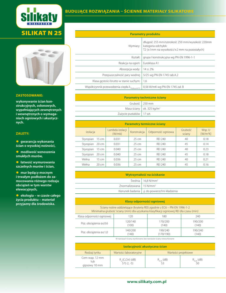 Budujące rozwiązania – Ścienne materiały silikatowe SILIKAT N 25 Parametry produktu długość 255 mm/szerokość 250 mm/wysokość 220mm Wymiary: kategoria odchyłek: T2 (±1mm na wysokości/±2 mm na pozostałych) Kształt: grupa I konstrukcyjna wg PN-EN 1996-1-1 Reakcja na ogień: Euroklasa A1 Absorpcja wody: 14 ± 2% Przepuszczalność pary wodnej 5/25 wg PN-EN 1745 tab.A.2 Klasa gęstości brutto w stanie suchym: 1,6 Współczynnik przewodzenia ciepła λ10,dry,unit P2 0,56 W/mK wg PN-EN 1745 zał. B Zastosowanie: Parametry techniczne ściany wykonywanie ścian konstrukcyjnych, osłonowych, wypełniających zewnętrznych i wewnętrznych o wymaganiach ogniowych i akustycznych. Zalety: zz gwarancja wykonania ścian o wysokiej nośności, zz możliwość wznoszenia smukłych murów, zz łatwość wymurowania szczelnych murów i ścian, Grubość 250 mm Masa ściany ok. 325 kg/m2 Zużycie pustaków 17 szt. Parametry termiczne ściany Lambda izolacji (W/mk) Konstrukcja Odporność ogniowa Grubość sciany Wsp. U [W/m2K] Styropian 15 cm 0.031 25 cm REI 240 40 0.18 Styropian 20 cm 0.031 25 cm REI 240 45 0.14 Styropian 15 cm 0.040 25 cm REI 240 40 0.23 Styropian 20 cm 0.040 25 cm REI 240 45 0.18 Wełna 15 cm 0.036 25 cm REI 240 40 0.21 Wełna 20 cm 0.036 25 cm REI 240 45 0.16 Izolacja zz mur będący mocnym i trwałym podłożem do zamocowania różnego rodzaju obciążeń w tym warstw elewacyjnych, zz ekologia – w czasie całego życia produktu – materiał przyjazny dla środowiska. Wytrzymałość na ściskanie Średnia 16,8 N/mm2 Znormalizowana 15 N/mm2 Kierunek badania ^ do powierzchni kładzenia Klasy odporności ogniowej Ściany nośne oddzielające (kryteria REI) zgodnie z EC6 – PN-EN 1996-1-2 Minimalna grubość ściany (mm) dla uzyskania klasyfikacji ogniowej REI dla czasu (min) Klasa odporności ogniowej 120 180 240 Poz. obciążenia α≤0.6 120/140 (100) 170/200 (140) 190/200 (140) Poz. obciążenia α≤1,0 140/200 (140) 190/240 (170/190) 190/240 (140) W nawiasach ściany otynkowane, bez nawiasów ściany nieotynkowane Izolacyjność akustyczna ścian Rodzaj tynku Wartości laboratoryjne Cem-wap. 12 mm lub gipsowy 10 mm Rw(C,Ctr) (dB) 57(-2, -5) Wartości projektowe RA1R (dB) 53 www.silikaty.com.pl RA2R (dB) 50 Budujące rozwiązania – Ścienne materiały silikatowe Produkty uzupełniające SILIKAT PW25/24 kl.15/250x240x220/- pustak wentylacyjny do wykonywania pionów wentylacyjnych ø16 SILIKAT 3NFD Zaprawa do silikatu biała do murowania na cienką spoinę (od 1-3 mm) ścian konstrukcyjnych i działowych wewnątrz i na zewnątrz budynków, klasa ≥ 10 MPa. Zaprawa murarska – nadaje się do murowania kondygnacji nadziemnych. Grubość spoiny wykonanej z zaprawy murarskiej powinna wynosić od 6 do 40mm. Można jej używać wewnątrz i na zewnątrz budynków. Zaprawa jest mrozoodporna i wodoodporna, klasa ≥ 5 MPa. Łącznik K1, K2 – połączeń murów z konstrukcją żelbetową lub z istniejącym murem, a także do połączeń murów wykonanych z elementów o różnym module wysokości. Łącznik D1, D2 – Odpowiedniki łączników K1, K2 stosowanych w miejscach, gdzie konieczne jest zachowanie dylatacji między łączonymi elementami. Elementy do połączeń murów Łącznik DS, DS2 – do połączeń ścian wypełniających ze stropem z zachowaniem dylatacji. Łącznik D3 do połączeń fragmentów murów z zachowaniem dylatacji pionowej. Łącznik P30 – do połączeń między ścianami z elementów o tym samym module wysokości (np. ściany działowe ze ścianami nośnymi). Zastępuje przewiązania murarskie między ścianami. Kielnie do zaprawy cienkowarstwowej Dozowniki do zaprawy cienkowarstwowej www.silikaty.com.pl