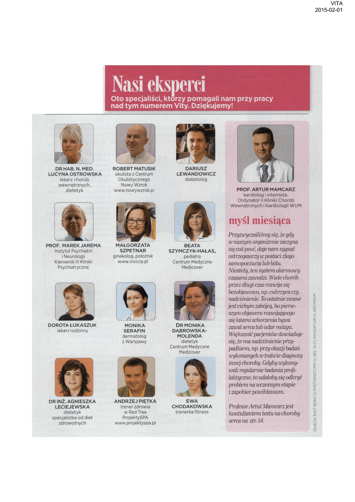 VITA 2015-02-01 Nasi eksperci Oto specjaliści, którzy pomagali nam przy pracy nad tym numerem Vity. Dziękujemy! DR HAB. N. MED. LUCYNA OSTROWSKA lekarz chorób wewnętrznych, dietetyk ! ROBERT MATUSIK okulista z Centrum Okulistycznego Nowy Wzrok www.nowywzrok.pl DARIUSZ LEWANDOWICZ diabetolog J PROF. ARTUR MAMCARZ kardiolog i internista. Ordynator II Kliniki Chorób Wewnętrznych i Kardiologii WUM myśl miesiąca PROF. MAREK JAREMA Instytut Psychiatrii i Neurologii Kierownik III Kliniki Psychiatrycznej DOROTA ŁUKASZUK lekarz rodzinny MAŁGORZATA SZPETNAR BEATA SZYMCZYK-HAŁAS, ginekolog, położnik www.invicta.pl pediatra Centrum Medyczne Medicover MONIKA SERAFIN dermatolog z Warszawy DR INŻ. AGNIESZKA LECIEJEWSKA dietetyk specjalistka od diet zdrowotnych ANDRZEJ PIĘTKA trener zdrowia w Red Tree ProjektySPA www.projektyspa.pl DR MONIKA DĄBROWSKAMOLENDA dietetyk Centrum Medyczne Medicover EWA CHODAKOWSKA trenerka fitness Przyzwyczailiśmy się, że gdy w naszym organizmie zaczyna się coś psuć, daje nam sygnał ostrzegawczy w postaci złego samopoczucia lub bólu. Niestety, ten system alarmowy czasami zawodzi. Wiele chorób przez długi czas rozwija się bezobjawowo, np. cukrzyca czy nadciśnienie. To ostatnie zwane jest cichym zabójcą, bo pierwszym objawem rozwijającego się latami schorzenia bywa ffi zawal serca lub udar mózgu. Większość pacjentów dowiaduje się,żemanadciśnienieprzypadkiem, np. przy okazji badań wykonanych w trakcie diagnozy innej choroby. Gdyby wykony wali regularnie badania profi laktyczne, to udałoby się odkryć probłem nawczesnym etapie i zapobiec powikłaniom. Profesor Artut Mamcarzjest kcmtultantem testu na choroby serca na str. 54. 5 | e ^ z S </> g S § LLT O N