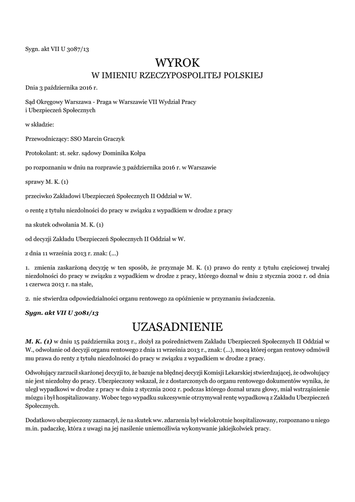 Sygn. akt VII U 3087/13 WYROK W IMIENIU RZECZYPOSPOLITEJ POLSKIEJ Dnia 3 października 2016 r. Sąd Okręgowy Warszawa - Praga w Warszawie VII Wydział Pracy i Ubezpieczeń Społecznych w składzie: Przewodniczący: SSO Marcin Graczyk Protokolant: st. sekr. sądowy Dominika Kołpa po rozpoznaniu w dniu na rozprawie 3 października 2016 r. w Warszawie sprawy M. K. (1) przeciwko Zakładowi Ubezpieczeń Społecznych II Oddział w W. o rentę z tytułu niezdolności do pracy w związku z wypadkiem w drodze z pracy na skutek odwołania M. K. (1) od decyzji Zakładu Ubezpieczeń Społecznych II Oddział w W. z dnia 11 września 2013 r. znak: (...) 1. zmienia zaskarżoną decyzję w ten sposób, że przyznaje M. K. (1) prawo do renty z tytułu częściowej trwałej niezdolności do pracy w związku z wypadkiem w drodze z pracy, którego doznał w dniu 2 stycznia 2002 r. od dnia 1 czerwca 2013 r. na stałe, 2. nie stwierdza odpowiedzialności organu rentowego za opóźnienie w przyznaniu świadczenia. Sygn. akt VII U 3081/13 UZASADNIENIE M. K. (1) w dniu 15 października 2013 r., złożył za pośrednictwem Zakładu Ubezpieczeń Społecznych II Oddział w W., odwołanie od decyzji organu rentowego z dnia 11 września 2013 r., znak: (...), mocą której organ rentowy odmówił mu prawa do renty z tytułu niezdolności do pracy w związku z wypadkiem w drodze z pracy. Odwołujący zarzucił skarżonej decyzji to, że bazuje na błędnej decyzji Komisji Lekarskiej stwierdzającej, że odwołujący nie jest niezdolny do pracy. Ubezpieczony wskazał, że z dostarczonych do organu rentowego dokumentów wynika, że uległ wypadkowi w drodze z pracy w dniu 2 stycznia 2002 r. podczas którego doznał urazu głowy, miał wstrząśnienie mózgu i był hospitalizowany. Wobec tego wypadku sukcesywnie otrzymywał rentę wypadkową z Zakładu Ubezpieczeń Społecznych. Dodatkowo ubezpieczony zaznaczył, że na skutek ww. zdarzenia był wielokrotnie hospitalizowany, rozpoznano u niego m.in. padaczkę, która z uwagi na jej nasilenie uniemożliwia wykonywanie jakiejkolwiek pracy. W odpowiedzi na odwołanie z dnia 12 listopada 2013 r., Zakład Ubezpieczeń Społecznych II Oddział w W. wniósł o oddalenie odwołania M. K. (1) na podstawie art. 47714 § 1 k.p.c. W uzasadnieniu odpowiedzi na odwołanie organ rentowy powołał się na stosowne przepisy art. 41 ust. 1 ustawy z dnia 12 czerwca 1975 r. o świadczeniach z tytułu wypadków przy pracy i chorób zawodowych. W świetle ww. artykułu pracownikowi, który uległ w drodze do pracy lub z pracy, przysługuje jednorazowe odszkodowanie-w razie stałego lub długotrwałego uszczerbku na zdrowiu oraz renta inwalidzka- w razie zaliczenia do jednej z grup inwalidów. W toku postępowania zainicjowanego wnioskiem, odwołujący został skierowany na badanie do Komisji Lekarskiej ZUS, która orzeczeniem z dnia 19 sierpnia 2013 r. nie uznała ubezpieczonego za osobę całkowicie niezdolną do pracy, jednak orzekła celowość przekwalifikowania zawodowego ze względu na niezdolność do pracy w dotychczasowym zawodzie. Sąd Okręgowy ustalił następujący stan faktyczny: Odwołujący się M. K. (1) ma 40 lat. Z wykształcenia jest mechanikiem samochodowym. Wnioskodawca przed wypadkiem pracował przez około 10 lat jako motorniczy tramwajowy. W dniu 27 listopada 1999 r. uległ wypadkowi w drodze do pracy, przewrócił się na chodniku, uderzając głową o trotuar, natomiast w dniu 2 stycznia 2002 r. uległ wypadkowi w drodze z pracy, a mianowicie uległ pobiciu, w wyniku którego stracił przytomność, doznał urazu głowy oraz wstrząśnienia mózgu. Od 2002 r. u ubezpieczonego stwierdzono padaczkę pod postacią napadów częściowo złożonych i wtórnie uogólnionych, toniczno-klonicznych. (karty wypadku , tom I i II a.r.). W dniu 18 czerwca 2013 r. ubezpieczony złożył wniosek o rentę z tytułu niezdolności do pracy w związku z wypadkiem w drodze do domu/z pracy (wniosek k.1-4, tom II a.r.). Lekarz Orzecznik ZUS, po przeprowadzeniu badania odwołującego w dniu 3 lipca 2013 r. orzekł, że odwołujący nie jest niezdolny do pracy. W związku z wniesionym sprzeciwem odwołującego, dotyczącego orzeczenia Lekarza Orzecznika ZUS, ubezpieczony został skierowany na badanie do Komisji Lekarskiej ZUS, która orzeczeniem z dnia 19 sierpnia 2013 r. stwierdziła, iż niezdolność do pracy odwołującego w dotychczasowym zawodzie pozostaje w związku z wypadkiem w drodze do pracy. Ponadto celowe jest przekwalifikowanie zawodowe ze względu na niezdolność do pracy w dotychczasowym zawodzie (orzeczenie Lekarza Orzecznika ZUS k.13, tom II a.r., orzeczenie Komisji Lekarskiej ZUS k.29, tom II a.r.). Na podstawie orzeczenia Komisji Lekarskiej ZUS, organ rentowy decyzją z dnia 11 września 2013 r., znak: (...) odmówił ubezpieczonemu prawa do renty z tytułu niezdolność do pracy w związku z wypadkiem w drodze z pracy (decyzja z dnia 11 września 2013 r. k.35, tom II a.r.). Od powyższej decyzji organu rentowego M. K. (1) wniósł w dniu 15 października 2013 r. odwołanie, inicjując tym samym niniejsze postępowanie(odwołanie k.2-4 a.s.). Postanowieniem z dnia 27 listopada 2013 r. Sąd dopuścił dowód z opinii biegłych sądowych lekarzy specjalistów z zakresu neurologii oraz psychologii, celem ustalenia czy ubezpieczony jest całkowicie lub częściowo niezdolny do pracy, a jeżeli tak, to czy niezdolność ta powstała w związku z wypadkiem przy pracy, któremu odwołujący uległ w dniu 2 stycznia 2002 r. oraz czy jest to niezdolność trwała czy okresowa, a jeżeli okresowa to na jaki okres (postanowienie z 27 listopada 2013 r.). W opinii z dnia 10 lutego 2014 r. biegły sądowy z zakresu psychologii J. K. stwierdziła, że wnioskodawca jest zdolny do pracy, a jego potencjał poznawczy umożliwia mu nabywanie nowych umiejętności zawodowych. Ponadto biegła dodała, że pomoc w przezwyciężaniu problemów emocjonalnych, umożliwia mu kontynuowanie terap