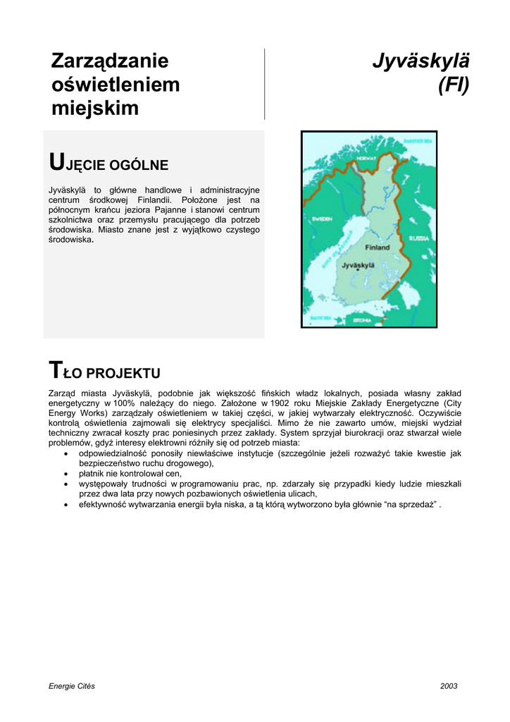 Zarządzanie oświetleniem miejskim Jyväskylä (FI) UJĘCIE OGÓLNE Jyväskylä to główne handlowe i administracyjne centrum środkowej Finlandii. Położone jest na północnym krańcu jeziora Pajanne i stanowi centrum szkolnictwa oraz przemysłu pracującego dla potrzeb środowiska. Miasto znane jest z wyjątkowo czystego środowiska. TŁO PROJEKTU Zarząd miasta Jyväskylä, podobnie jak większość fińskich władz lokalnych, posiada własny zakład energetyczny w 100% należący do niego. Założone w 1902 roku Miejskie Zakłady Energetyczne (City Energy Works) zarządzały oświetleniem w takiej części, w jakiej wytwarzały elektryczność. Oczywiście kontrolą oświetlenia zajmowali się elektrycy specjaliści. Mimo że nie zawarto umów, miejski wydział techniczny zwracał koszty prac poniesinych przez zakłady. System sprzyjał biurokracji oraz stwarzał wiele problemów, gdyż interesy elektrowni różniły się od potrzeb miasta: • odpowiedzialność ponosiły niewłaściwe instytucje (szczególnie jeżeli rozważyć takie kwestie jak bezpieczeństwo ruchu drogowego), • płatnik nie kontrolował cen, • występowały trudności w programowaniu prac, np. zdarzały się przypadki kiedy ludzie mieszkali przez dwa lata przy nowych pozbawionych oświetlenia ulicach, • efektywność wytwarzania energii była niska, a tą którą wytworzono była głównie “na sprzedaż” . Energie Cités 2003 PODJĘTE DZIAŁANIA Restrukturyzacja usług Wraz z początkiem liberalizacji w 1996 roku, prawo własności systemu zostało przeniesione na władze miasta, co poprzedziło restrukturyzację komunlanych usług energetycznych w oddzielne przedsiębiorstwo. Za zarządzanie sterowaniem odpowiada obecnie miejskie „Technical Service Centre ” – Centrum Usług Technicznych, TEKPA, a planowanie oraz wszelkie prace konserwacyjne i usprawniające są na bieżąco podzlecane do miejskiego zakładu energetyczneo zgodnie z wytycznymi ustalonymi i zatwierdzonymi przez gminę. Stosunki pomiędzy zakładem a zarządem miasta układają się bardzo dobrze. Ekspertyzy techniczne są w pełni fachowe, a współpraca nad systemem oświetleniowym jest ścisła i pełna zaufania. Od 2001 roku na wszelkie usługi oświetleniowe są ogłaszane konkurencyjne przetargi. Miejski zakład energetyczny wygrał trzyletni kontrakt na konserwacje systemu oraz kontrakty na około 20% podejmowanych inwestycji. Plany dotyczące oświetlenia Miasto wyspecjalizowało się w ogólnym planowaniu i tworzeniu systemu, który jest bardzo wyrafinowany i zapewnia wysoki standard oświetleniowy dostosowany do istniejących warunków. System oświetleniowy spełnia standardy jasności uzgodnione przez Fińskie Towarzystwo Inżynierii Oświetleniowej (“Illuminating Enginneering Society of Finland”), opublikowane w książce “Stacjonarne oświetlenie drogowe” (“Stationary Traffic Lighting”), oraz nowości konstrukcyjne wykorzystując ich TIE program projektowy. Miasto przygotowało plan oświetleniowy na trzech poziomach: plan główny, plany strefowe oraz lokalne plany rozbudowy. Ogólny plan oświetlenia miasta został wykonany w 1991 roku i później rozszerzony. Obejmuje on rozwój i udoskonalenie oświetlenia miasta, atakże bieże pod uwagę zasadę ograniczenia poziomów oświetlenia do niezbędnego minimum. Plan ogólny wyszczególnia wyposażenie, które należy wymienić na nowe (głównie duży zapas stosunkowo niewydajnych lamp rtęciowych), ponownie określa kategorie oświetleniowe i zasady podziału na rodzaje oświerlenia oraz wprowadza równowagę między standardmi oświetleniowymi i uwarunkowaniami ekonomicznymi. Z początkiem roku 1997 utworzono spółkę pomiędzy Jyväskylä Energia i Jyväskylä Technical Service Centre, przy konsulatacjach udzielonych przez biuro National Roads Agency's Central Finland – Krajowej Agencji Drogowej Środkowej Finladii. Zaplanowano, że do 2010 roku wszystkie ulice zostaną oświetlone energooszczędnymi lampami sodowymi. Plan nie bierze pod uwagę wymagań oświetleniowych dróg o małym natężeniu ruchu, chodników oraz ścieżek rowerowych. Plan składa się z dwóch zasadniczych części. Pierwsza część podsumowuje bieżący stan na głównych drogach, okreslając potrzeby renowacji oraz koszty jakie należy ponieść w zaplanowanym okresie. W drugiej części do sieci dróg głównych przypisano kategorie oświetleniowe oraz określono rodzaje lamp do zainstalowania do 2010 roku. Również plany strefowe oraz lokalne plany rozbudowy zostały opracowane według istniejących potrzeb. Będą one wymagały dostosowania do planu ogólnego. Roczny plan konserwacji oświetlenia obejmuje zarządzanie istniejącą siecią oraz wyszczególnia sposób prowadzenia konserwacji wraz z kosztami. Regularne dokonywanie rewizji planu ogólnego co 5 lat umożliwi stronom dorównanie zmianom zachodzącym w technologii oświetleniowej. W celu zapewnienia właściwych funduszy władze wykorzystały doświadczenie innych miast i przeprowadziły analizę porównawczą kosztów usług oświetleniowych w grupie 8 miast, które zredukowały te koszty. Jyväskylä spodziewa się: • uzyskać potwierdzenie efektywności ogólnego planu oświetlenia oraz planu konserwacji, • znaleźć nowe metody konstrukcji umożliwiające rozwiązanie specyficznych problemów, np. pochylania się słupów w wyniku pęcznienia na mrozie, • zredukować zużycie energii. Energie Cités 2003 Punkty analizy porównawczej kosztów zostały dobrane za pomocą programu komputerowego (VERTTI), który służy do porównywania danych uzyskanych w 90-100 fińskich miastach. Dotyczą one wszystkich czynników, które wywierają istotny wpływ na koszty. Miasta liczą na korzyści, które osiągną dzięki przyjęciu jak najniższych kosztów utrzymania, jednakże powinno to stanowić tylko cel rozważań, gdyż na koszty (np. rodzaje konserwacji) wpływają przyjęte standardy. Oszczędzanie e