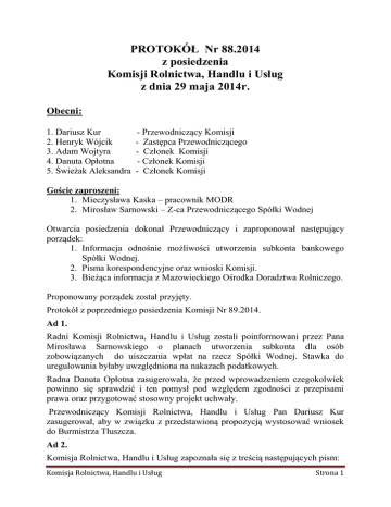 PROTOKÓŁ Nr 88.2014 z posiedzenia Komisji Rolnictwa, Handlu i Usług z dnia 29 maja 2014r. Obecni: 1. Dariusz Kur 2. Henryk Wójcik 3. Adam Wojtyra 4. Danuta Opłotna 5. Świeżak Aleksandra - Przewodniczący Komisji - Zastępca Przewodniczącego - Członek Komisji - Członek Komisji - Członek Komisji Goście zaproszeni: 1. Mieczysława Kaska – pracownik MODR 2. Mirosław Sarnowski – Z-ca Przewodniczącego Spółki Wodnej Otwarcia posiedzenia dokonał Przewodniczący i zaproponował następujący porządek: 1. Informacja odnośnie możliwości utworzenia subkonta bankowego Spółki Wodnej. 2. Pisma korespondencyjne oraz wnioski Komisji. 3. Bieżąca informacja z Mazowieckiego Ośrodka Doradztwa Rolniczego. Proponowany porządek został przyjęty. Protokół z poprzedniego posiedzenia Komisji Nr 89.2014. Ad 1. Radni Komisji Rolnictwa, Handlu i Usług zostali poinformowani przez Pana Mirosława Sarnowskiego o planach utworzenia subkonta dla osób zobowiązanych do uiszczania wpłat na rzecz Spółki Wodnej. Stawka do uregulowania byłaby uwzględniona na nakazach podatkowych. Radna Danuta Opłotna zasugerowała, że przed wprowadzeniem czegokolwiek powinno się sprawdzić i ten pomysł pod względem zgodności z przepisami prawa oraz przygotować stosowny projekt uchwały. Przewodniczący Komisji Rolnictwa, Handlu i Usług Pan Dariusz Kur zasugerował, aby w związku z przedstawioną propozycją wystosować wniosek do Burmistrza Tłuszcza. Ad 2. Komisja Rolnictwa, Handlu i Usług zapoznała się z treścią następujących pism: Komisja Rolnictwa, Handlu i Usług Strona 1 1. Pismo o znaku UGK.0012.4.2014.BG z dnia 7 maja 2014r. wystosowane z upoważnienia Burmistrza Tłuszcza przez Sekretarza Gminy Tomasza Jusińskiego do Komisji Rolnictwa, Handlu i Usług Rady Miejskiej w Tłuszczu (data wpływu do ORA 12 maja 2014r., nr 89) w sprawie przekazania kopii pisma Regionalnej Dyrekcji Ochrony Środowiska będącego odpowiedzią ma pismo w sprawie podjęcia działań mających na celu zmniejszenia populacji dzików i bobrów – załącznik nr 1 do niniejszego protokołu. 2. Pismo o znaku UGK.6150.4.2014.BG z dnia 19 maja 2014r. wystosowane przez Sekretarza Gminy do Zarządu Okręgowego PZŁ w sprawie wpływających licznych skarg, uwag i wnioski mieszkańców na działanie kół łowieckich w sprawie złego szacowania szkód w rolnictwie i wykonywania swoich obowiązków. Powyższe pismo zostało przekazane do wiadomości Komisji Rolnictwa, Handlu i Usług stanowi załącznik nr 2 do niniejszego protokołu. 3. Pismo o znaku UGK.0003.8.2014.BG z dnia 19 maja 2014r. wystosowane do Spółki Wodnej w Tłuszczu informujące o przekazaniu wniosku Komisji Rolnictwa, Handlu i Usług w sprawie odtworzenia sieci urządzeń melioracyjnych położonych w miejscowości Chrzęsne – załącznik nr 3 do niniejszego protokołu. 4. Pismo o znaku PLF.3035.1.2014 z dnia 19.05.2014r. wystosowane przez Burmistrza Tłuszcza Pawła Marcina Bednarczyka (data wpływu do ORA w dniu 20.05.2014r., nr 94) do Rady Miejskiej w Tłuszczu w sprawie przekazania sprawozdania finansowego za 2013 rok składające się z: - bilansu jednostek budżetowych Gminy Tłuszcz, - łącznego bilansu jednostek budżetowych i samorządowego zakładu budżetowego, - łącznego zestawienia zmian w funduszu, - łącznego rachunku zysków i strat – załącznik nr 4 do niniejszego protokołu. Po zapoznaniu się z treścią ww. pism radni podjęli dyskusję odnośnie pogarszającej się sytuacji związanej ze stratami wyrządzanymi przez dziki w uprawach rolnych, na łąkach i blisko domostw oraz lokalnymi podtopieniami przez bardzo liczną na terenie gminy populację bobrów. W związku z panującą sytuacją Komisja Rolnictwa, Handlu i Usług wnioskuje do Burmistrza Tłuszcza o: 1. Zwołanie narady z sołtysami i przewodniczącymi rad osiedlowych na dzień 9 czerwca 2014r. na godzinę 9.00 w UM w Tłuszczu w celu ustalenia terminu i lokalizacji tegorocznych Dożynek Gminnych oraz przekazanie sołtysom dokumentacji dostarczonej przez RDOŚ w Komisja Rolnictwa, Handlu i Usług Strona 2 Warszawie (nr pism: 5488, 5130) i wniosków do zgłaszania szkód wyrządzonych przez zwierzynę leśną (bobry i dziki); 2. Podjęcie działań (wg. sugestii Pana Sarnowskiego Mirosława) zgodnie z przepisami prawa w celu stworzenia subkonta bankowego dla osób zobowiązanych do uiszczenia wpłat na rzecz Spółki Wodnej. Ad 3. Zaproszona na posiedzenie Komisji Rolnictwa, Handlu i Usług pani Mieczysława Kaska poinformowała, że zakończyła się akcja składania wniosków o płatności bezpośrednie i trwa nabór od 15 maja do 21 czerwca 2014 r. Oddziały Regionalne Agencji Restrukturyzacji i Modernizacji Rolnictwa będą przyjmowały wnioski o przyznanie pomocy z działania "Ułatwianie startu młodym rolnikom". Wsparcie to jest finansowane z Programu Rozwoju Obszarów Wiejskich na lata 2007 - 2013. Natomiast na miesiąc czerwiec zaplanowany jest konkurs o wiedzy w rolnictwie dla gminnych rolników (23.06.2014r., godz. 10.00) w Sali konferencyjnej Urzędu Miejskiego w Tłuszczu. Wręczenie nagród i prezentacja sylwetek rolników, którzy wezmą udział w konkursie nastąpi podczas Dożynek Gminnych. Pani Kaska poinformowała szczegółowo również obecnych radnych o propozycji wyjazdu do Danii w listopadzie 25-28.11.2014r. na Międzynarodowe Targi Argotech. Wyjazd jest z Warszawy, koszt uczestnictwa to 500,00zł od osoby, liczba miejsc jest ograniczona. Radni po wysłuchaniu propozycji Pani Kaska podjęli również dyskusję nad tematem wyjazdu krajowego dla sołtysów i rolników w roku 2014 na targi, wystawy lub szkolenia o charakterze rolniczym, jednakże nie podjęto jednoznacznej decyzji w tym zakresie. W związku ze zbliżającym się okresem organizacyjnym dożynek, Komisja Rolnictw, Handlu i Usług chciałaby zapoznać się ze szczegółami tej imprezy, głównie chodzi o termin oraz lokalizację, dlatego też złożyła wniosek do Burmistrza