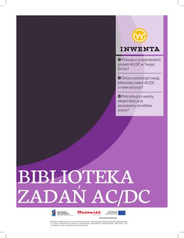 Planujesz przeprowadzić projekt AC/DC w Twojej firmie? Chcesz poszerzyć swoją bibliotekę zadań AC/DC o nowe pozycje? Potrzebujesz wiedzy eksperckiej przy planowaniu ośrodków oceny? BIBLIOTEKA ZADAŃ AC/DC dla rozwoju Mazowsza Wydatek współfinansowany przez Unię Europejską z Europejskiego Funduszu Rozwoju Regionalnego w ramach Regionalnego Programu Operacyjnego Województwa Mazowieckiego 2007-2013 oraz ze środków budżetu województwa mazowieckiego BIBLIOTEKA ZADAŃ AC/DC Assessment/Development Centre to metoda oceny kompetencji oraz potencjału zawodowego pracowników lub kandydatów do pracy. Ocena ta formułowana jest w oparciu o obserwację potencjalnego lub obecnego pracownika w trakcie wykonywania zadań zbliżonych do występujących w organizacji. RODZAJE ZADAŃ Symulacje grupowe - to dyskusje grupowe z przydzielonymi rolami lub bez, gdzie wszyscy uczestnicy pracują nad tym samym celem, a każda z osób może dodatkowo otrzymać zdefiniowany w przypisanej mu roli cel indywidualny wraz z dodatkowymi informacjami. Symulacje umożliwiają obserwację m.in. następujących umiejętności: Negocjacyjnych; Przyjmowania odpowiedzialności za zadanie; Naturalnych predyspozycji liderskich; Perswazyjności i umiejętności obrony Umiejętności pracy zespołowej i godzenia własnego stanowiska; celów indywidualnych z celami grupowymi; Komunikatywności. Symulacje indywidualne - to symulacje, w których uczestnik ma odbyć rozmowę, której temat, cele i czas są ściśle określone w instrukcji; w symulacji uczestniczy odpowiednio przeszkolony i poinstruowany asesor-aktor. Najczęściej stosowanymi symulacjami indywidualnymi są: Rozmowa z pracownikiem, Rozmowa z klientem, Rozmowa problemowa, Prezentacja. Scenki rozmów indywidualnych mają badać m.in. następujące kompetencje: Zdolność do rozwiązywania problemów Umiejętność motywowania; i konfliktów; Perswazyjność; Orientację na cel; Komunikatywność; Umiejętność negocjowania, predyspozycje Umiejętność logicznej argumentacji; handlowe. Symulacje indywidualne typu „case study” i „strategiczne studium przypadku” - to zadania symulacyjne, w których uczestnik ma odbyć analizę sytuacji, a następnie zaprezentować opracowane przez siebie rozwiązania. W symulacji uczestniczy odpowiednio przeszkolony i poinstruowany asesor-aktor. Symulacje tego typu mogą badać m.in. następujące kompetencje: Umiejętność strategicznego myślenia; Umiejętność trafnej analizy; Umiejętność klarownego prezentowania Umiejętność rozwiązywania problemów. pomysłów i ich obrony; Inwenta Sp. z o.o. ul. Koszykowa 69/3, 00-667 Warszawa, tel. 22 50 234 70 Więcej informacji o szkoleniach www.inwenta.pl/szkolenia EGZEMPLARZ BEZPŁATNY