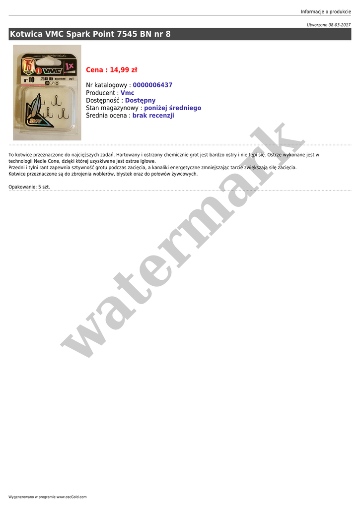 Informacje o produkcie Utworzono 08-03-2017 Kotwica VMC Spark Point 7545 BN nr 8 Cena : 14,99 zł er m ar k Nr katalogowy : 0000006437 Producent : Vmc Dostępność : Dostępny Stan magazynowy : poniżej średniego Średnia ocena : brak recenzji To kotwice przeznaczone do najcięższych zadań. Hartowany i ostrzony chemicznie grot jest bardzo ostry i nie tępi się. Ostrze wykonane jest w technologii Nedle Cone, dzięki której uzyskiwane jest ostrze igłowe. Przedni i tylni rant zapewnia sztywność grotu podczas zacięcia, a kanaliki energetyczne zmniejszając tarcie zwiększają siłę zacięcia. Kotwice przeznaczone są do zbrojenia woblerów, błystek oraz do połowów żywcowych. w at Opakowanie: 5 szt. Wygenerowano w programie www.oscGold.com