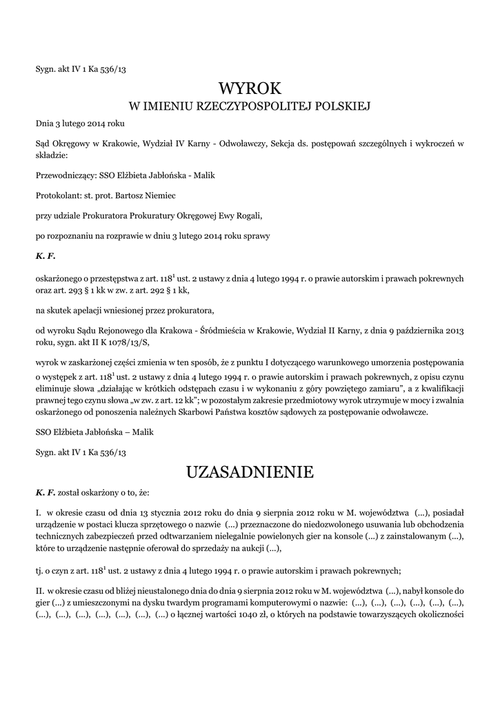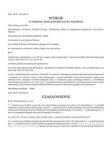 Sygn. akt IV 1 Ka 536/13 WYROK W IMIENIU RZECZYPOSPOLITEJ POLSKIEJ Dnia 3 lutego 2014 roku Sąd Okręgowy w Krakowie, Wydział IV Karny - Odwoławczy, Sekcja ds. postępowań szczególnych i wykroczeń w składzie: Przewodniczący: SSO Elżbieta Jabłońska - Malik Protokolant: st. prot. Bartosz Niemiec przy udziale Prokuratora Prokuratury Okręgowej Ewy Rogali, po rozpoznaniu na rozprawie w dniu 3 lutego 2014 roku sprawy K. F. oskarżonego o przestępstwa z art. 1181 ust. 2 ustawy z dnia 4 lutego 1994 r. o prawie autorskim i prawach pokrewnych oraz art. 293 § 1 kk w zw. z art. 292 § 1 kk, na skutek apelacji wniesionej przez prokuratora, od wyroku Sądu Rejonowego dla Krakowa - Śródmieścia w Krakowie, Wydział II Karny, z dnia 9 października 2013 roku, sygn. akt II K 1078/13/S, wyrok w zaskarżonej części zmienia w ten sposób, że z punktu I dotyczącego warunkowego umorzenia postępowania o występek z art. 1181 ust. 2 ustawy z dnia 4 lutego 1994 r. o prawie autorskim i prawach pokrewnych, z opisu czynu eliminuje słowa „działając w krótkich odstępach czasu i w wykonaniu z góry powziętego zamiaru”, a z kwalifikacji prawnej tego czynu słowa „w zw. z art. 12 kk”; w pozostałym zakresie przedmiotowy wyrok utrzymuje w mocy i zwalnia oskarżonego od ponoszenia należnych Skarbowi Państwa kosztów sądowych za postępowanie odwoławcze. SSO Elżbieta Jabłońska – Malik Sygn. akt IV 1 Ka 536/13 UZASADNIENIE K. F. został oskarżony o to, że: I. w okresie czasu od dnia 13 stycznia 2012 roku do dnia 9 sierpnia 2012 roku w M. województwa (...), posiadał urządzenie w postaci klucza sprzętowego o nazwie (...) przeznaczone do niedozwolonego usuwania lub obchodzenia technicznych zabezpieczeń przed odtwarzaniem nielegalnie powielonych gier na konsole (...) z zainstalowanym (...), które to urządzenie następnie oferował do sprzedaży na aukcji (...), tj. o czyn z art. 1181 ust. 2 ustawy z dnia 4 lutego 1994 r. o prawie autorskim i prawach pokrewnych; II. w okresie czasu od bliżej nieustalonego dnia do dnia 9 sierpnia 2012 roku w M. województwa (...), nabył konsole do gier (...) z umieszczonymi na dysku twardym programami komputerowymi o nazwie: (...), (...), (...), (...), (...), (...), (...), (...), (...), (...), (...), (...), (...) o łącznej wartości 1040 zł, o których na podstawie towarzyszących okoliczności powinien i mógł przypuszczać, że zostały one uzyskane za pomocą czynu zabronionego czym działał na szkodę firm: (...) i Stowarzyszenie (...) reprezentowanych przez (...) Sp. z o.o. tj. o czyn z art. 293 § 1 k.k. w zw. z art. 292 § 1 k.k. Sąd Rejonowy dla Krakowa – Śródmieścia w Krakowie, Wydział II Karny, wyrokiem z dnia 9 października 2013 r., sygn. akt II K 1078/13/S orzekł: I. na mocy art. 66 § 1 i 2 k.k. oraz art. 67 § 1 k.k. postępowanie karne przeciwko oskarżonemu K. F. o czyny zarzucone mu aktem oskarżenia, warunkowo umarza na okres próby wynoszący 1 (jeden) rok, z tym że modyfikuje opis czynu z punktu I aktu oskarżenia w ten sposób, że po słowach „ (...)” dodaje słowa „działając w krótkich odstępach czasu i w wykonaniu z góry powziętego zamiaru”, oraz w ten sposób, że w miejsce słów „13 stycznia” wpisuje słowa „23 stycznia”, oraz modyfikuje opis czynu z punktu II aktu oskarżenia w ten sposób, że w miejsce słów „w okresie czasu od bliżej nieustalonego dnia do dnia 9 sierpnia 2012 roku” wpisuje słowa „w bliżej nieustalonym dniu przed dniem 9 sierpnia 2012 r. działając celem osiągnięcia korzyści majątkowej”, oraz w ten sposób, że w miejsce słów „o łącznej wartości 1040 zł,” wpisuje słowa „o bliżej nieustalonej wartości,” przy czym czyny te kwalifikuje odpowiednio - czyn z punktu I aktu oskarżenia jako występek z art. 1181 ust. 2 w zw. z ust. 1 ustawy z dnia 4.02.1994 r. o prawie autorskim i prawach pokrewnych w zw. z art. 12 k.k. i czyn z punktu II aktu oskarżenia jako występek z art. 293 § 1 k.k. w zw. z art. 292 § 1 k.k.; II. na mocy art. 100 k.k. orzeka wobec oskarżonego przepadek na rzecz Skarbu Państwa dowodów rzeczowych w postaci: urządzenia (...) oraz dysku twardego z konsoli - opisanych w wykazie dowodów rzeczowych nr I/26/13 k. 143 pod poz. 3 i 1; III. na zasadzie art. 230 § 2 k.p.k. zwraca oskarżonemu dowody rzeczowe w postaci konsoli do gier wraz z kablem (po usunięciu z konsoli dysku twardego) oraz urządzenie marki S. (...) opisane w wykazie dowodów rzeczowych nr I/26/13 k. 143 pod poz. 1,2; IV. na mocy art. 67 § 3 k.k. w zw. z art. 49 § 1 k.k. i art. 39 pkt 7 k.k. nakłada na oskarżonego obowiązek świadczenia pieniężnego w kwocie 500 (pięćset) złotych na rzecz Funduszu Pomocy Pokrzywdzonym oraz Pomocy Postpenitencjarnej na nr rachunku bankowego: (...); V. na podstawie art. 627 k.p.k. w zw. z art. 629 k.p.k. i art. 7 ustawy z dnia 23 czerwca 1973 r. o opłatach w sprawach karnych (Dz. U. z 1983 r. Nr 49 poz. 223 ze zm.) zasądza od oskarżonego na rzecz Skarbu Państwa kwotę 150 (sto pięćdziesiąt) złotych tytułem zwrotu części kosztów sądowych, zwalniając oskarżonego w pozostałym zakresie na zasadzie art. 624 § 1 k.p.k. od obowiązku uiszczenia kosztów sądowych. Apelację od powyższego wyroku wniósł Prokurator, który zaskarżył wyrok w odniesieniu do czynu opisanego w punkcie I na korzyść oskarżonego i wyrokowi temu zarzucił obrazę przepisów prawa materialnego – art. 12 kk, poprzez błędne zastosowanie dyspozycji tego przepisu w opisie znamion zarzucanego oskarżonemu czynu z art. 1181 ust. 2 ustawy z dnia 4 lutego 1994 roku o prawie autorskim i prawach pokrewnych, podczas gdy przestępstwo zarzucane oskarżonemu jest tzw. przestępstwem trwałym, do którego instytucja z art. 12 kk, nie znajduje zastosowania. W konkluzji apelacji apelujący wniósł o zmianę zaskarżonego rozstrzygnięcia poprzez wyeliminowanie z opisu czynu z art. 1181 ust. 2 ustawy o prawie autorskim i prawac