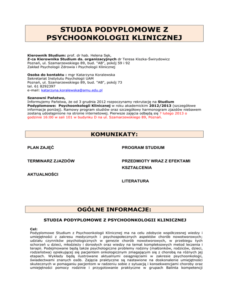 STUDIA PODYPLOMOWE Z PSYCHOONKOLOGII KLINICZNEJ Kierownik Studium: prof. dr hab. Helena Sęk, Z-ca Kierownika Studium ds. organizacyjnych dr Teresa Kiszka-Świrydowicz Poznań, ul. Szamarzewskiego 89, bud. "AB", pokój 59 i 92 Zakład Psychologii Zdrowia i Psychologii Klinicznej Osoba do kontaktu : mgr Katarzyna Koralewska Sekretariat Instytutu Psychologii UAM Poznań, ul. Szamarzewskiego 89, bud. "AB", pokój 73 tel. 61 8292397 e-mail: [email protected] Szanowni Państwo, Informujemy Państwa, że od 3 grudnia 2012 rozpoczynamy rekrutację na Studium Podyplomowe: Psychoonkologii Klinicznej w roku akademickim 2012/2013 (szczegółowe informacje poniżej). Ramowy program studiów oraz szczegółowy harmonogram zjazdów niebawem zostaną udostępnione na stronie internetowej. Pierwsze zajęcia odbędą się ? lutego 2013 o godzinie 16:00 w sali 101 w budynku D na ul. Szamarzewskiego 89, Poznań. KOMUNIKATY: PLAN ZAJĘĆ PROGRAM STUDIUM TERMINARZ ZJAZDÓW PRZEDMIOTY WRAZ Z EFEKTAMI KSZTAŁCENIA AKTUALNOŚCI LITERATURA OGÓLNE INFORMACJE: STUDIA PODYPLOMOWE Z PSYCHOONKOLOGII KLINICZNEJ Cel: Podyplomowe Studium z Psychoonkologii Klinicznej ma na celu zdobycie współczesnej wiedzy i umiejętności z zakresu medycznych i psychospołecznych aspektów chorób nowotworowych; udziału czynników psychologicznych w genezie chorób nowotworowych, w przebiegu tych schorzeń u dzieci, młodzieży i dorosłych oraz wiedzy na temat kompleksowych metod leczenia i terapii. Podejmowane będą także psychologiczne problemy rodziny (małżonków, rodziców, dzieci, rodzeństwa) opiekującej się pacjentem onkologicznym zmagającym się z chorobą na różnych jej etapach. Wykłady będą ilustrowane aktualnymi osiągnięciami w zakresie psychoonkologii, świadectwami znanych osób. Zajęcia praktyczne są nastawione na doskonalenie umiejętności skutecznych w pomaganiu pacjentom w radzeniu sobie z sytuacją i konsekwencjami choroby oraz umiejętności pomocy rodzinie i przygotowanie praktyczne w grupach Balinta kompetencji ważnych też w działaniu wolontariatu i współdziałaniu z towarzystwami walki z rakiem. Celem tego Studium jest także stworzenie warunków koniecznych dla osób ubiegających się o Certyfikat Psychoonkologa w Polskim Towarzystwie Psychoonkologicznym. Specyfiką tego studium będzie odwołanie się do problemów pacjentów onkologicznych zarówno dorosłych jak i dzieci oraz ich rodzin. Uwzględnione zostaną specyficzne potrzeby i problemy pacjentów z różnymi typami chorób nowotworowych i pod tym względem zapraszano też wykładowców, prowadzących zajęcia ćwiczeniowe i warsztatowe. Specyfika tego studium wynika z tego, że jego misję i program współtworzyli specjaliści różnych dziedzin nauki i praktyki; oferowana wiedza i umiejętności są szerokie, obejmują sprawy ściśle kliniczne, ale też indywidualność pacjenta i jego sytuację życiową, rodzinną i zawodową oraz społeczną. Uczestnicy: Studia adresowane są do szerokiego grona osób pracujących lub przygotowujących się do pracy w psychoonkologii, chcących doskonalić swoją wiedzę i umiejętności. Słuchaczami Studium mogą zostać osoby posiadające studia wyższe, magisterskie np. w zakresie psychologii, pedagogiki, pielęgniarstwa, teologii, fizjoterapii, rehabilitacji, dietetyki lub osoby, które ukończyły wyższe studia artystyczne i humanistyczne lub posiadają pełne wykształcenie medyczne. Wykładowcy: Zajęcia na studium będą prowadzili specjaliści w zakresie psychoonkologii z Wielkopolskiego Centrum Onkologii, profesorowie medycyny, lekarze, psychologowie kliniczni, psychoterapeuci, magistrowie pielęgniarstwa i rehabilitacji oraz wyspecjalizowany pracownik socjalny; przedstawiciele Instytutu Psychologii UAM prowadzący od wielu zajęcia z problematyki psychologii zdrowia i psychoonkologii. Oprócz wymienionych zespołów swój udział w kształceniu zapowiedzieli prof. dr hab. med. Krystyna de Walden Gałuszko, prof. UMK dr hab. Józef Binnebesel z Katedry Pedagogiki Specjalnej, dr Bogusław Stelcer psycholog kliniczny i certyfikowany lider Grup Balinta. Opiekę merytoryczną i organizacyjną nad studium pełnią prof. dr hab. Helena Sęk i dr Teresa Świrydowicz z Zakładu Psychologii Zdrowia i Psychologii Klinicznej Instytutu Psychologii UAM. Organizacja i tematyka: Studium trwa dwa semestry (242 godziny, 60 punktów ECTS) w trybie zaocznym (zajęcia w soboty i niedziele). Warunkiem ukończenia studiów jest aktywne uczestniczenie w zajęciach, zdanie egzaminów i przygotowanie pracy dyplomowej. Absolwent otrzymuje dyplom ukończeniu Studium Psychoonkologii Klinicznej. Przedmioty, charakterystyka ogólna bloków tematycznych 1. Medyczne aspekty chorób nowotworowych; przyczyny, geneza, objawy i przebieg choroby z uwzględnieniem specyfiki nowotworów; metody diagnozowania chorób nowotworowych, metody i możliwości leczenia. 2. Rola i zadania pielęgniarki w opiece nad pacjentami nowotworowymi w różnych warunkach leczenia i okresach choroby. 3. Specyfika leczenia szpitalnego, ambulatoryjnego i paliatywnego oraz opieka hospicyjna – organizacja, opieka. 4. Znaczenie komunikacji w zespole onkologicznej opieki zdrowotnej; informowanie pacjenta i rodziny; komunikowanie się w zespole pacjent-lekarz-pielęgniarka-psycholog-kapelanrodzina/ opiekun pacjenta; skuteczne porozumiewanie się, błędy komunikacji. 5. Psychologia w zastosowaniu do chorób nowotworowych - perspektywa psychosomatyczna. Psychologiczne czynniki ryzyka chorób nowotworowych, czynniki osobowościowe, przewlekły stres życiowy a psychoneuroimmunologia: teorie i badania empiryczne. 6. Psychologia w zastosowaniu do chorób nowotworowych – perspektywa somatopsychologiczna. Reakcje emocjonalne na zagrożenie rakiem (kancerofobia), Reakcje poznawcze, emocjonalne i postawy w rożnych fazach choroby, okresie diagnozy schorzenia, leczenia i rehabilitacji. Zachowania antyzdrowotne, mechanizmy obronne i strategie radz
