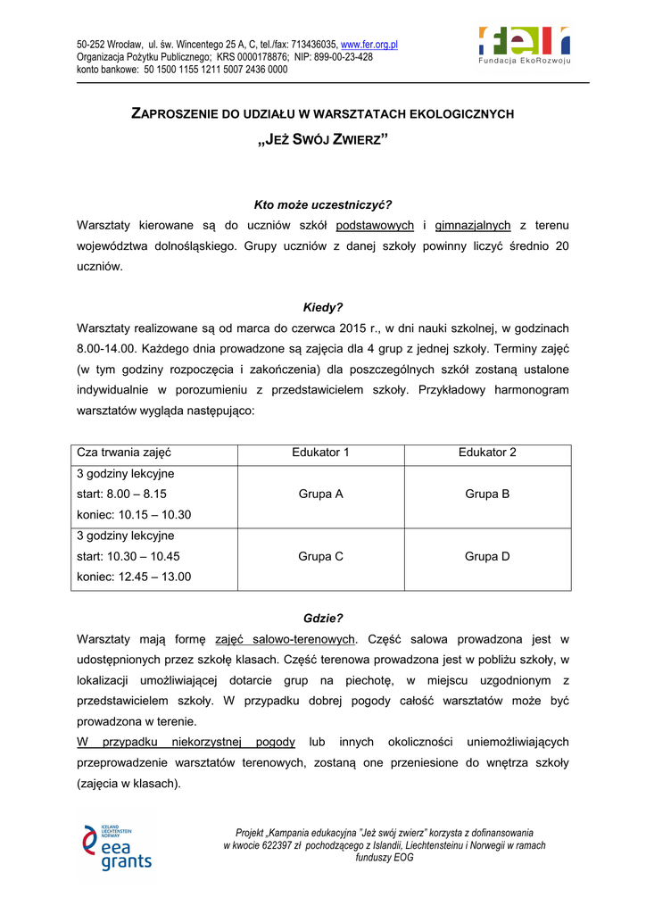 50-252 Wrocław, ul. św. Wincentego 25 A, C, tel./fax: 713436035, www.fer.org.pl Organizacja Pożytku Publicznego; KRS 0000178876; NIP: 899-00-23-428 konto bankowe: 50 1500 1155 1211 5007 2436 0000 ZAPROSZENIE DO UDZIAŁU W WARSZTATACH EKOLOGICZNYCH „JEŻ SWÓJ ZWIERZ” Kto może uczestniczyć? Warsztaty kierowane są do uczniów szkół podstawowych i gimnazjalnych z terenu województwa dolnośląskiego. Grupy uczniów z danej szkoły powinny liczyć średnio 20 uczniów. Kiedy? Warsztaty realizowane są od marca do czerwca 2015 r., w dni nauki szkolnej, w godzinach 8.00-14.00. Każdego dnia prowadzone są zajęcia dla 4 grup z jednej szkoły. Terminy zajęć (w tym godziny rozpoczęcia i zakończenia) dla poszczególnych szkół zostaną ustalone indywidualnie w porozumieniu z przedstawicielem szkoły. Przykładowy harmonogram warsztatów wygląda następująco: Cza trwania zajęć Edukator 1 Edukator 2 Grupa A Grupa B Grupa C Grupa D 3 godziny lekcyjne start: 8.00 – 8.15 koniec: 10.15 – 10.30 3 godziny lekcyjne start: 10.30 – 10.45 koniec: 12.45 – 13.00 Gdzie? Warsztaty mają formę zajęć salowo-terenowych. Część salowa prowadzona jest w udostępnionych przez szkołę klasach. Część terenowa prowadzona jest w pobliżu szkoły, w lokalizacji umożliwiającej dotarcie grup na piechotę, w miejscu uzgodnionym z przedstawicielem szkoły. W przypadku dobrej pogody całość warsztatów może być prowadzona w terenie. W przypadku niekorzystnej pogody lub innych okoliczności uniemożliwiających przeprowadzenie warsztatów terenowych, zostaną one przeniesione do wnętrza szkoły (zajęcia w klasach). Projekt „Kampania edukacyjna ”Jeż swój zwierz” korzysta z dofinansowania w kwocie 622397 zł pochodzącego z Islandii, Liechtensteinu i Norwegii w ramach funduszy EOG Tematyka Motywem przewodnim warsztatów są jeże i to ich poznawaniu poświęcona będzie część zajęć. Dodatkowo podczas warsztatów omówione będą inne tematy związane z gatunkami występującymi w sąsiedztwie człowieka. Szczegółowy przebieg zajęć może zostać dostosowany do potrzeb poszczególnych grup. Przykładowe tematy, jakie poruszane będą podczas warsztatów, to: • biologia i ekologia jeży (tryb życia, pokarm, występowanie, zagrożenia), • przykłady innych gatunków występujących w otoczeniu człowieka (prezentacja wybranych grup organizmów, np. ssaki typowe dla miast lub terenów pozamiejskich, pospolite gatunki ptaków, herpetofauna itp.), • znaczenie przyrody w życiu człowieka, ze szczególnym uwzględnieniem natury w bezpośrednim otoczeniu człowieka, • sposoby ochrony przyrody, • sposoby pomocy dzikim zwierzętom. Zajęcia prowadzone będą w sposób angażujący uczniów do samodzielnej pracy, dostosowany do wieku uczestników. Koszty Zajęcia są nieodpłatne dla uczestników, organizator we własnym zakresie zapewnia wszelkie sprzęty i materiały potrzebne podczas warsztatów. Edukatorzy Zajęcia prowadzone będą przez doświadczone edukatorki edukacji ekologicznej, współpracujące na co dzień z Fundacją EkoRozwoju: Monikę Szyrmer i Magdalenę Berezowską-Niedźwiedź. Nabór szkół Aby zgłosić chęć uczestnictwa w zajęciach należy wypełnić i podpisać formularz zgłoszeniowy (wzór poniżej), a następnie wysłać go lub dostarczyć osobiście na adres: Fundacja EkoRozwoju ul. św. Wincentego 25 a, c 50-252 Wrocław fax. nr 71 / 343-60-35 e-mai (skan zgłoszenia): [email protected] Przewidujemy przyjęcie 160 grup uczniów z 40 szkół. O przyjęciu decyduje kolejność zgłoszeń. Rekrutacja jest prowadzona do wyczerpania miejsc. 2 Szkoły przyjęte na warsztaty zostaną o tym powiadomione droga elektroniczną lub telefoniczną. Obowiązki szkoły • Każda szkoła zobowiązana jest skierować na warsztaty 4 grupy uczniów, liczące średnio nie mniej niż 20 osób. W dniu realizacji zajęć opiekun grupy przekaże edukatorom prowadzącym zajęcia listę obecności uczniów. • Za opiekę nad uczniami w trakcie warsztatów odpowiada szkoła, a każdej grupie towarzyszyć musi min. 1 opiekun. Organizator warsztatów nie zapewnia ubezpieczenia ani posiłku podczas zajęć. • Każda szkoła wyznaczy osobę (nauczyciela bądź innego pracownika) odpowiedzialną za kontaktowanie się z organizatorem, pomagającą w ustaleniu terminu zajęć, informującą o wszelkich zmianach itp. • W przypadku nagłego braku możliwości uczestnictwa w warsztatach jednej z grup, szkoła wyznaczy inną grupę o takiej samej lub większej liczbie uczniów (w każdym przypadku szkoła wyznacza 4 grupy na zajęcia w danym dniu). Więcej informacji uzyskać można kontaktując się z Moniką Szyrmer lub Magdaleną Berezowską-Niedźwiedź. - drogą elektroniczną na adres [email protected] - drogą telefoniczną, numer 71 / 343-60-35 Zapraszamy na warsztaty i życzymy niezapomnianych wrażeń! swój zwierz kampania edukacyjna 3 FORMULARZ ZGŁOSZENIA uczestnictwa szkoły w warsztatach edukacyjnych „Jeż swój zwierz” rekrutacja trwa do wyczerpania miejsc, decyduje kolejność zgłoszeń Uwaga: • • • • • • • • • • • • • • • • • • zajęcia przeznaczone są dla uczniów szkół podstawowych i gimnazjalnych w zajęciach mogą brać udział klasy lub grupy uczniów z różnych klas (np. szkolne koła zainteresowań, klasy łączone itp.) każda szkoła zgłasza 4 grupy uczniów do odbycia zajęć w jednym, wybranym dniu liczebność grup uczestniczących w zajęciach powinna wynieść przeciętnie min. 20 osób (tj. nie mniej niż 80 uczniów ze szkoły). Wskazane jest, by liczebność grup nie przekraczała 30 uczniów zgłoszenia grup dokonać może nauczyciel lub inny pracownik szkoły wypełnione zgłoszenia należy przesłać faxem na numer 071 / 343-60-35 lub pocztą albo osobiście na adres: Fundacja EkoRozwoju, ul. św. Wincentego 25 a, c, 50-252 Wrocław lub drogą elektroniczną (skan zgłoszenia) na adres [