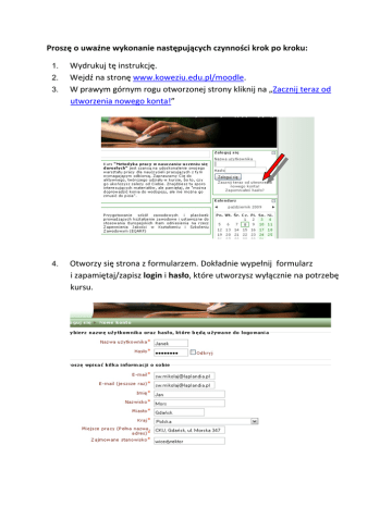 Proszę o uważne wykonanie następujących czynności krok po kroku: 1. 2. 3. Wydrukuj tę instrukcję. Wejdź na stronę www.koweziu.edu.pl/moodle. W prawym górnym rogu otworzonej strony kliknij na „Zacznij teraz od utworzenia nowego konta!” 4. Otworzy się strona z formularzem. Dokładnie wypełnij formularz i zapamiętaj/zapisz login i hasło, które utworzysz wyłącznie na potrzebę kursu. 5. Kliknij na zakładkę „Utwórz moje nowe konto” (napis ten znajduje się na końcu formularza). 6. 7. 8. 9. 10. Przeczytaj uważnie komunikat i postąp zgodnie ze wskazówkami w nim zawartymi. Otwórz swoją pocztę mailową podaną w formularzu. Kliknij na link, otrzymany w wiadomości od Administratora. Znajdziesz się na stronie KOWEZiU z ofertami kursów i innych form szkoleniowych. Wybierz odpowiednią zakładkę z interesującym Cię kursem.