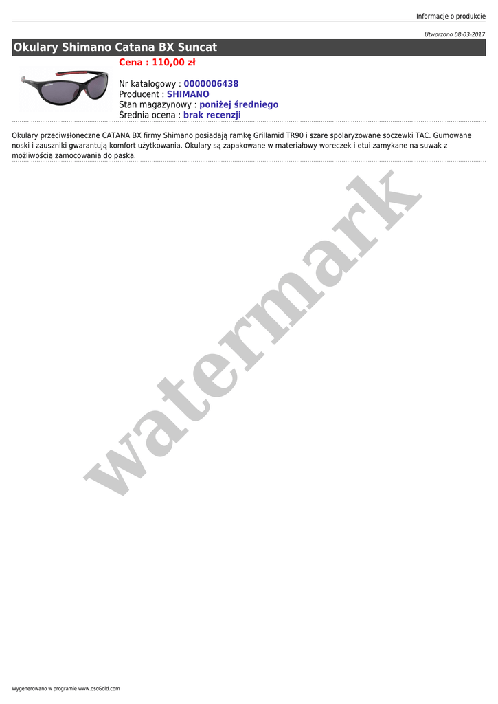 Informacje o produkcie Utworzono 08-03-2017 Okulary Shimano Catana BX Suncat Cena : 110,00 zł Nr katalogowy : 0000006438 Producent : SHIMANO Stan magazynowy : poniżej średniego Średnia ocena : brak recenzji w at er m ar k Okulary przeciwsłoneczne CATANA BX firmy Shimano posiadają ramkę Grillamid TR90 i szare spolaryzowane soczewki TAC. Gumowane noski i zauszniki gwarantują komfort użytkowania. Okulary są zapakowane w materiałowy woreczek i etui zamykane na suwak z możliwością zamocowania do paska. Wygenerowano w programie www.oscGold.com